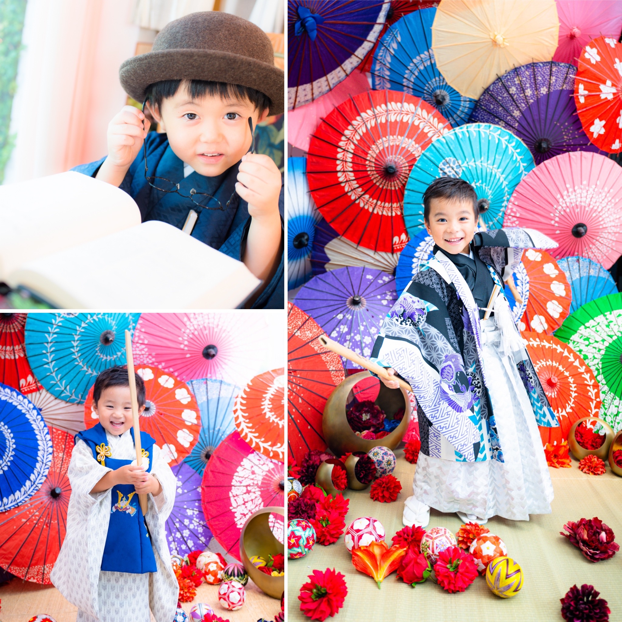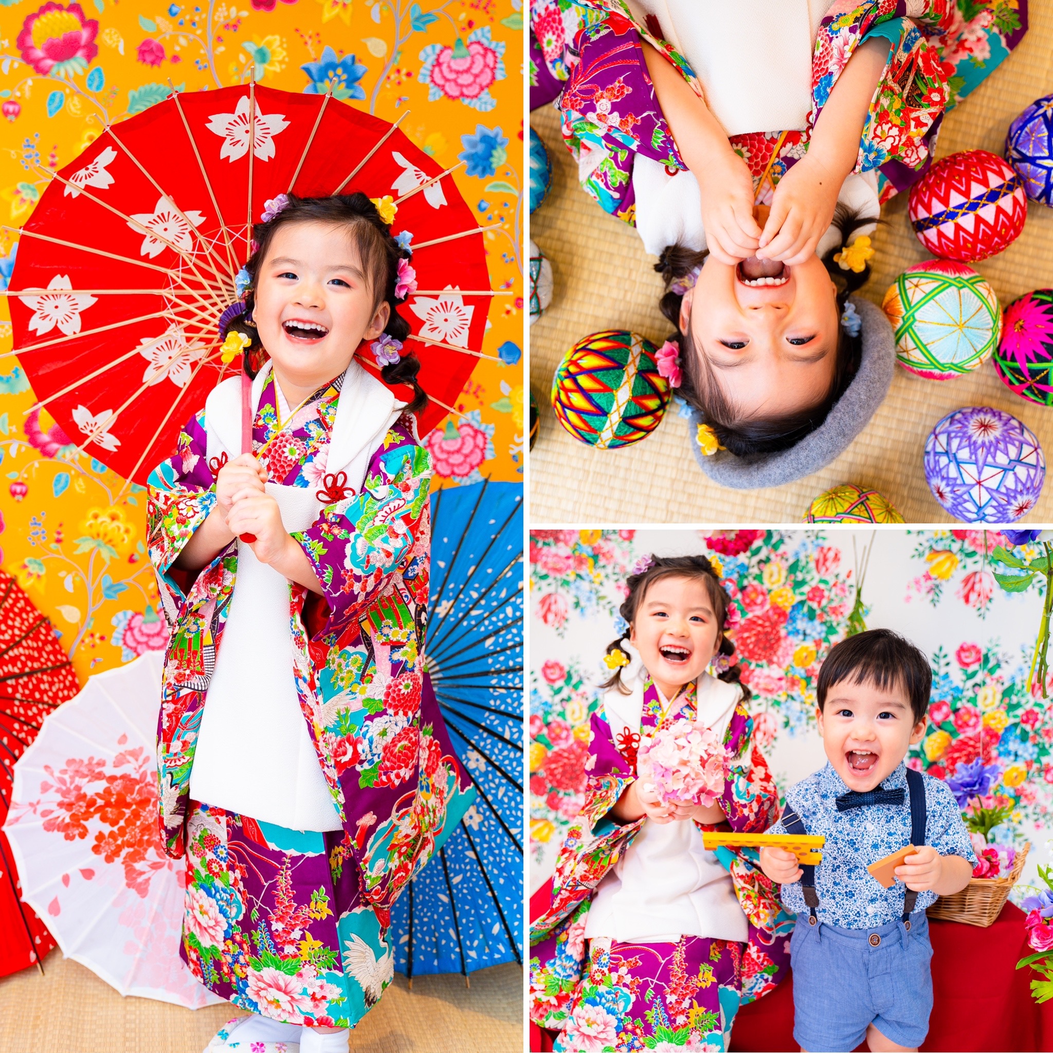 七五三のお子様は年齢的にも全撮影時間対応が可能ですが、お腹が空いちゃった、眠くなっちゃったは起こり得るので、お子様に合わせて予約時間をお選びください。スタジオでおにぎりを食べる。などもありなので是非ご相談ください。