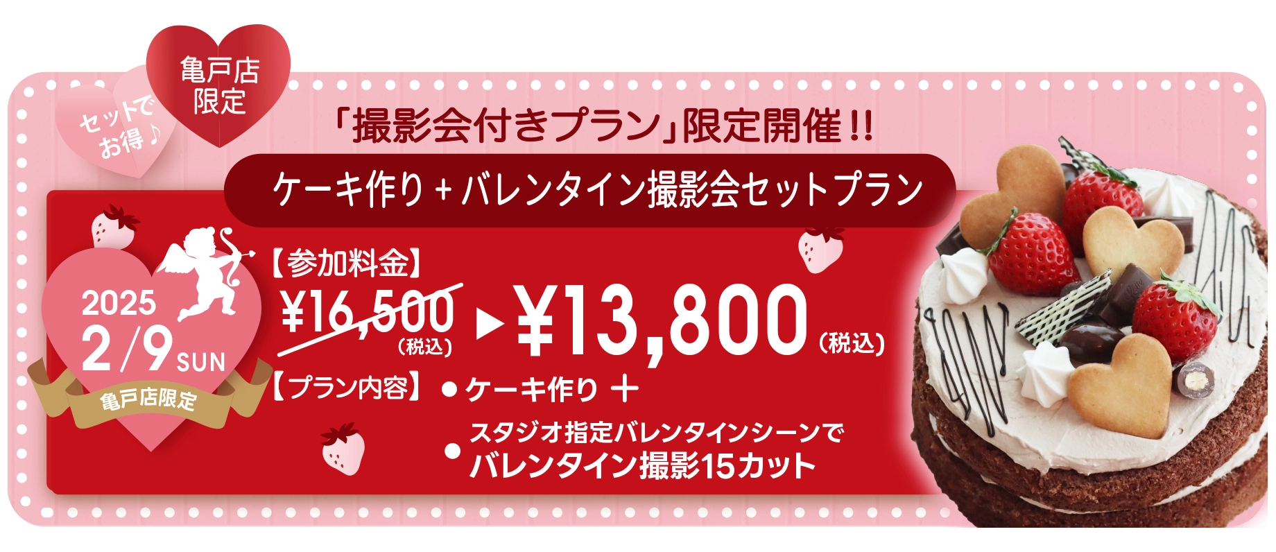 ※ケーキ作り体験は¥5,500 (税込)、バレンタイン撮影会(15カット)は休日¥11,000 (税込)でのご案内のため、別々でお申し込みされると¥16,500 (税込)のところ、¥2,700もお得!なプランです♪