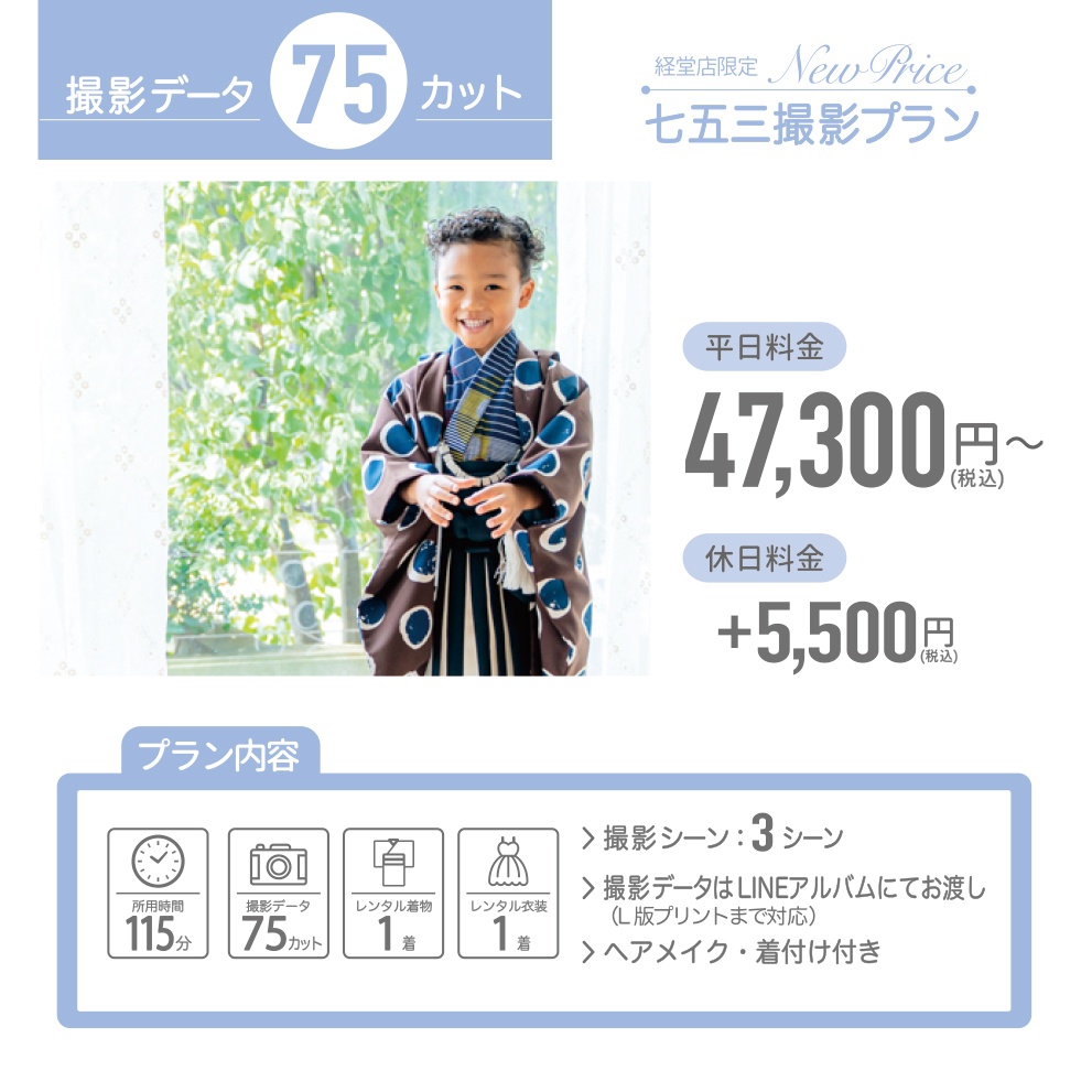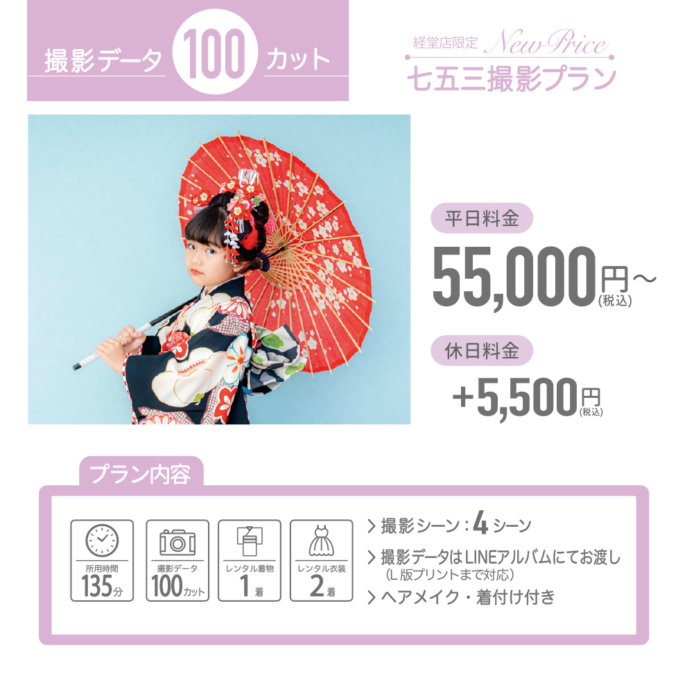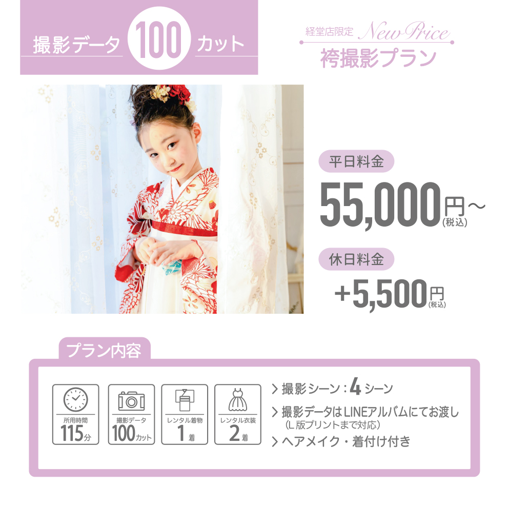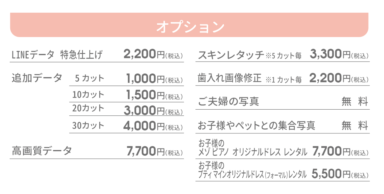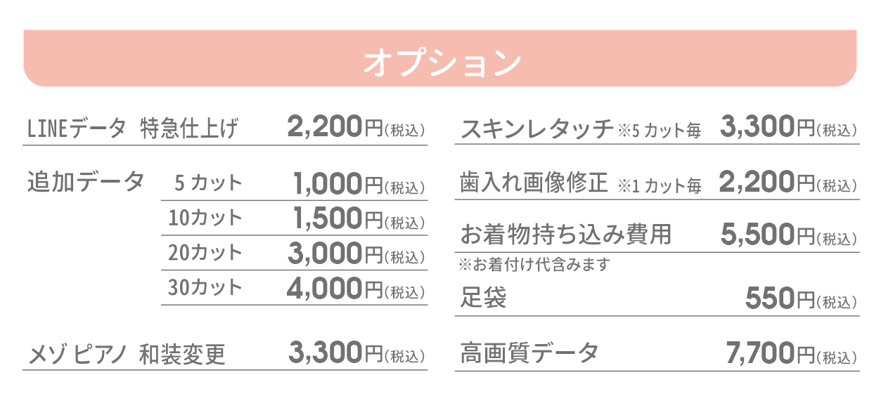 カスタマイズ撮影プランでは、洋装追加が可能です。オプション料金として税込3,300円頂戴いたします。