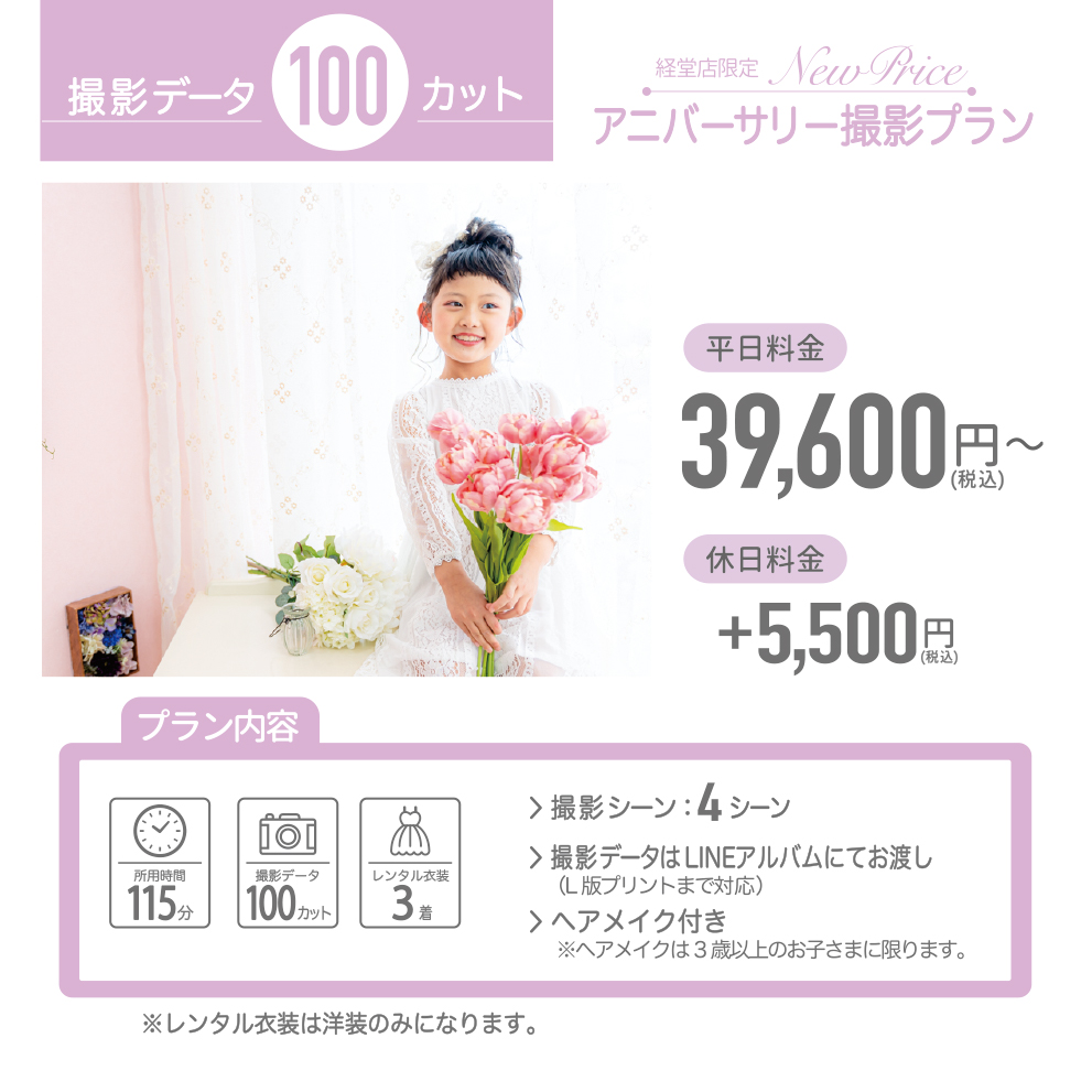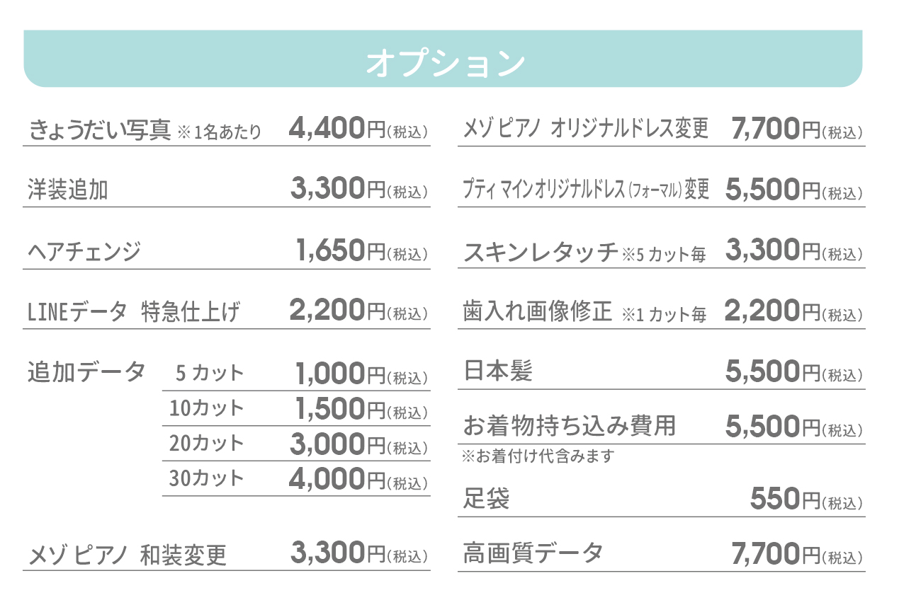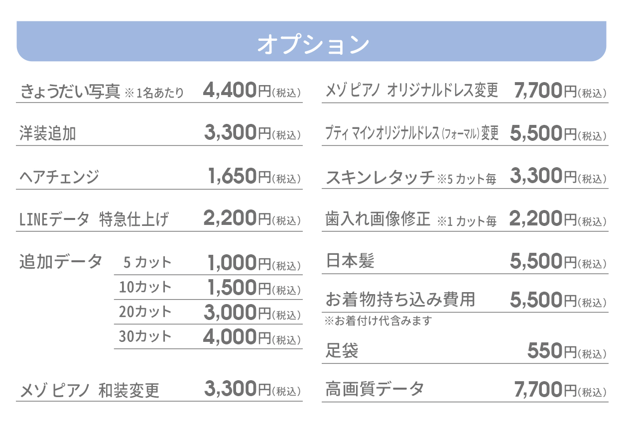 無料でレンタル可能です。但し、カスタマイズ撮影プランでは、オプション料金として、洋装1着をメゾピアノオリジナルドレスに変更する場合は税込7,700円、プティマインオリジナルドレス(フォーマル)に変更する場合は税込5,500円、和装をメゾピアノ着物に変更する場合は税込3,300円頂戴いたします。