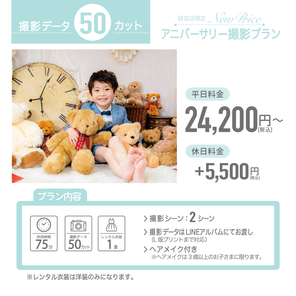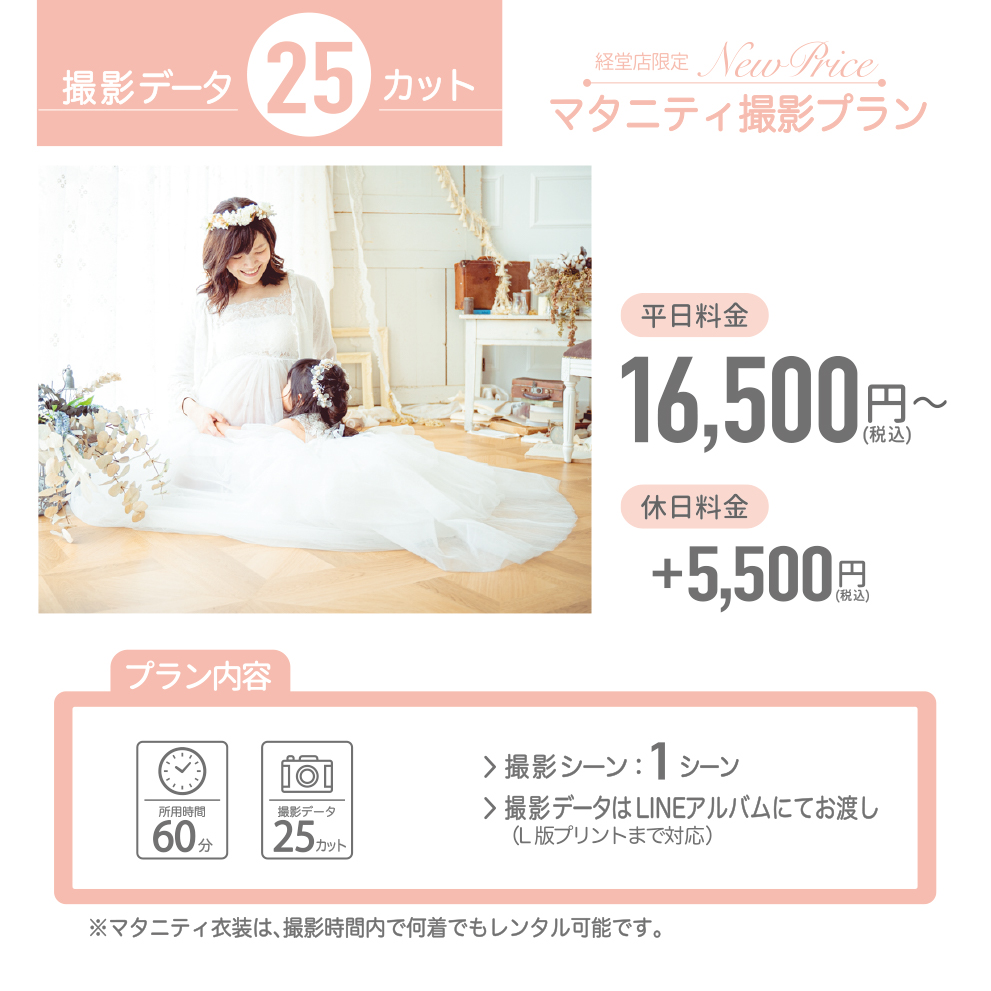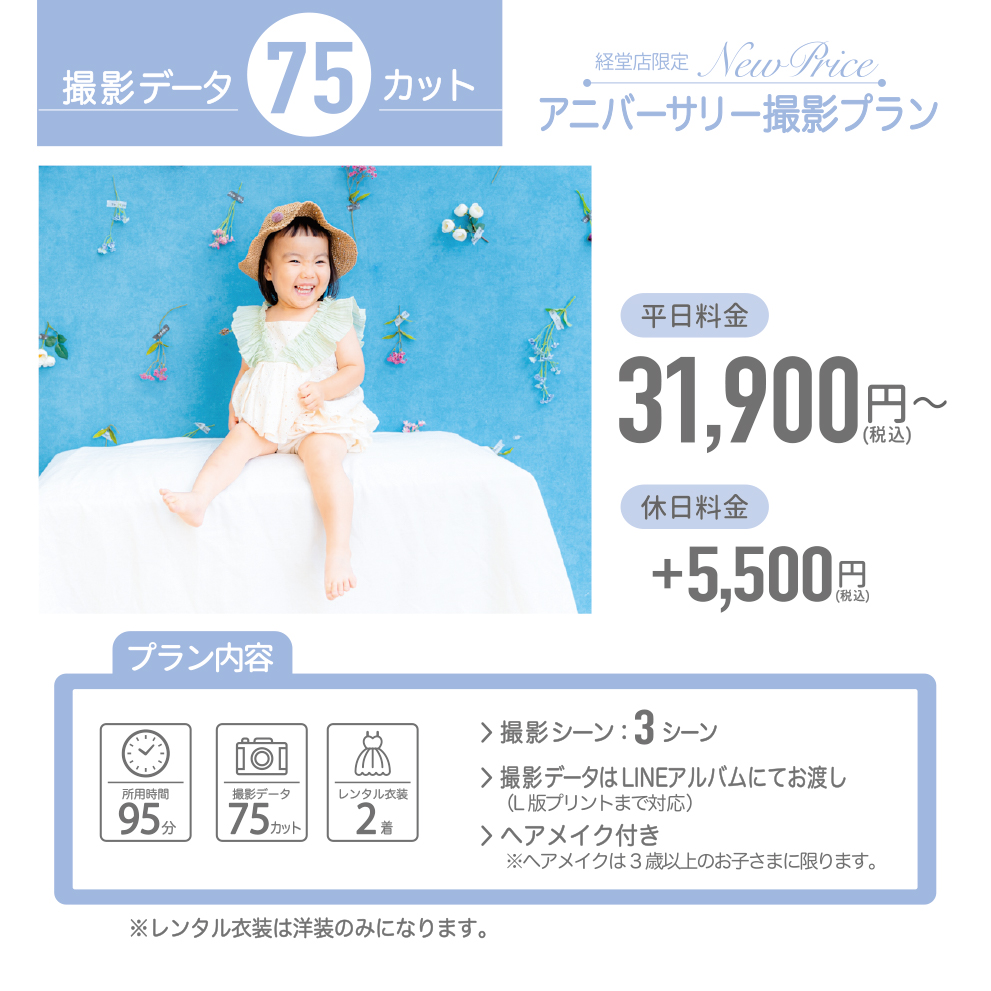 撮影可能です。カスタマイズ撮影プランでは、お子様の洋装も1着までレンタルいただくことができます。お子様の洋装1着をメゾピアノオリジナルドレスに変更する場合は税込7,700円、プティマインオリジナルドレス(フォーマル)に変更する場合は税込5,500円頂戴いたします。和装のレンタルはできません。お子様のソロ撮影を同枠で承ることができません。「マタニティ」とお子様撮影をそれぞれご予約ください。