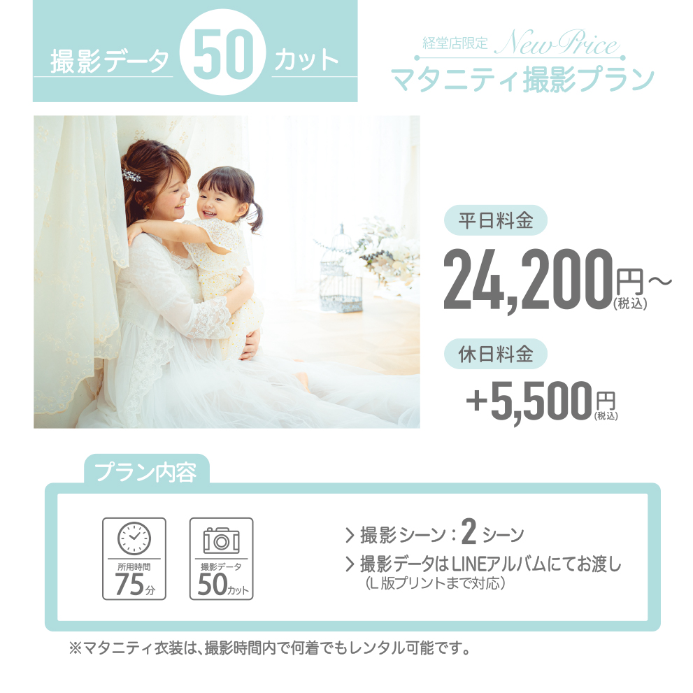 ※ママのみの写真・ご夫婦の写真・お子様やペットとの集合写真をすべてご希望の場合は、50カットプランをお選びください。