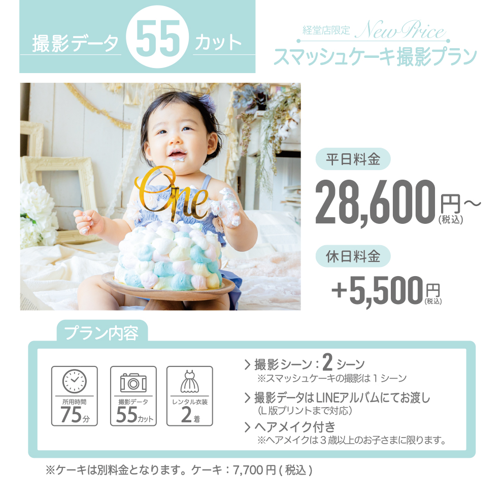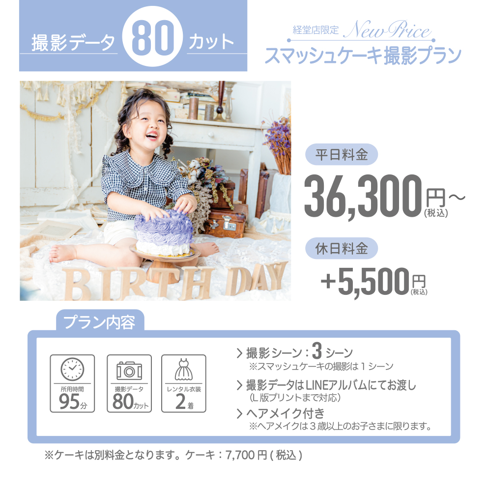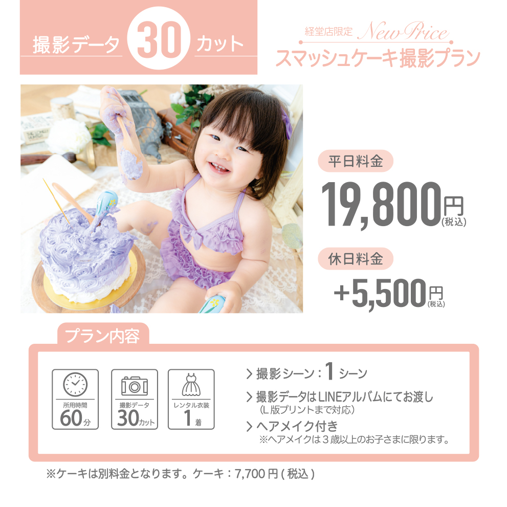 申し訳ございません。カスタマイズ撮影プランでは、お貸出しの場合でも、お持ち込みの場合でも、同枠での撮影はできません。「スマッシュケーキ」「バースデー」を別途ご予約ください。