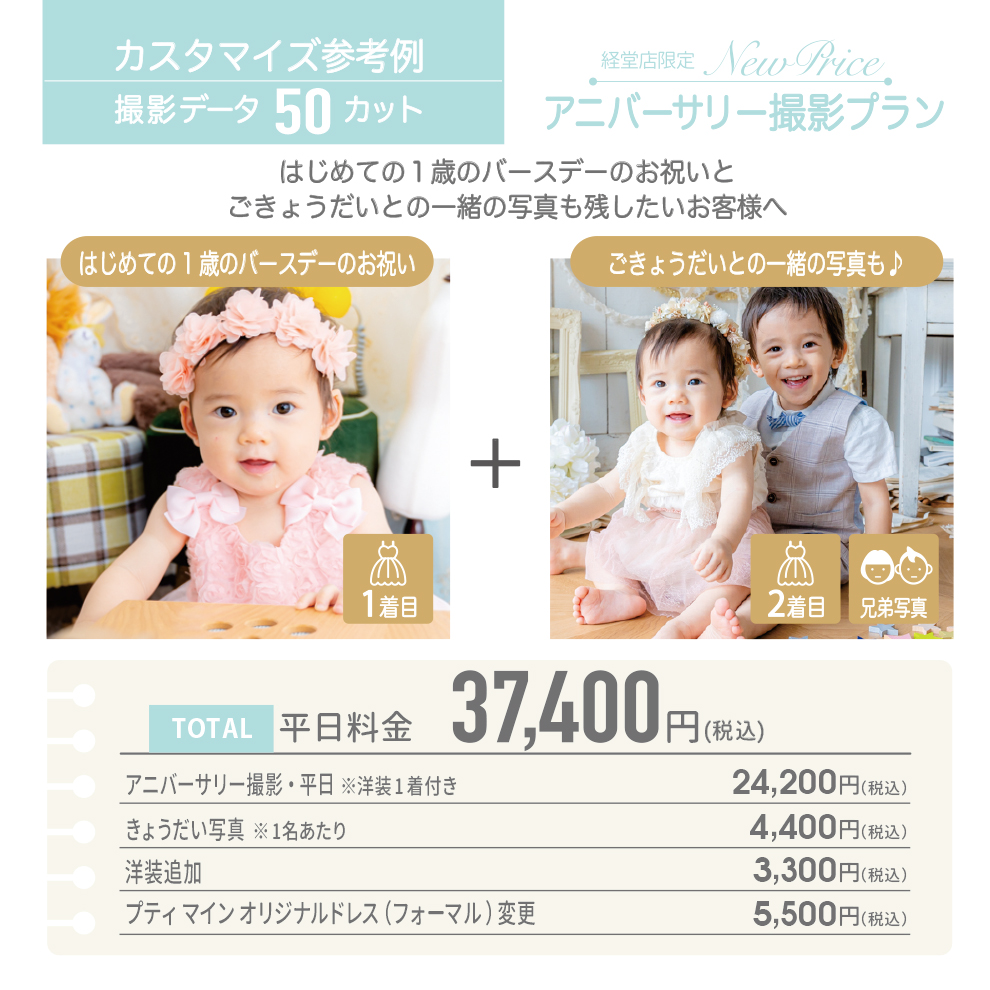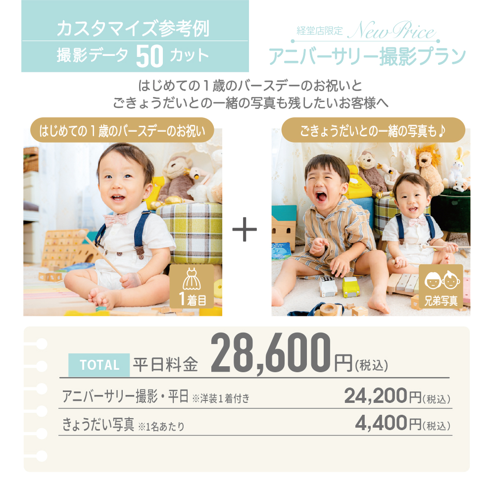 撮影可能です。カスタマイズ撮影プランでは、きょうだい写真のオプションを追加した場合、オプション料金としてご兄弟様1名につき税込4,400円頂戴いたします。