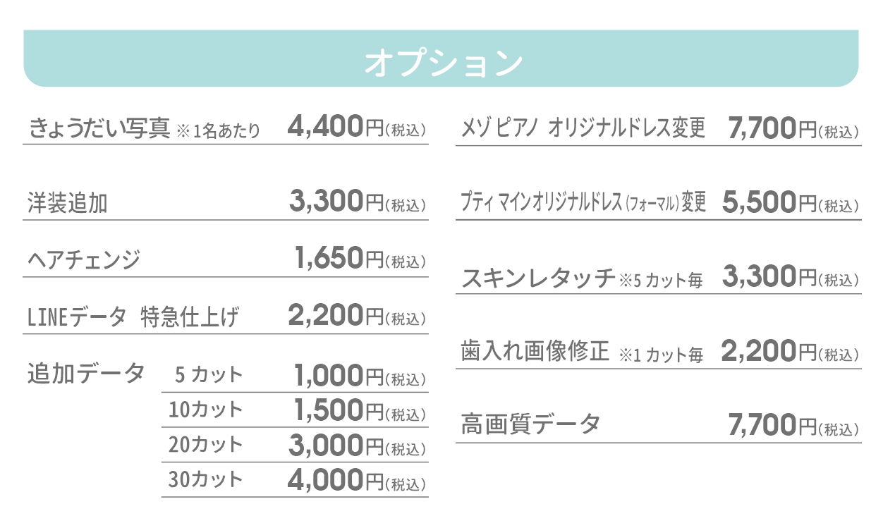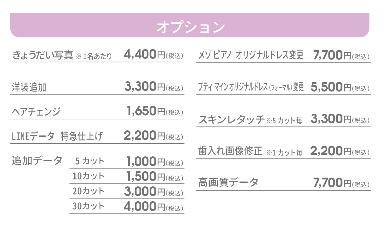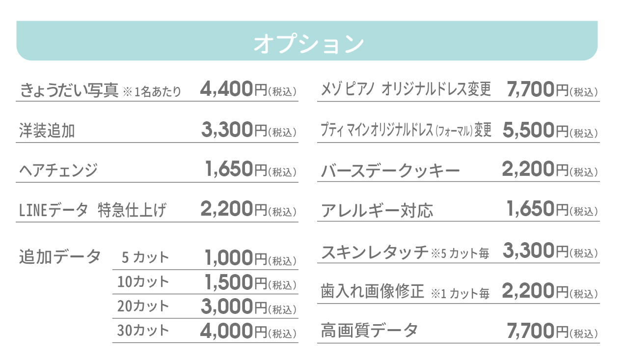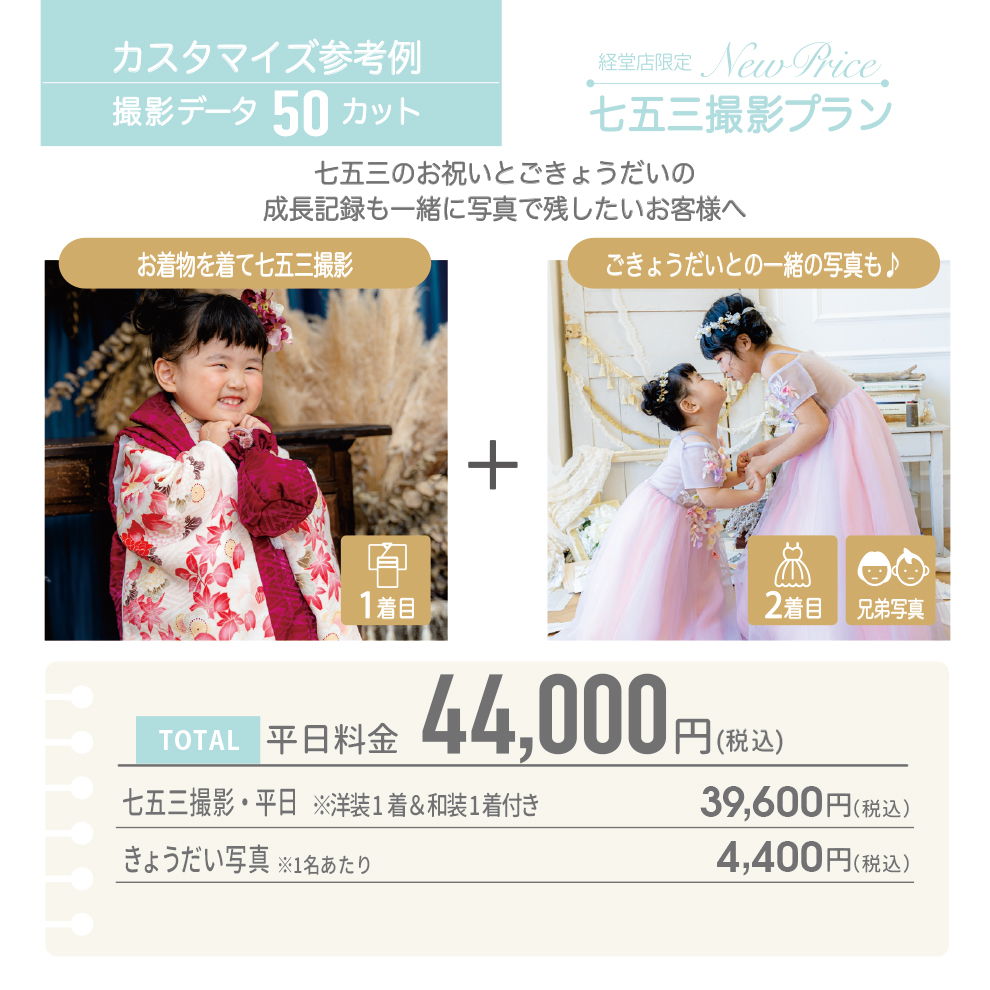 ※きょうだい写真オプションには、ご兄弟様の洋装・掛け着1着のレンタルと、簡単なヘアメイク(3歳以上対象)を含みます。その他和装やオリジナルドレス(フォーマル)は選択できません。