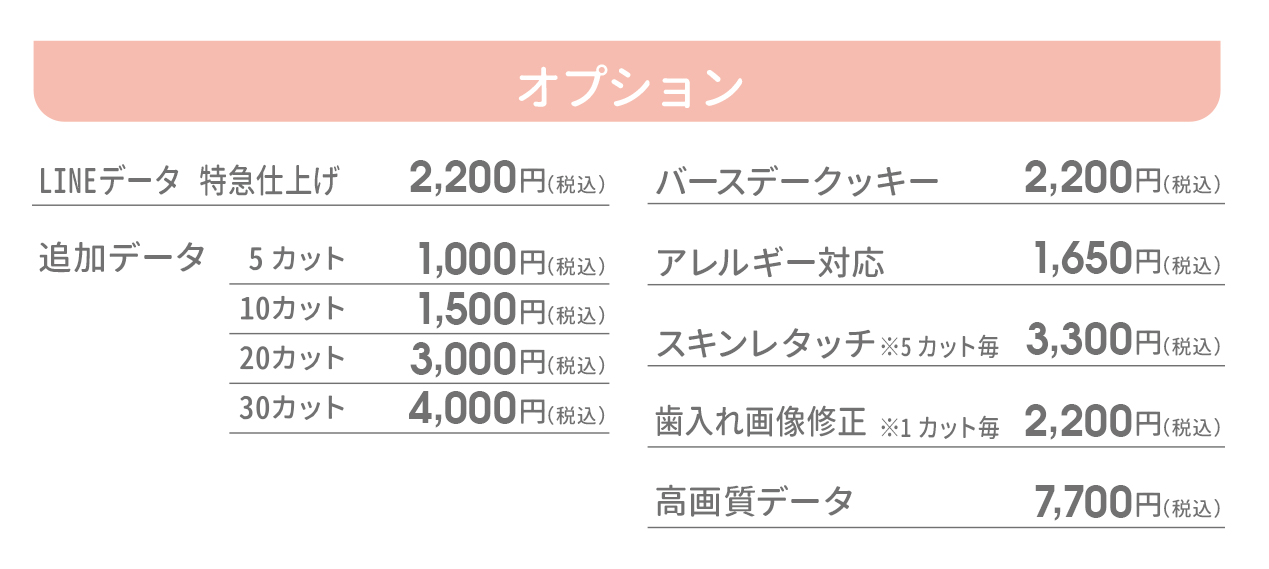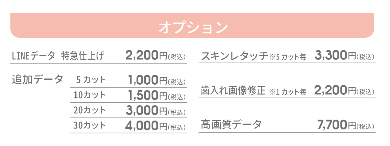 カスタマイズ撮影プランでは、スキンレタッチ(5カット税込3,300円)と歯入れ修正(1カット税込2,200円)が可能です。スキンレタッチは、ニキビ消し・シミ消し・シワ消し・肌荒れ修正・妊娠線消しをすることができます。歯入れ修正は、抜けた歯を入れる修正をすることができます。スキンレタッチ・歯入れ修正をご希望の場合、LINEデータのお渡しまで追加で3日頂戴いたします。また、LINEデータ特急仕上げとの併用はできません。詳細は店舗にご相談ください。