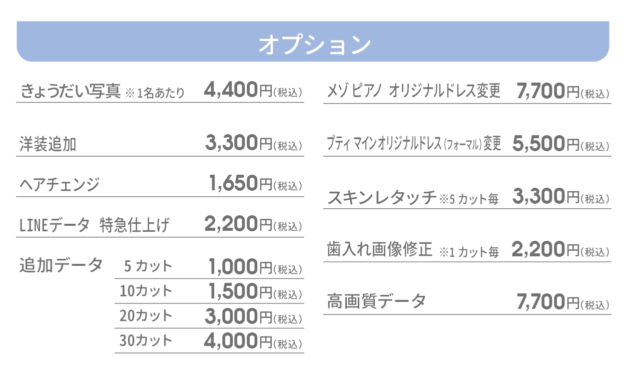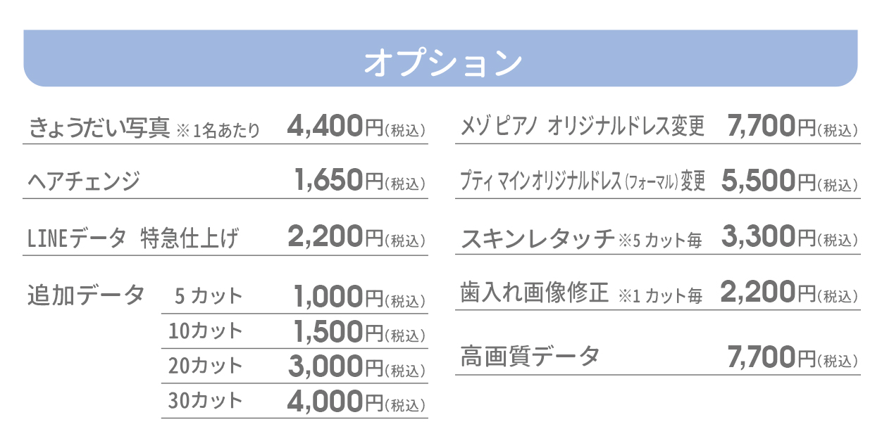 カスタマイズ撮影プランでは、きょうだい写真のオプションを追加することができます。オプション内容には、ご兄弟様の洋装・掛け着1着のレンタルと、簡単なヘアメイクを含みます。その他和装やオリジナルドレスのレンタルはできません。オプション料金としてご兄弟様1名につき税込4,400円頂戴いたします。