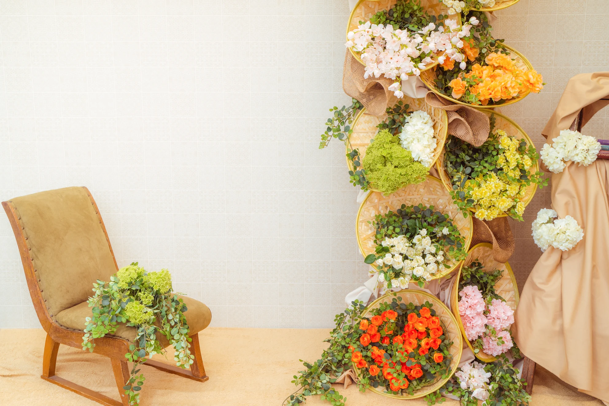 竹の花笠に咲き誇る色とりどりの花々は