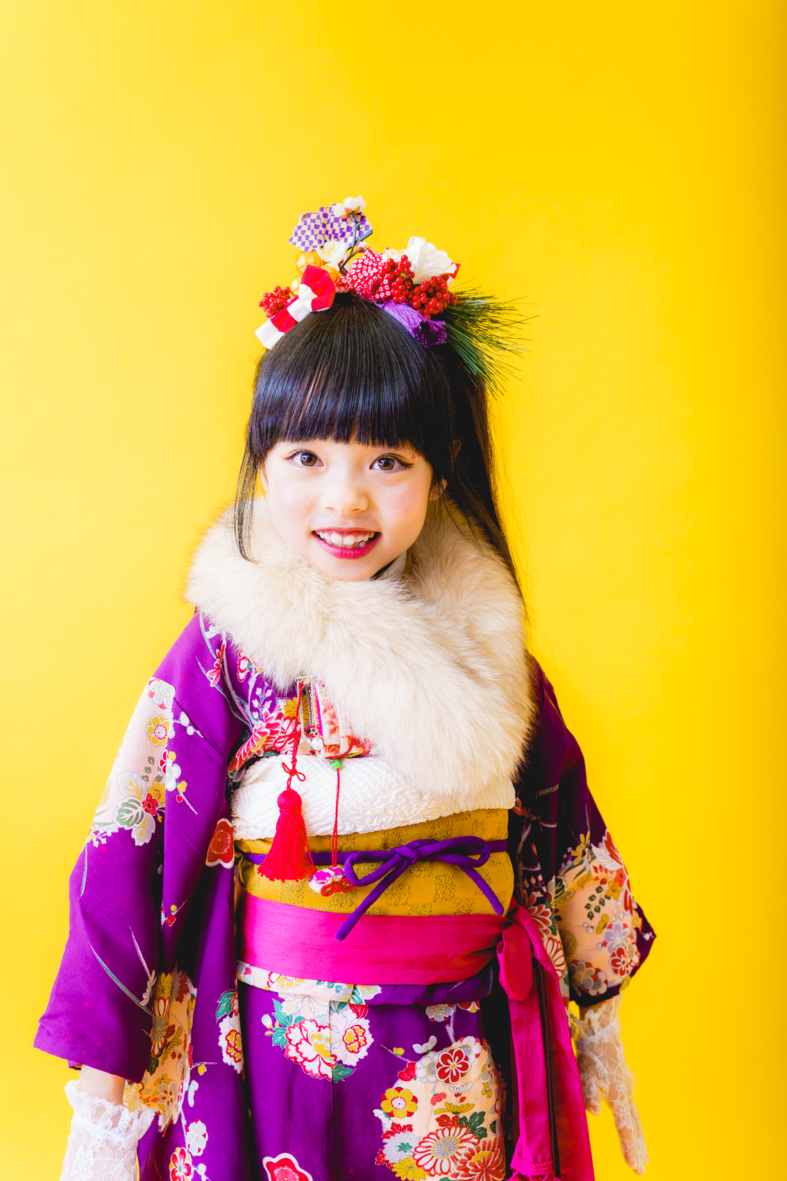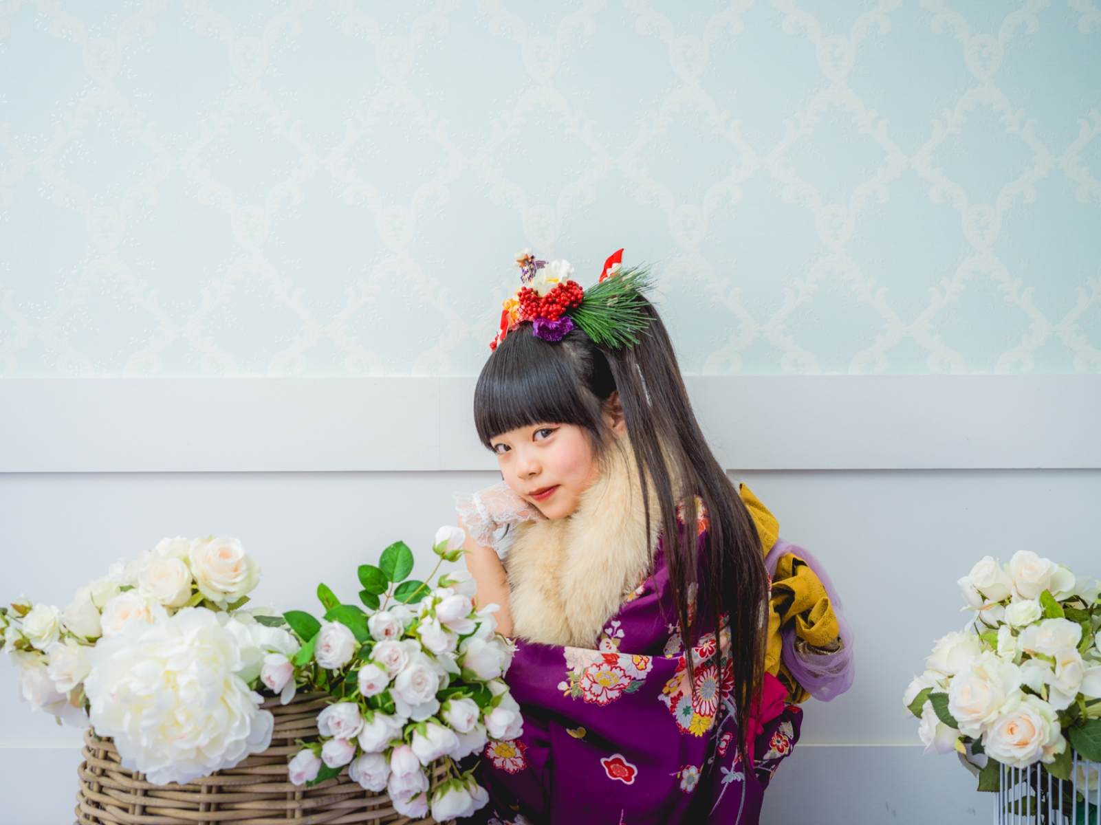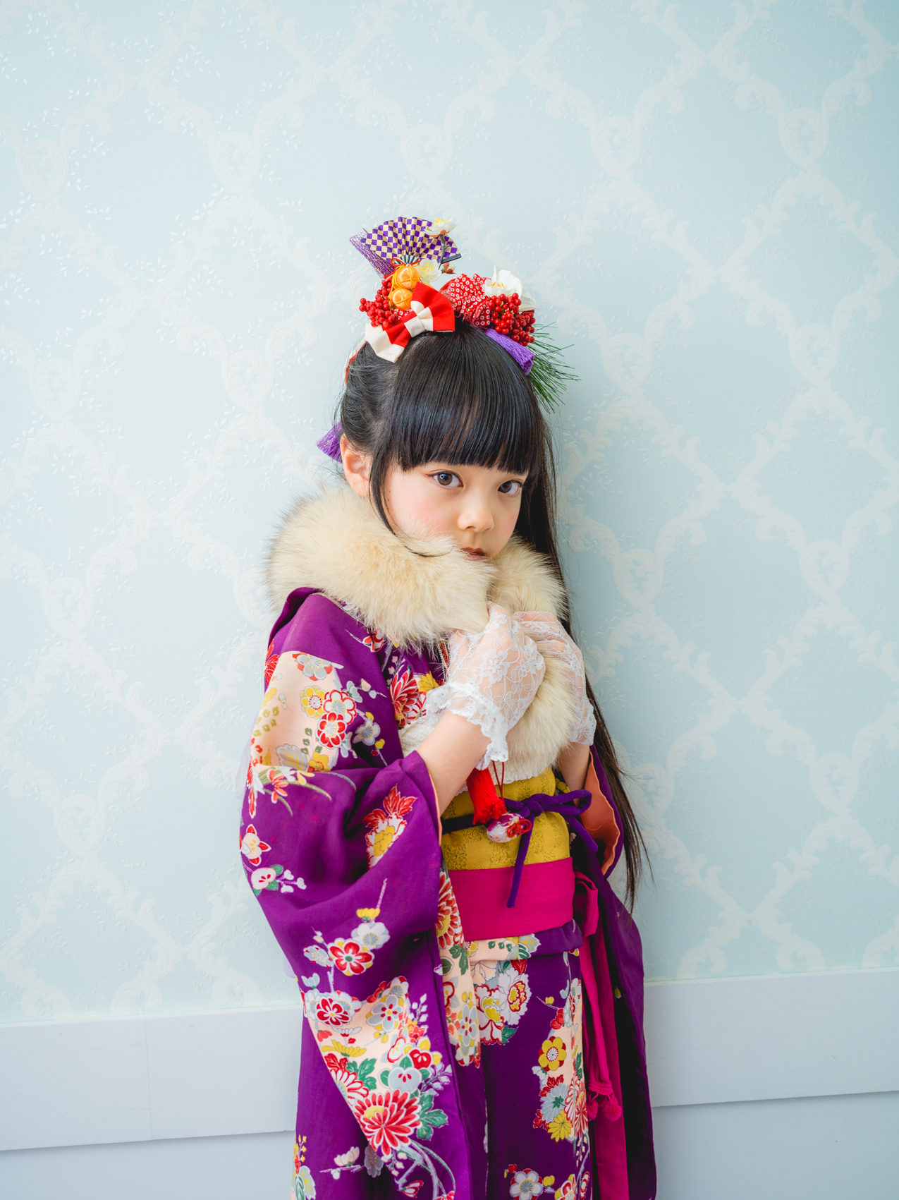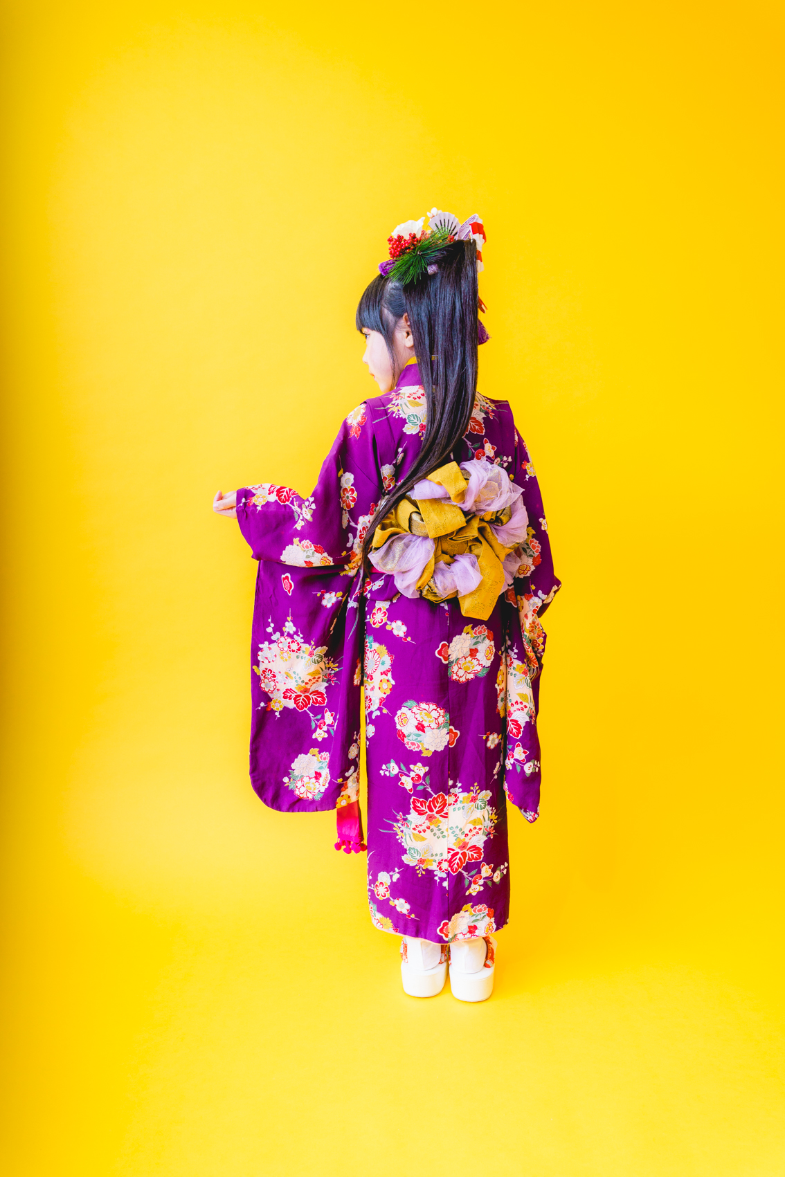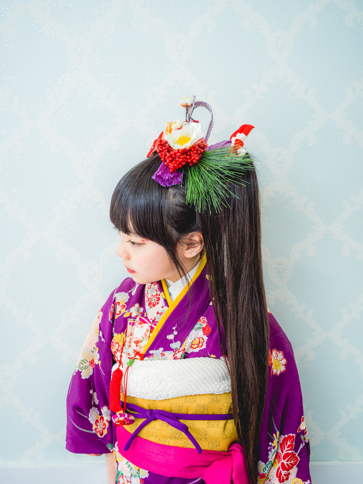 髪飾りには、「松」「万両」「水引」「稲」「鞠」「招き猫」などをあしらい、人と人を繋ぐ縁結びや、祝福、寿ぎ、過酷な環境でも育つ強い心を持って欲しい、などたくさんの想いを込め本撮影会に限り特別に作成しました。笑顔いっぱいの子供写真とは一味違う撮影をお届けします。