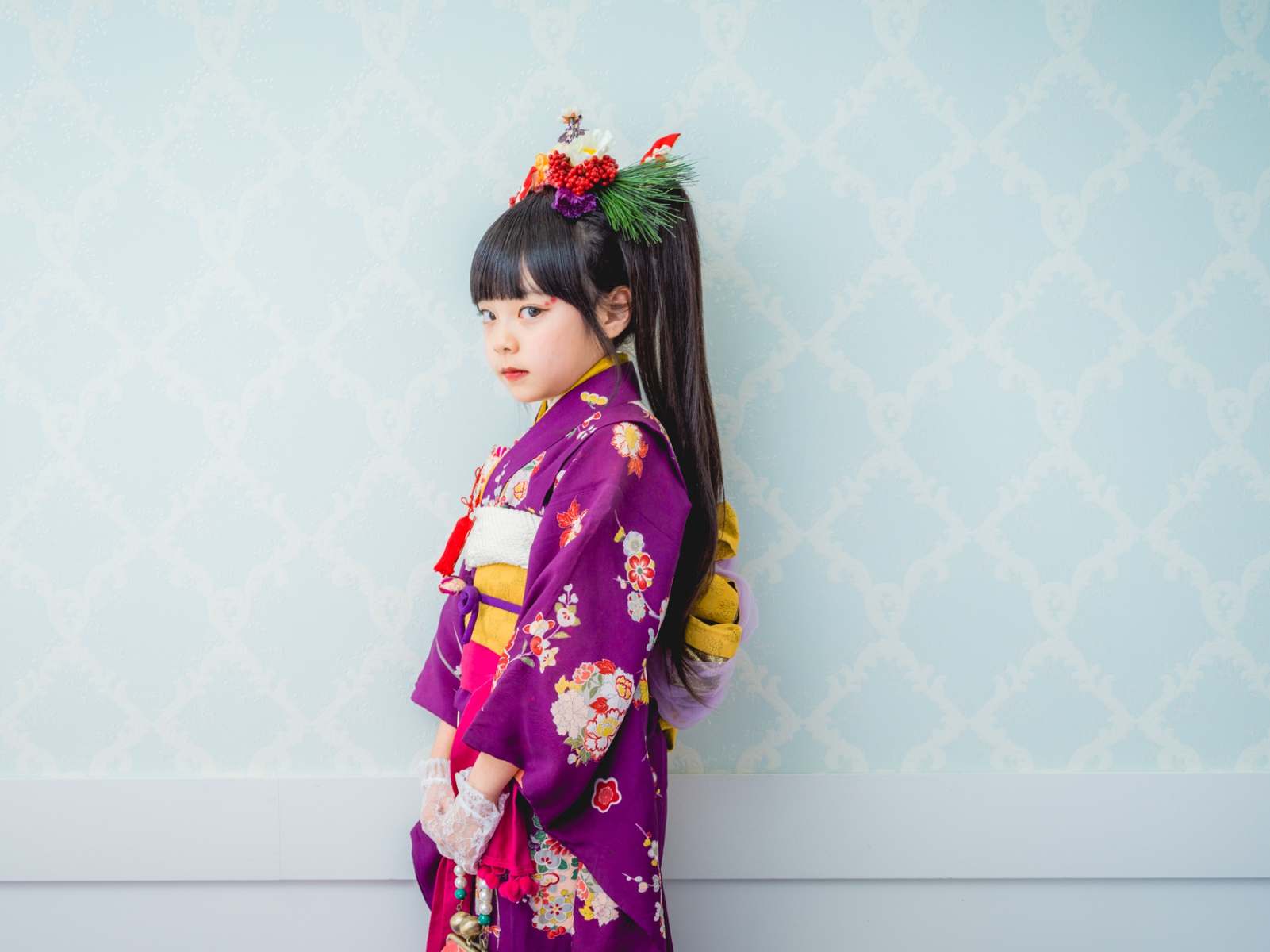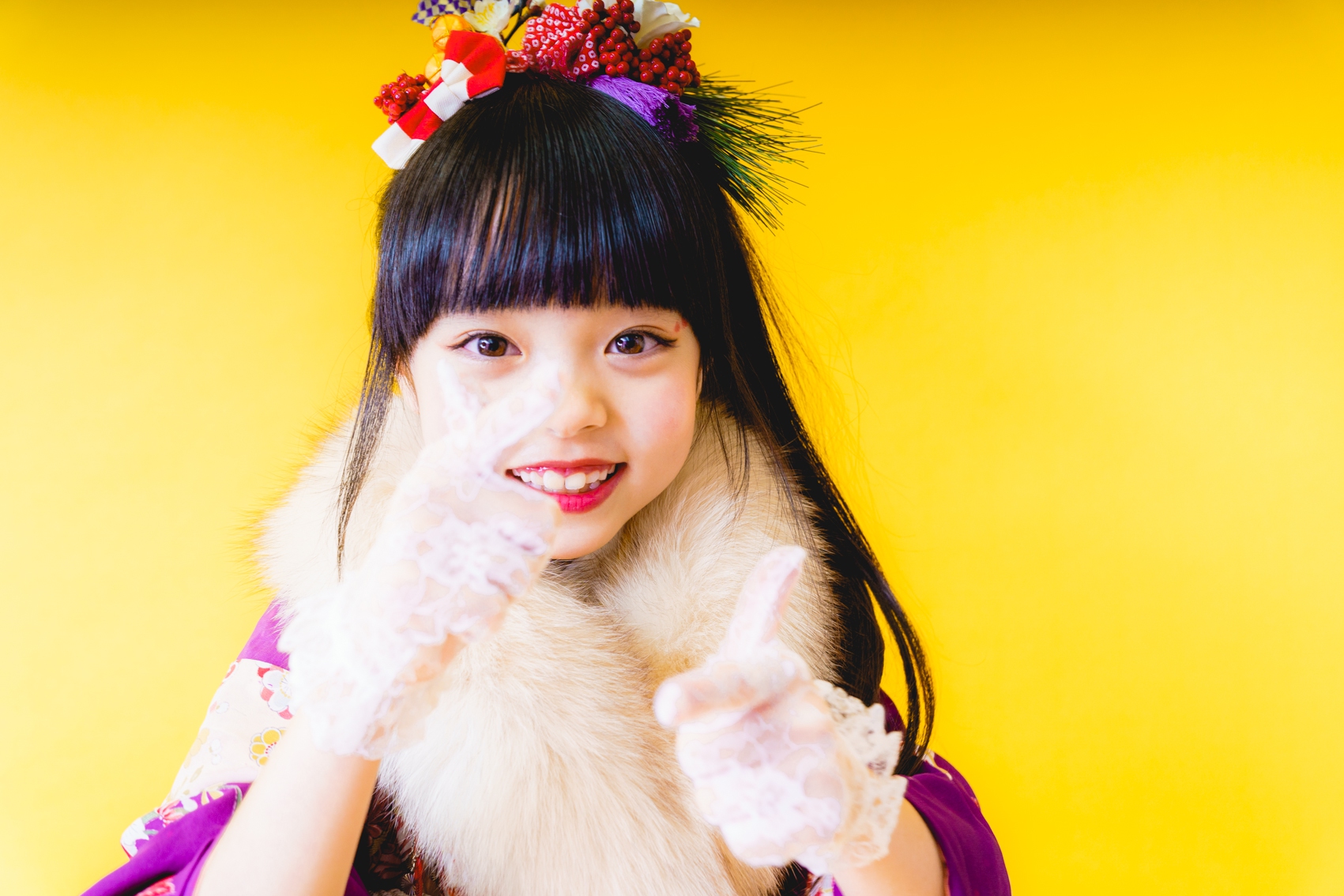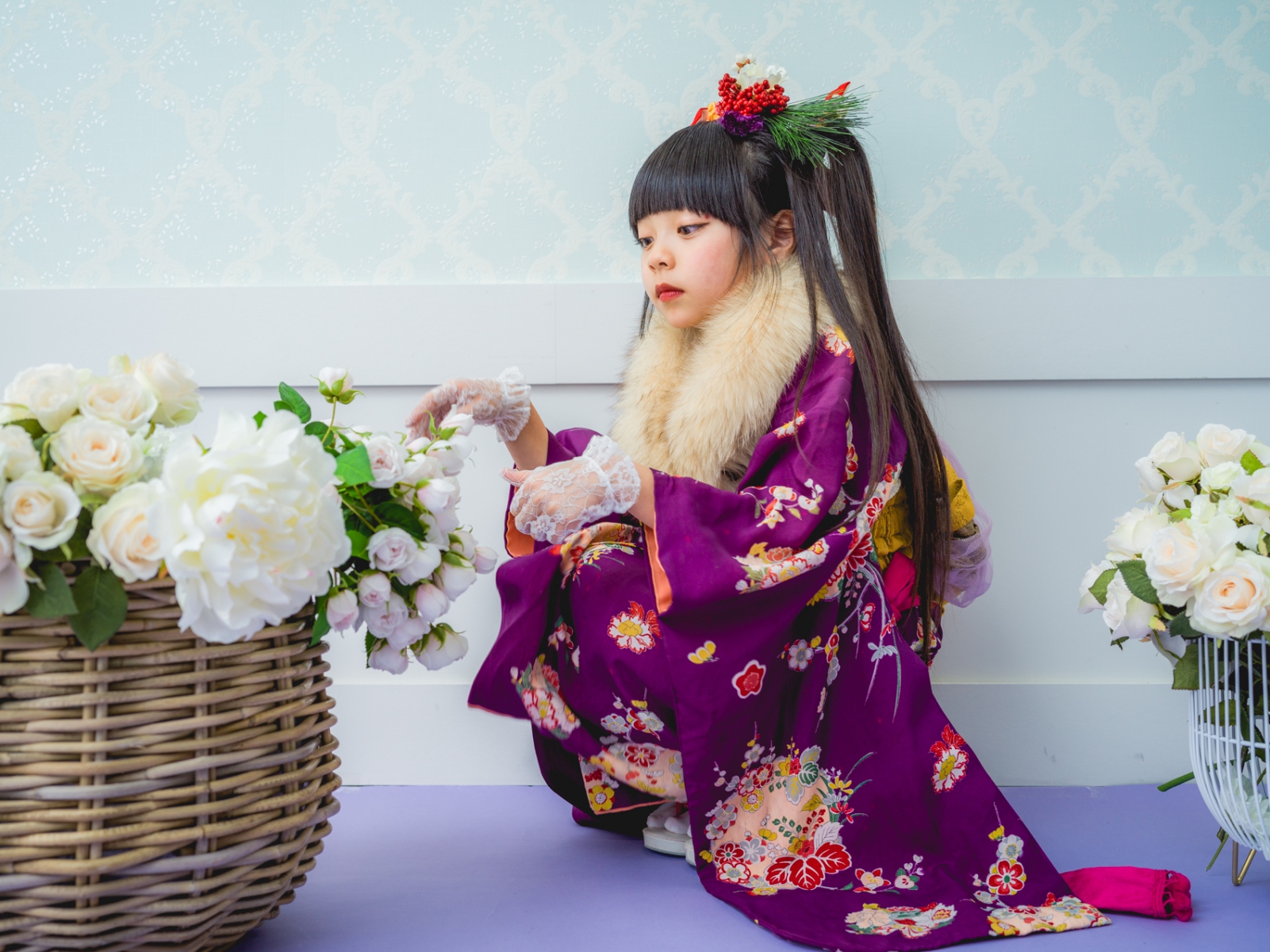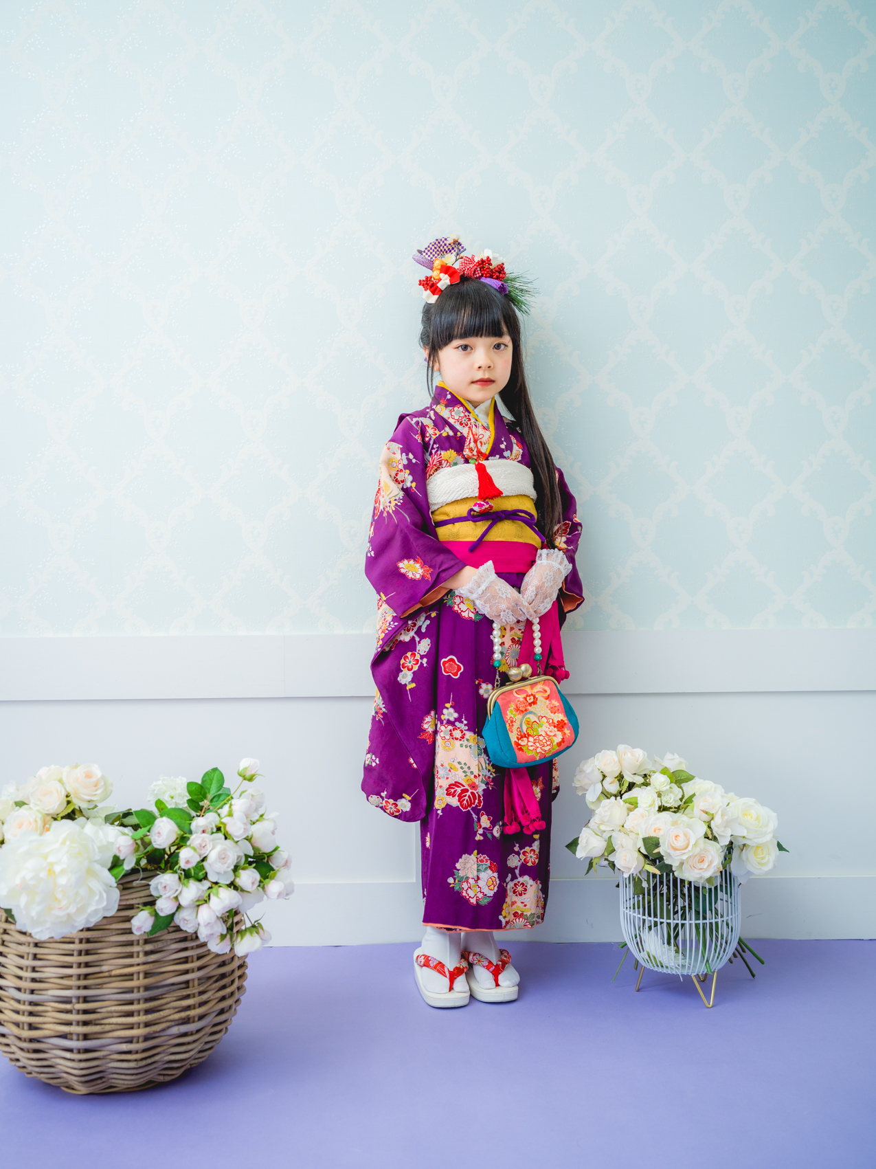 髪飾りには、「松」「万両」「水引」「稲」「鞠」「招き猫」などをあしらい、人と人を繋ぐ縁結びや、祝福、寿ぎ、過酷な環境でも育つ強い心を持って欲しい、などたくさんの想いを込め本撮影会に限り特別に作成しました。笑顔いっぱいの子供写真とは一味違う撮影をお届けします。