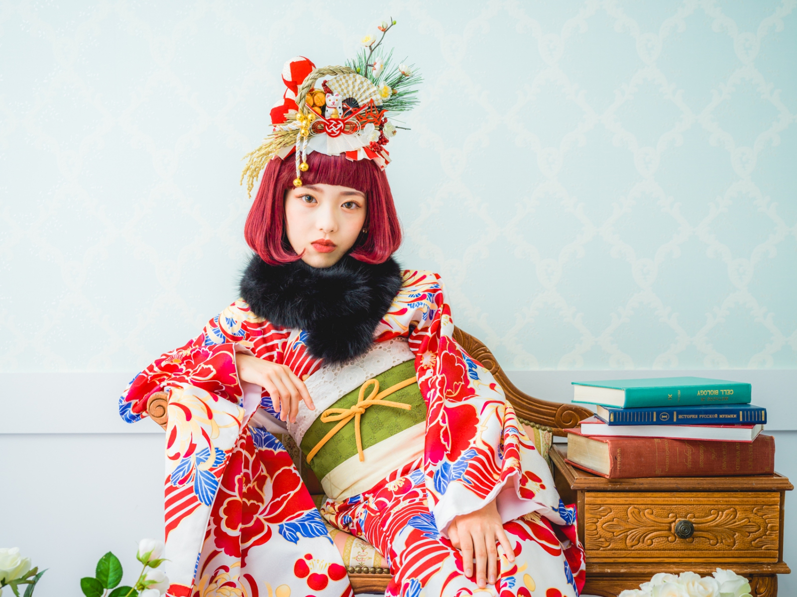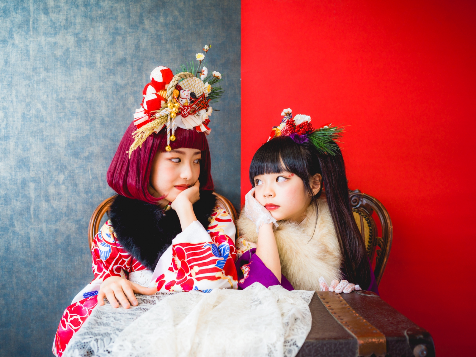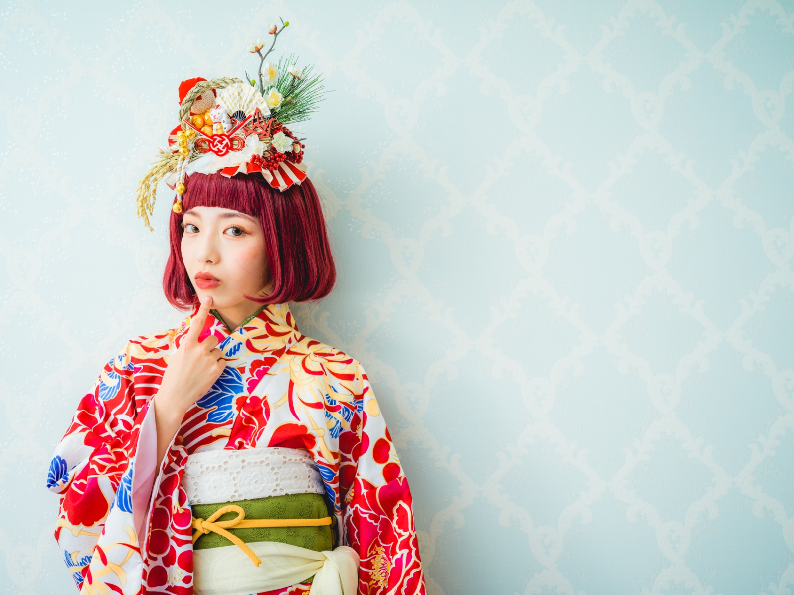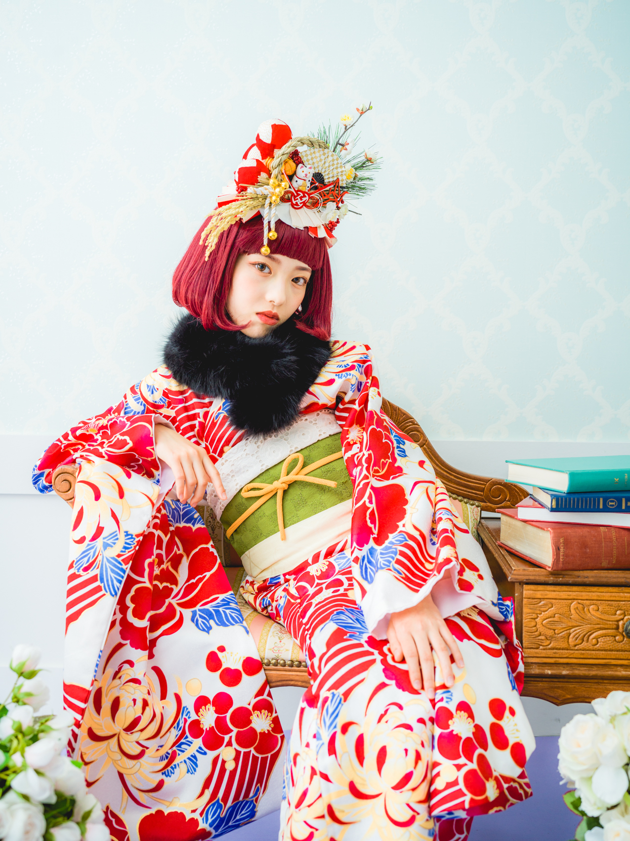 髪飾りには、「松」「万両」「水引」「稲」「鞠」「招き猫」などをあしらい、人と人を繋ぐ縁結びや、祝福、寿ぎ、過酷な環境でも育つ強い心を持って欲しい、などたくさんの想いを込め本撮影会に限り特別に作成しました。笑顔いっぱいの子供写真とは一味違う撮影をお届けします。