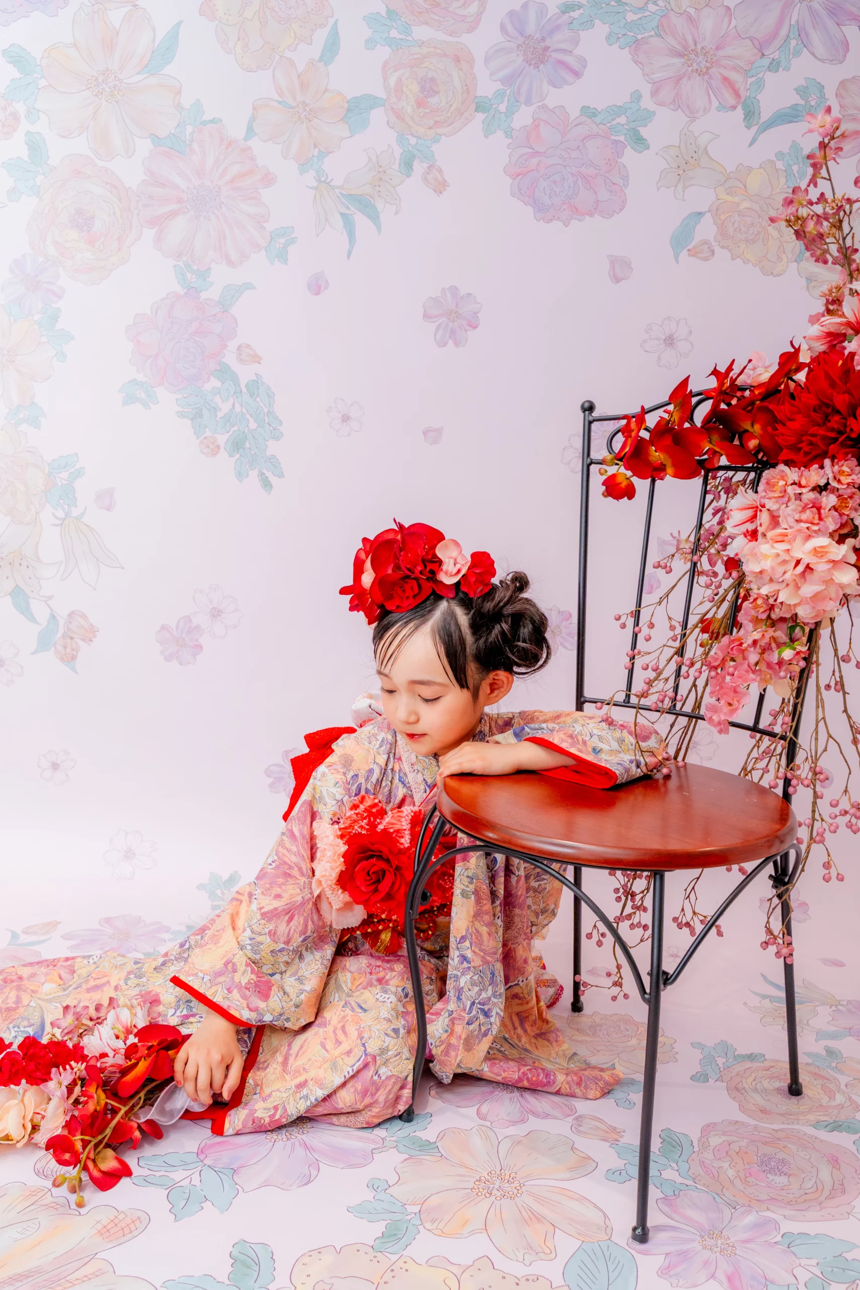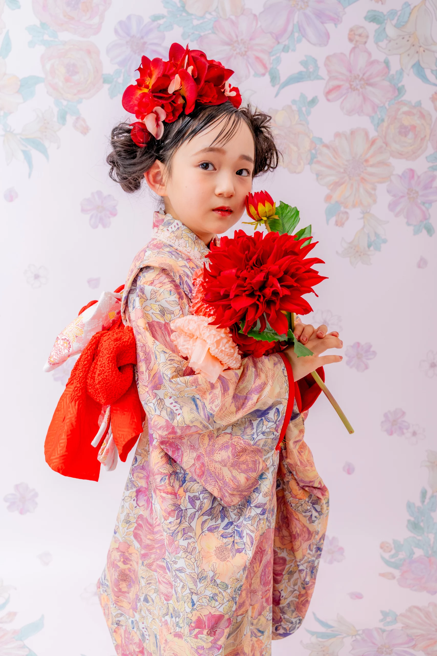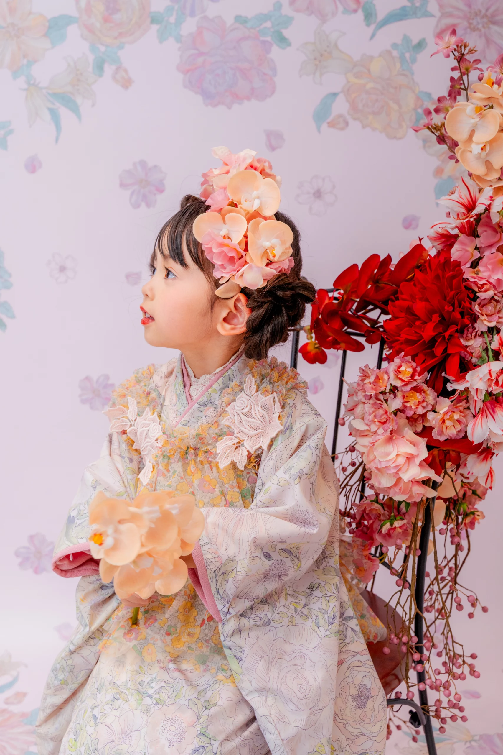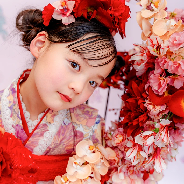 赤の花が咲き誇る髪飾りを合わせ、アート感あふれ特別な装いに。