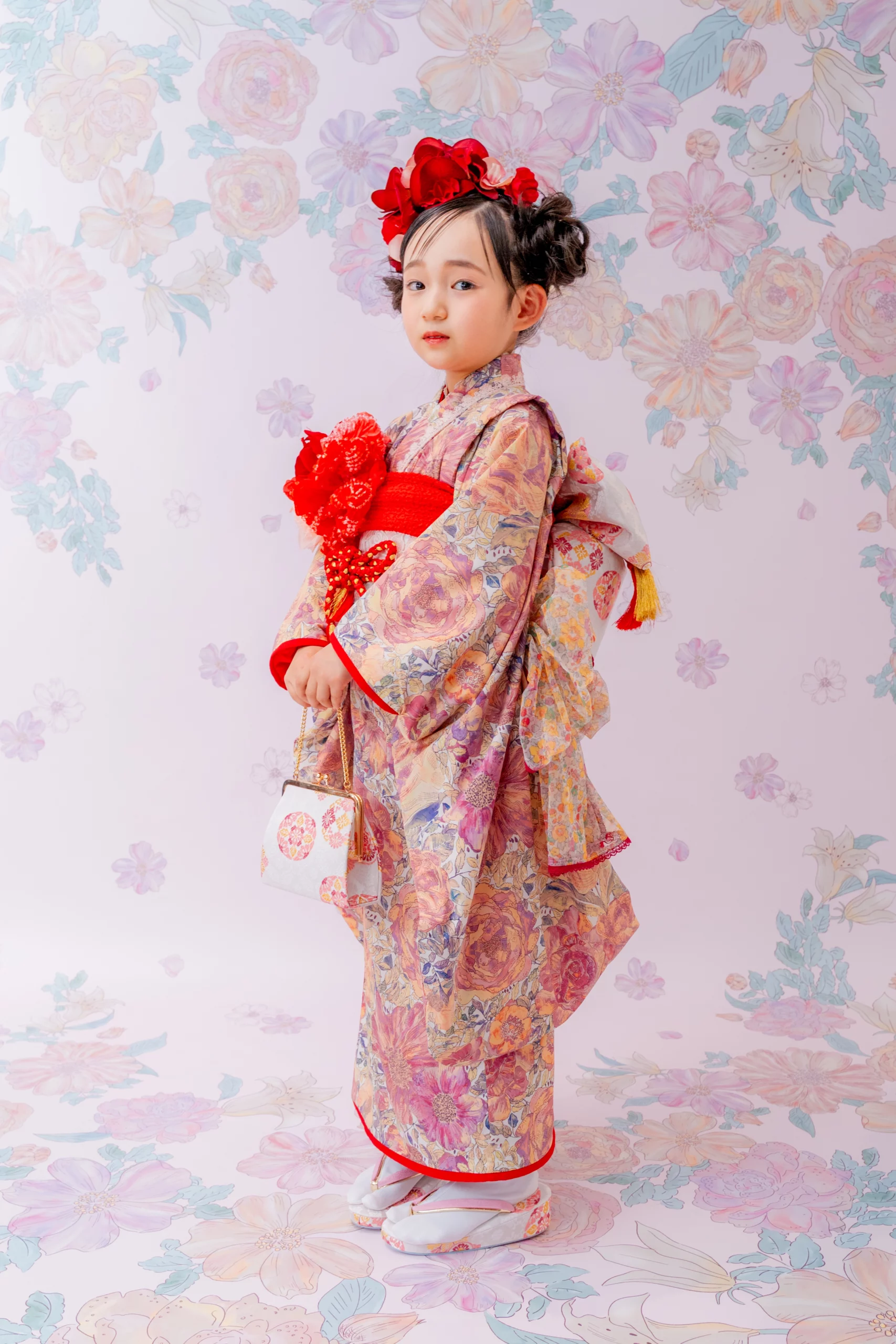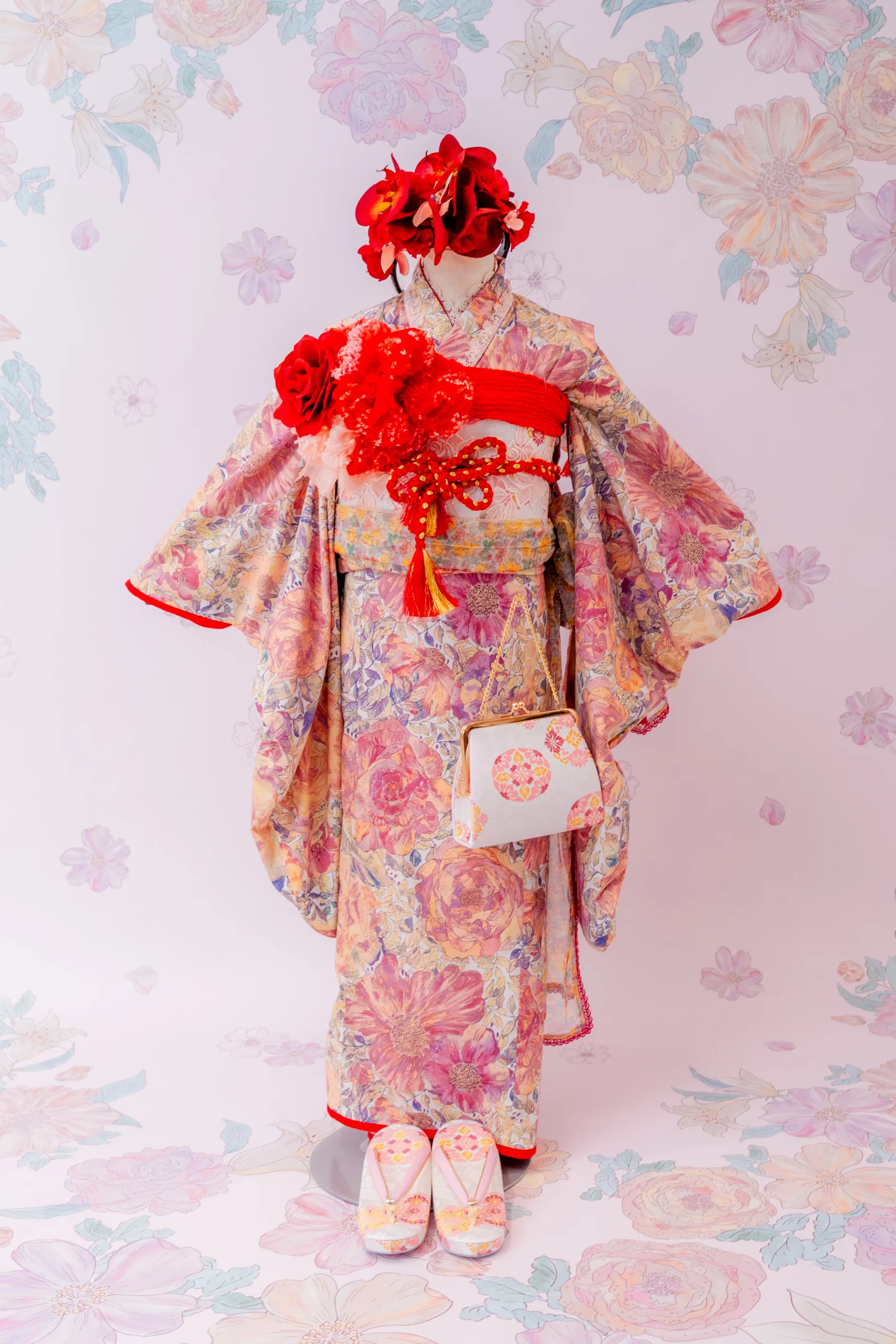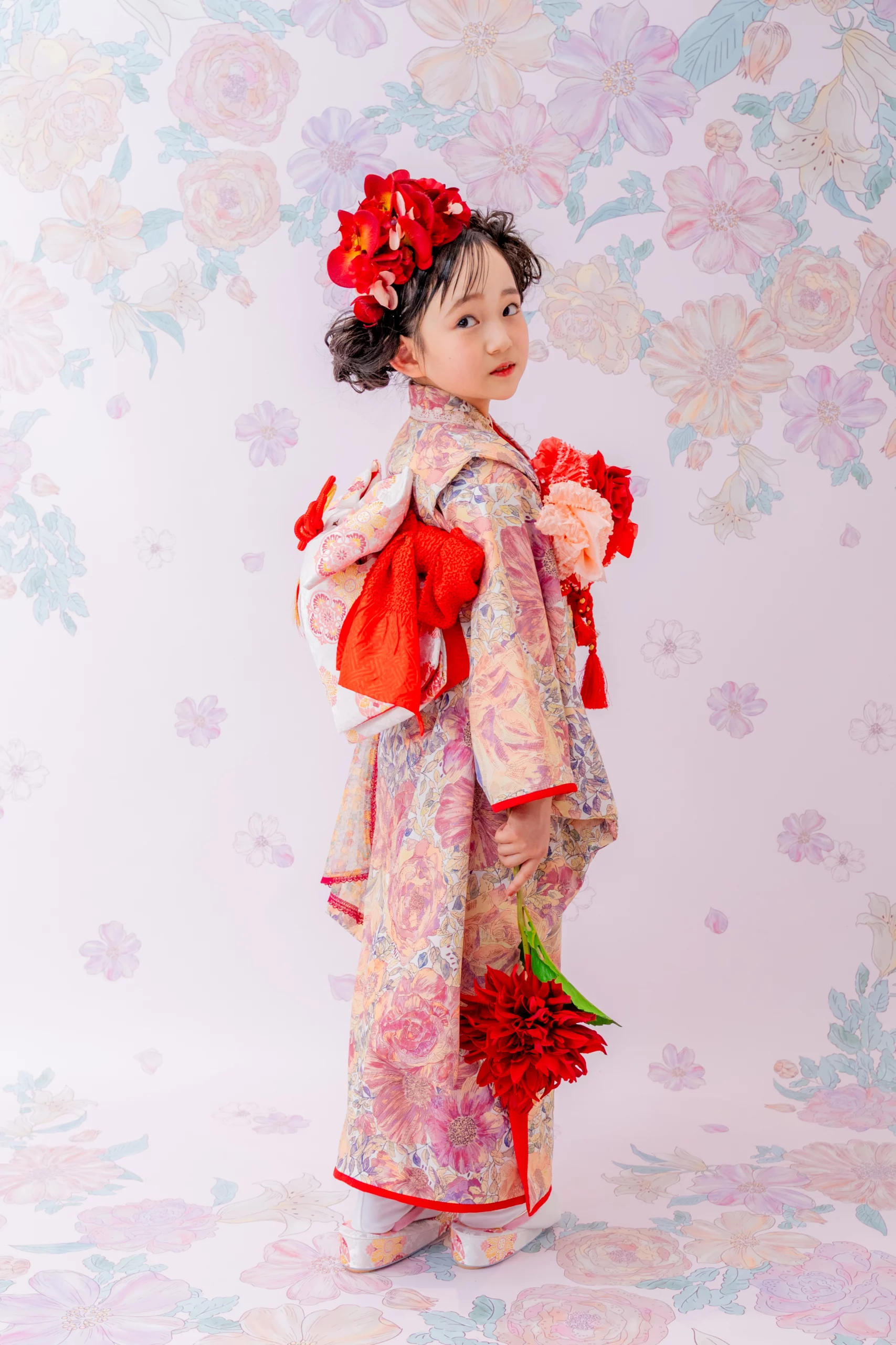 赤の花が咲き誇る髪飾りを合わせ、アート感あふれ特別な装いに。