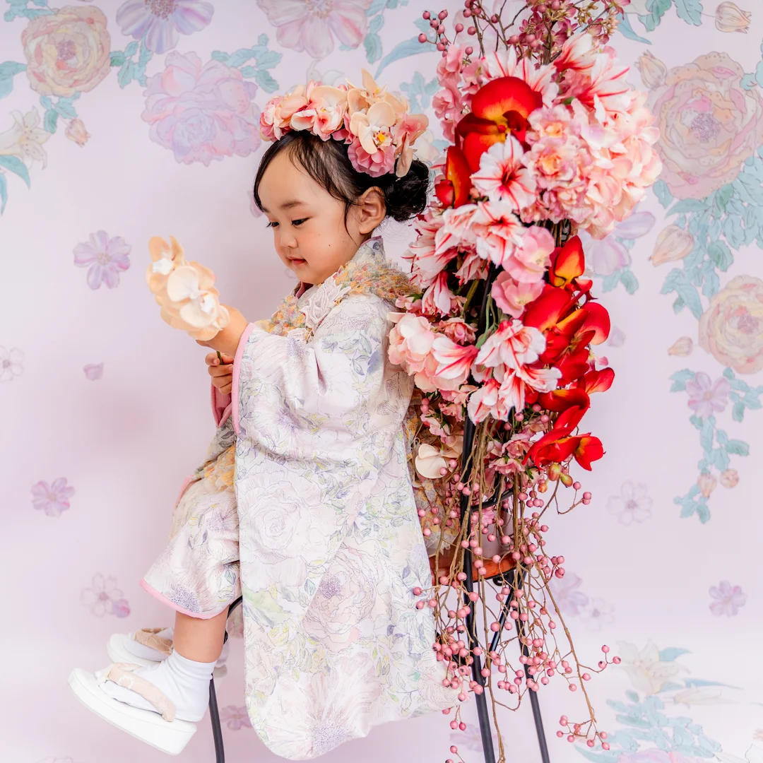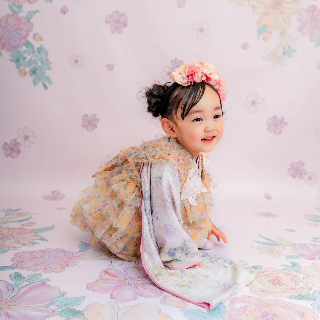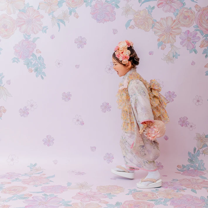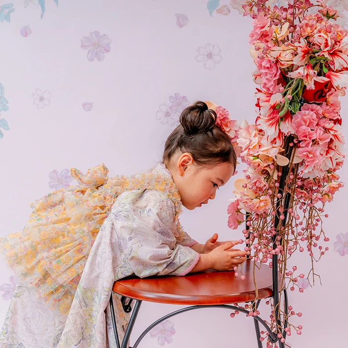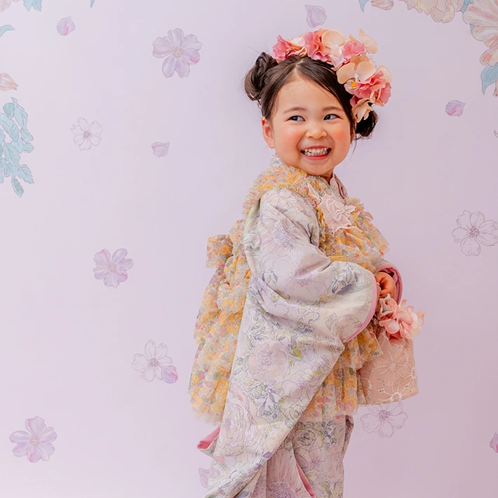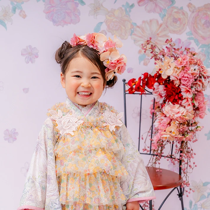 および3歳モデルが着用しているセンス オブ ワンダー着物(3歳) LIBERTY FABRICS KIMONO “Rose Xanthe”3age(衣装番号67002)は、開催中の全店舗で着用可能です。