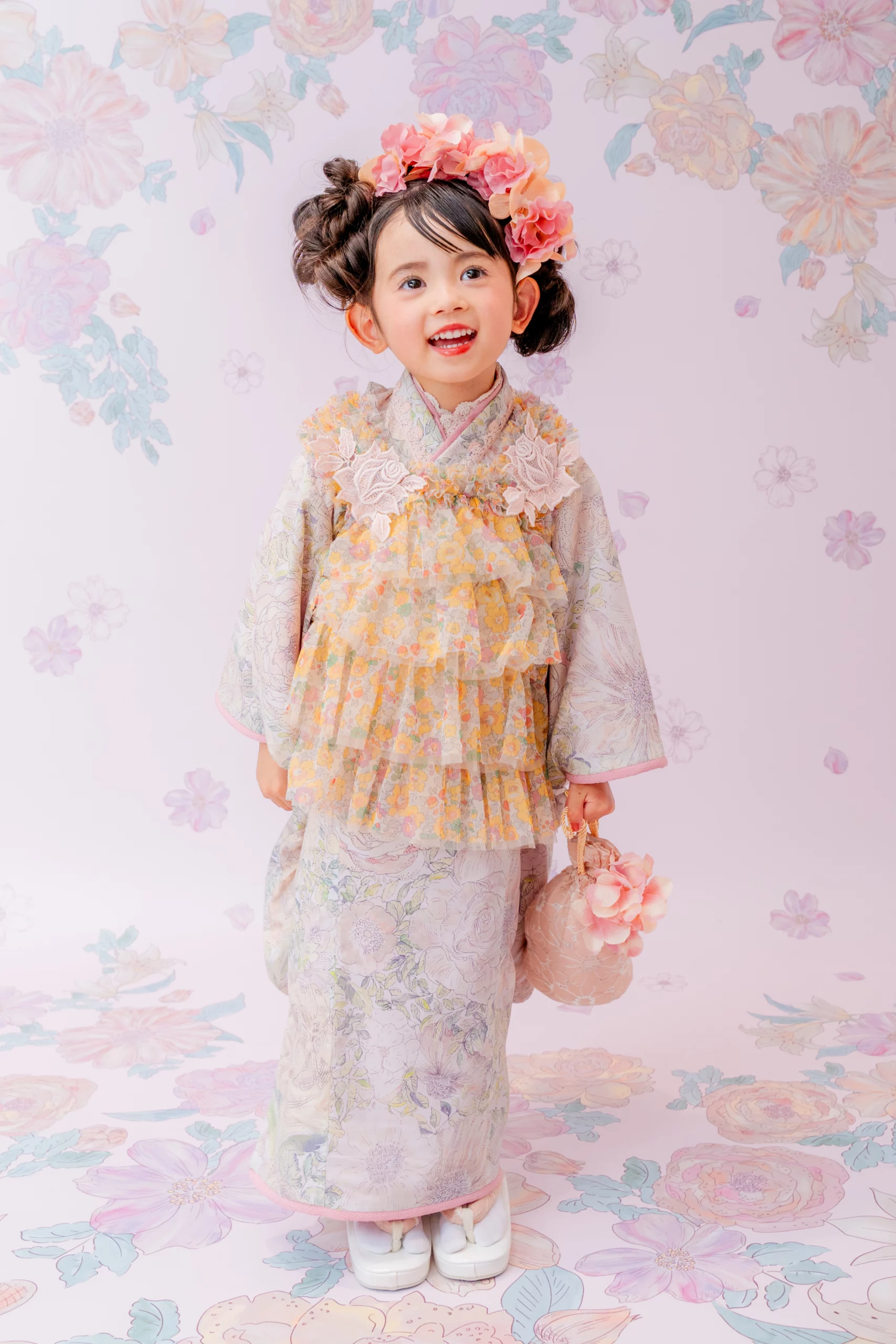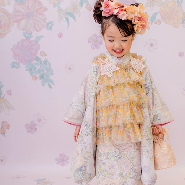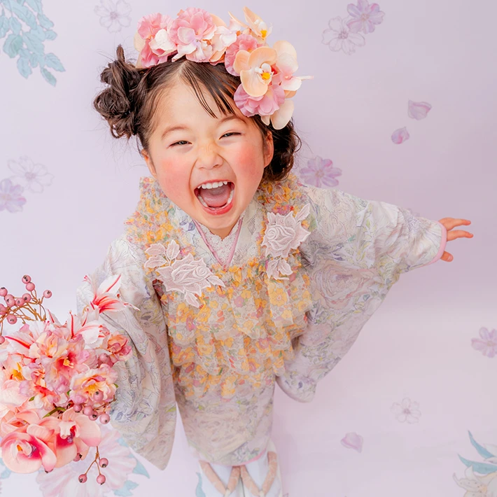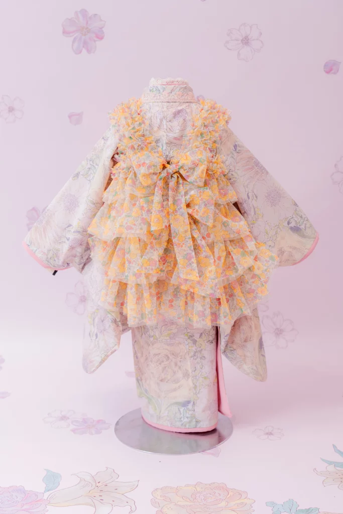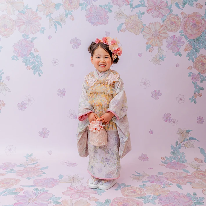 および3歳モデルが着用しているセンス オブ ワンダー着物(3歳) LIBERTY FABRICS KIMONO “Rose Xanthe”3age(衣装番号67002)は、開催中の全店舗で着用可能です。