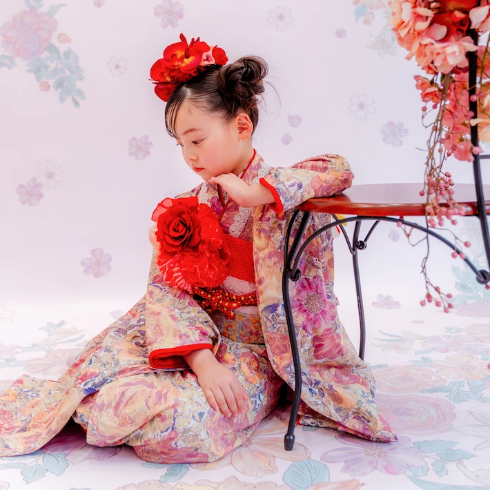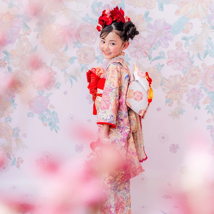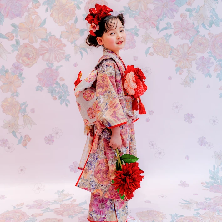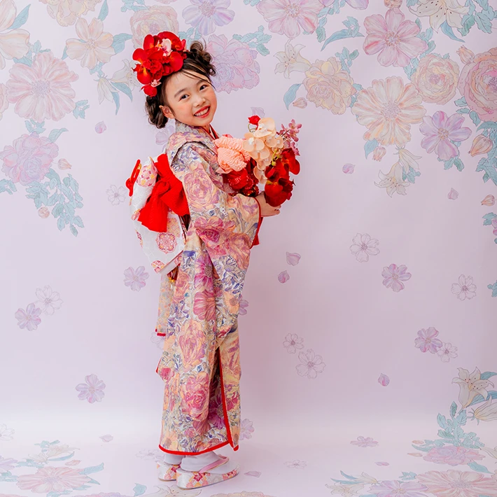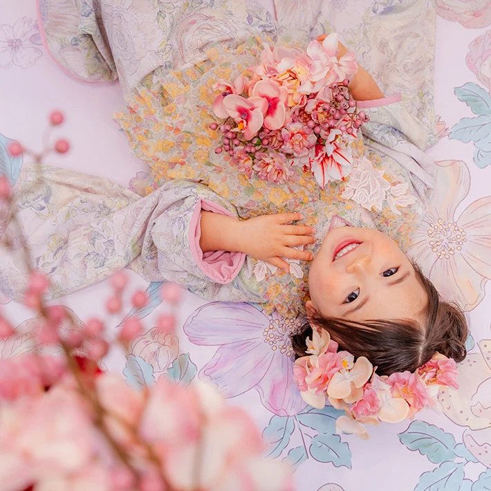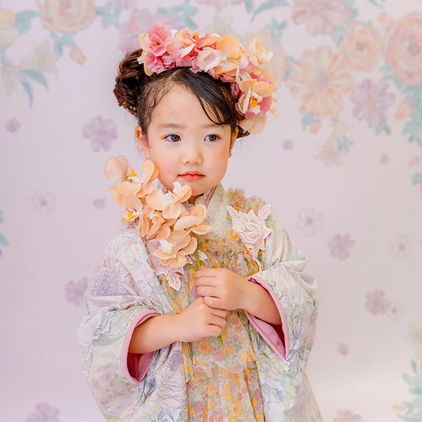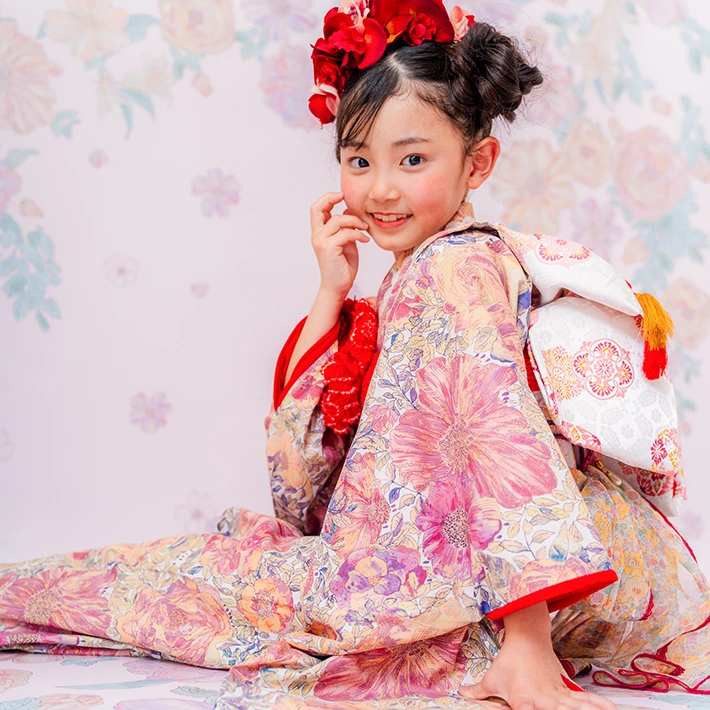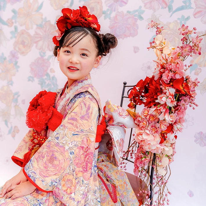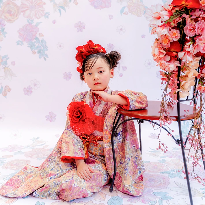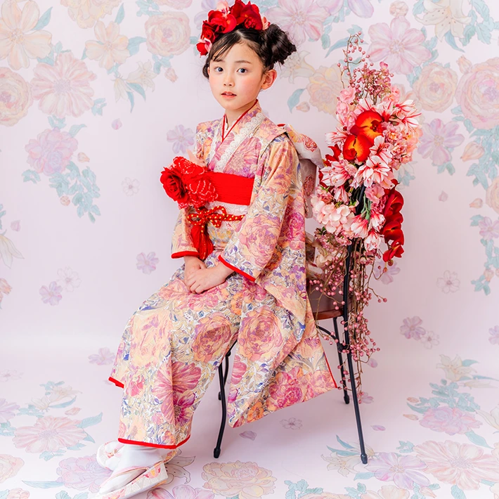 7歳モデルが着用しているセンス オブ ワンダー着物(7歳) LIBERTY FABRICS KIMONO “Rose Xanthe”7age(衣装番号67001)