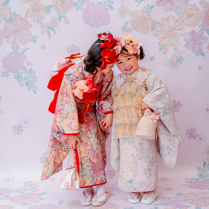 7歳モデルが着用しているセンス オブ ワンダー着物(7歳) LIBERTY FABRICS KIMONO “Rose Xanthe”7age(衣装番号67001)および3歳モデルが着用しているメセンス オブ ワンダー着物(3歳) LIBERTY FABRICS KIMONO “Rose Xanthe”3age(衣装番号67002)は、開催店舗5店舗で着用可能です。