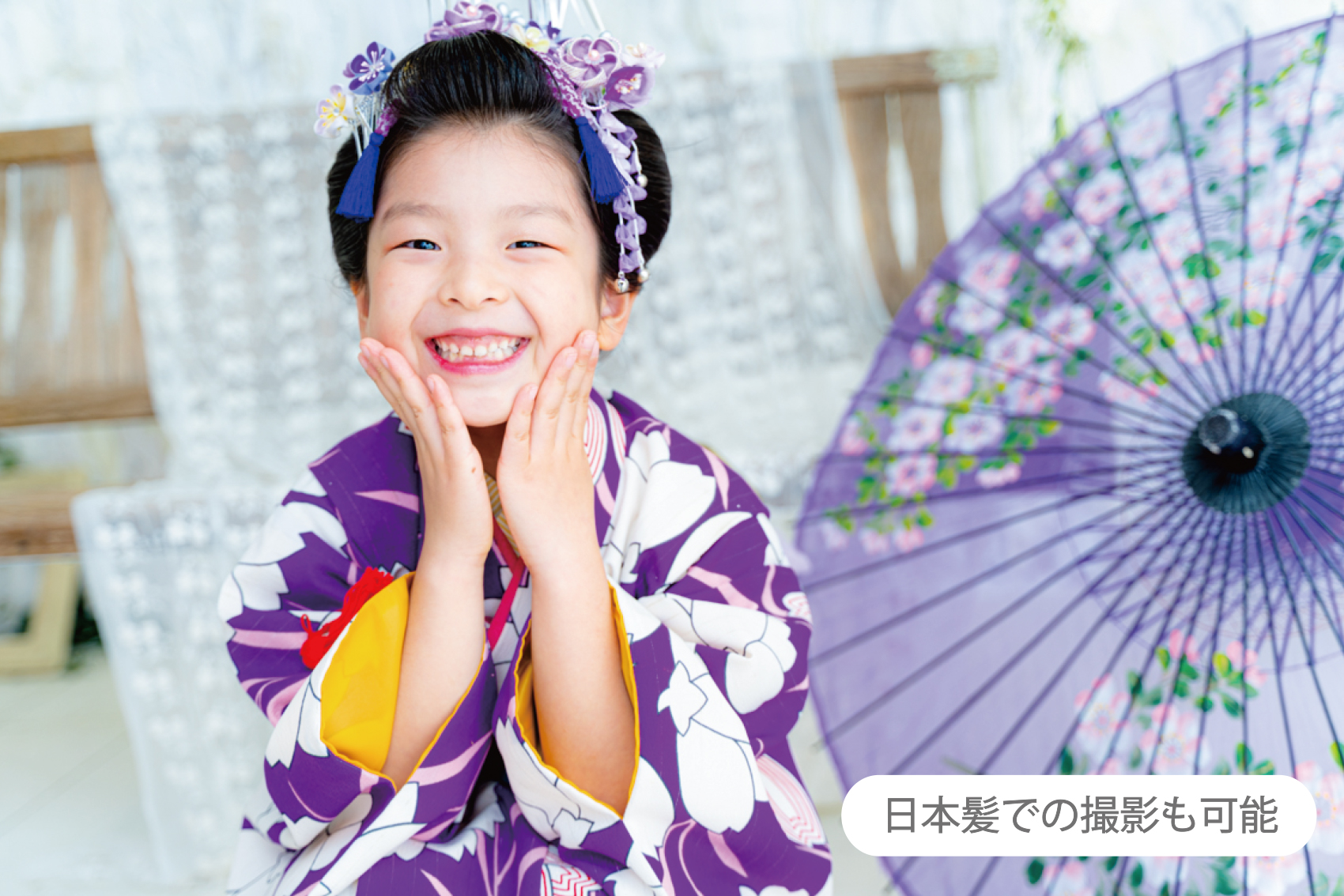 お子様の着付けと、簡単なヘアメイクを無料でいたします。別料金となりますが、日本髪のオプションもございます。ヘアメイクは原則、3歳以上対象とさせていただいております。