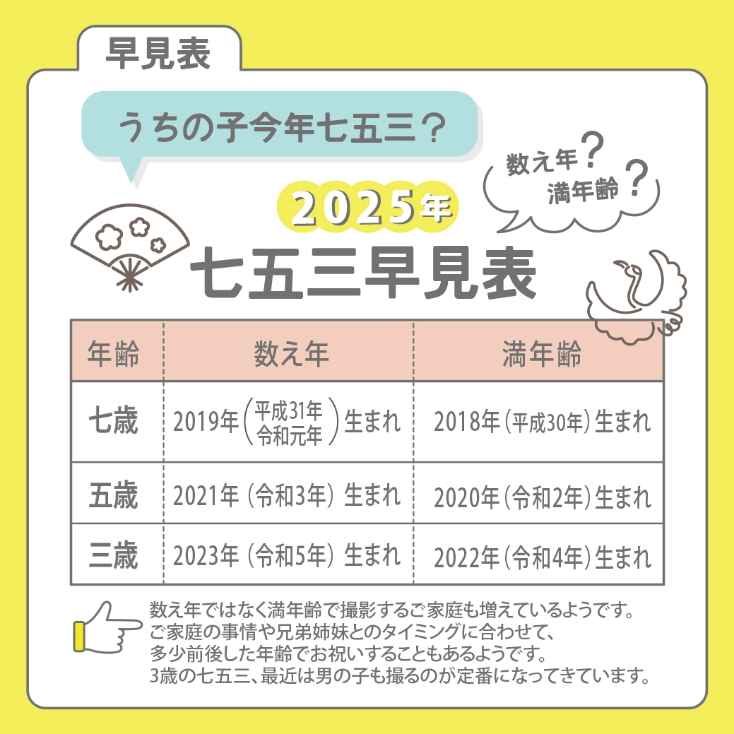 年齢の数え方は、「数え年」と「満年齢」の二通りありどちらで撮影しても問題ありませんが、近年では「満年齢」でのお祝いが主流となっています。