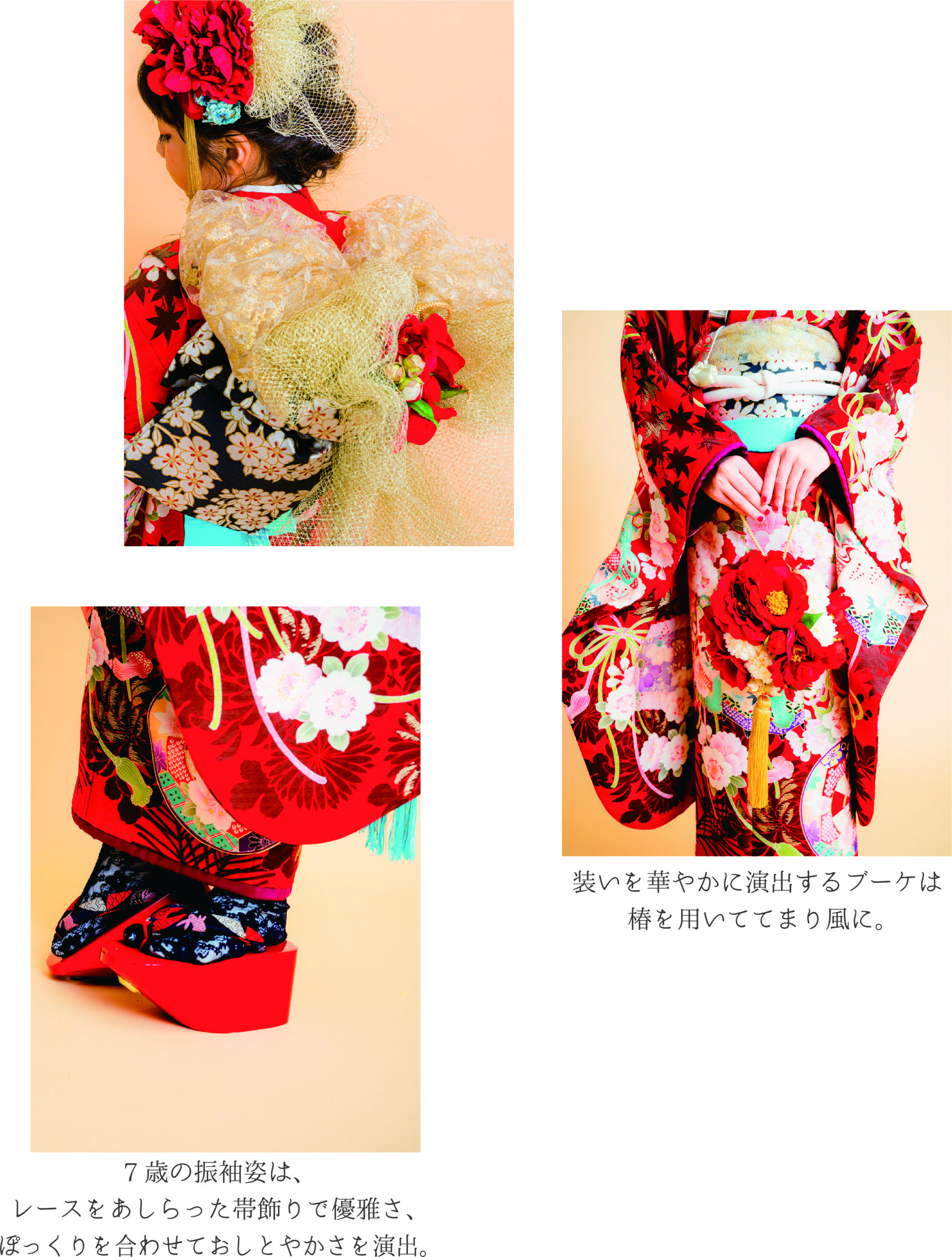 お子様の着付けと、簡単なヘアメイクを無料でいたします。ヘアメイクは原則、3歳以上対象とさせていただいております。