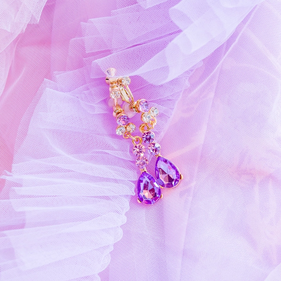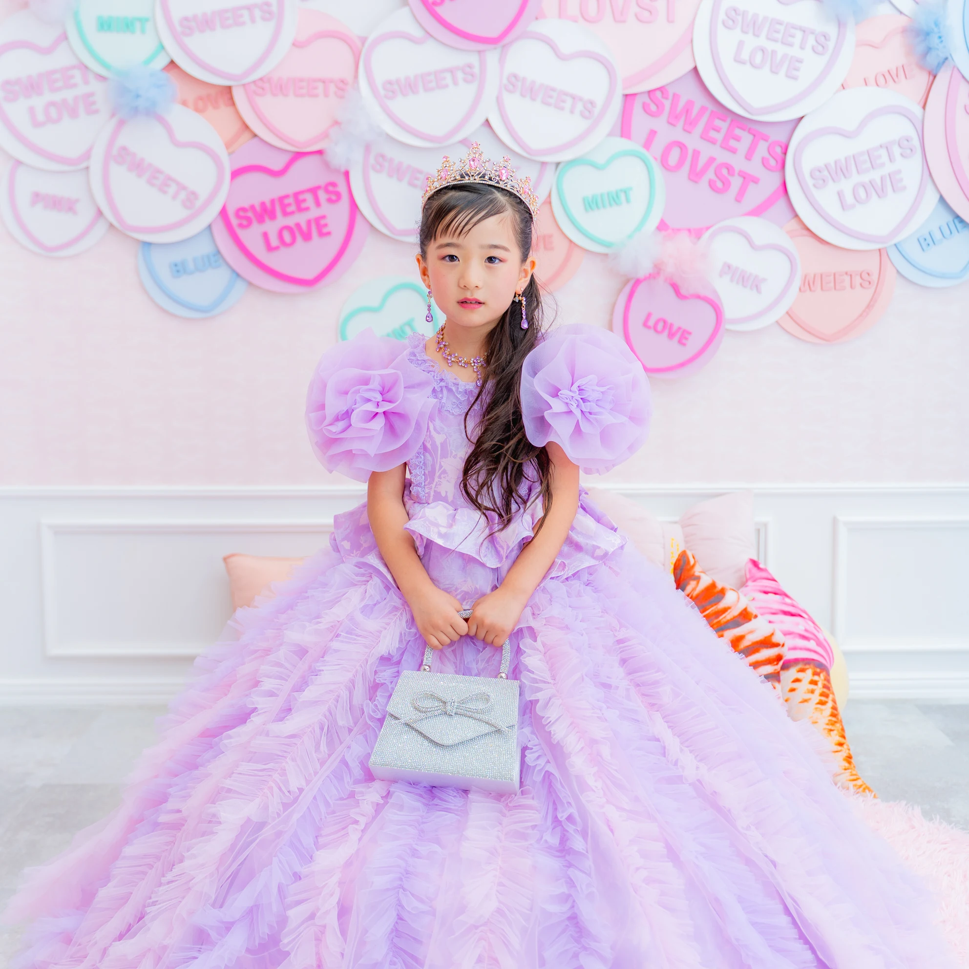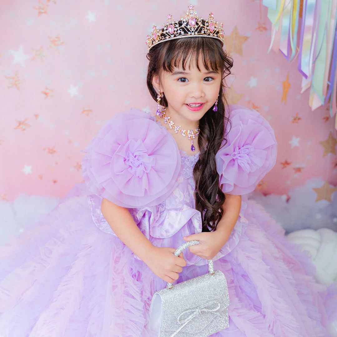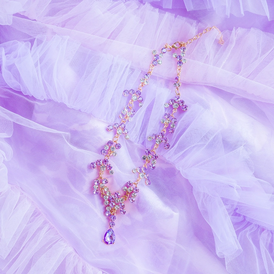 ◆ピンクのビジューが特徴のティアラとラベンダーのネックレスでキラキラ感をプラス