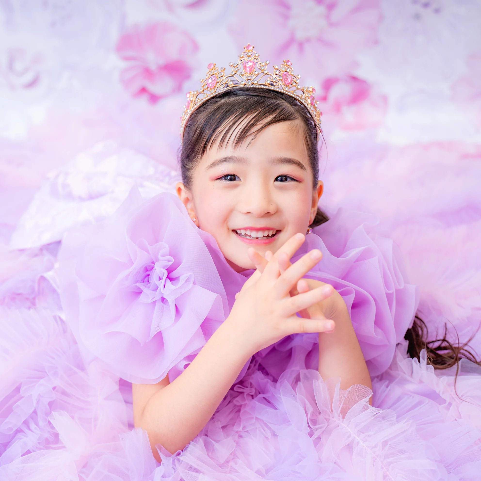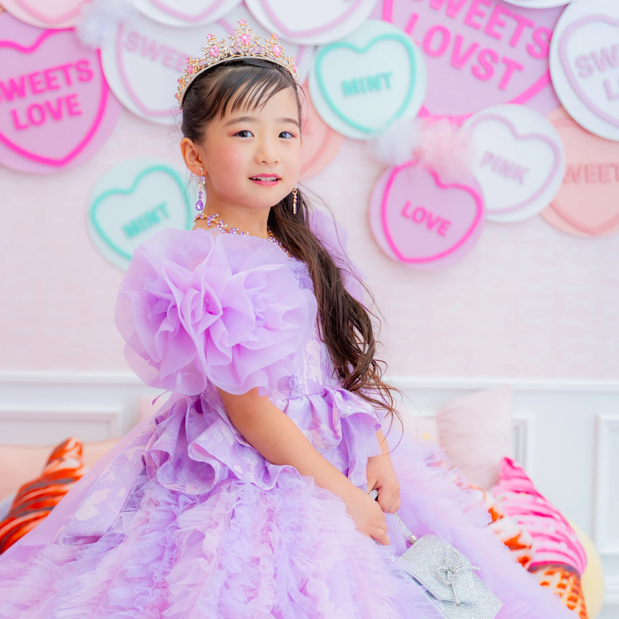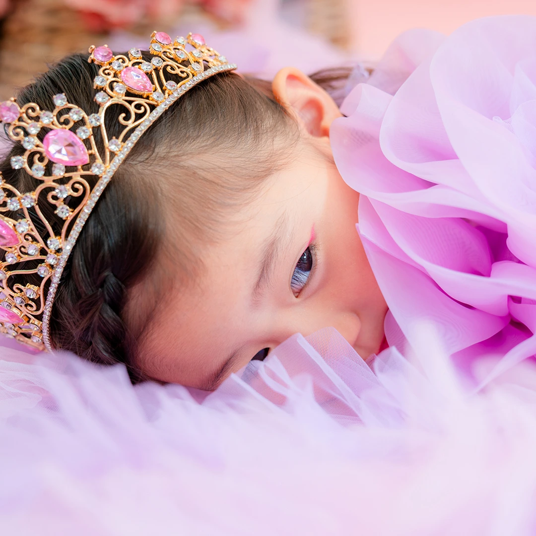 ◆ピンクのビジューが特徴のティアラとラベンダーのネックレスでキラキラ感をプラス