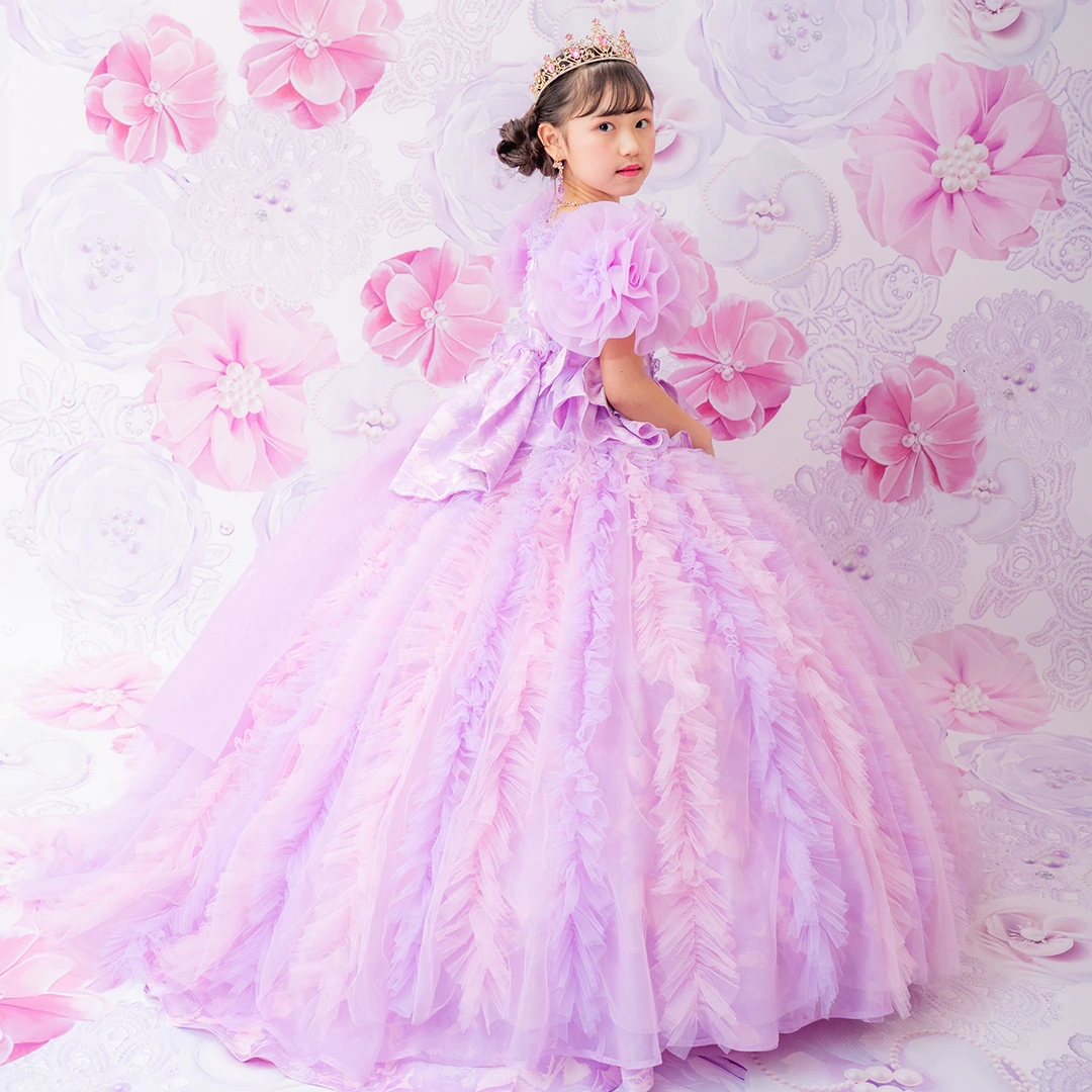 ◆薔薇のジャガード素材に、ピンク&ラベンダーのグラデーションチュールでエアリー感をプラスした華やかなシルエットが特徴のドレスライン