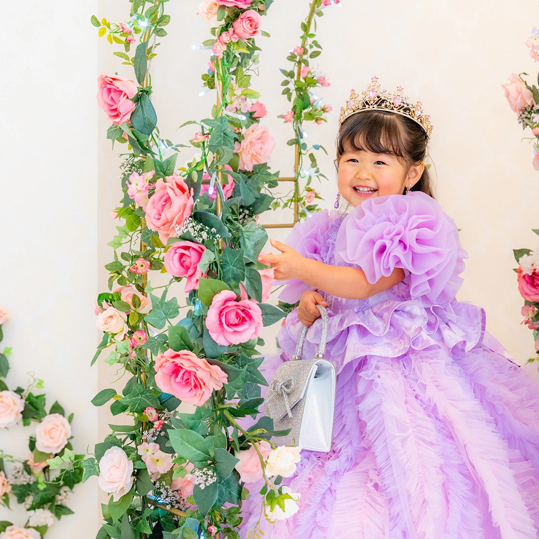 メゾ ピアノ新作ドレス「ラッフルローズ」での撮影は、メゾ ピアノ新作ドレス「ラッフルローズ」撮影会および 季節の七五三「mezzo piano “レトロ ロマンティック”」プランをご利用の場合に、無料で着用可能です。