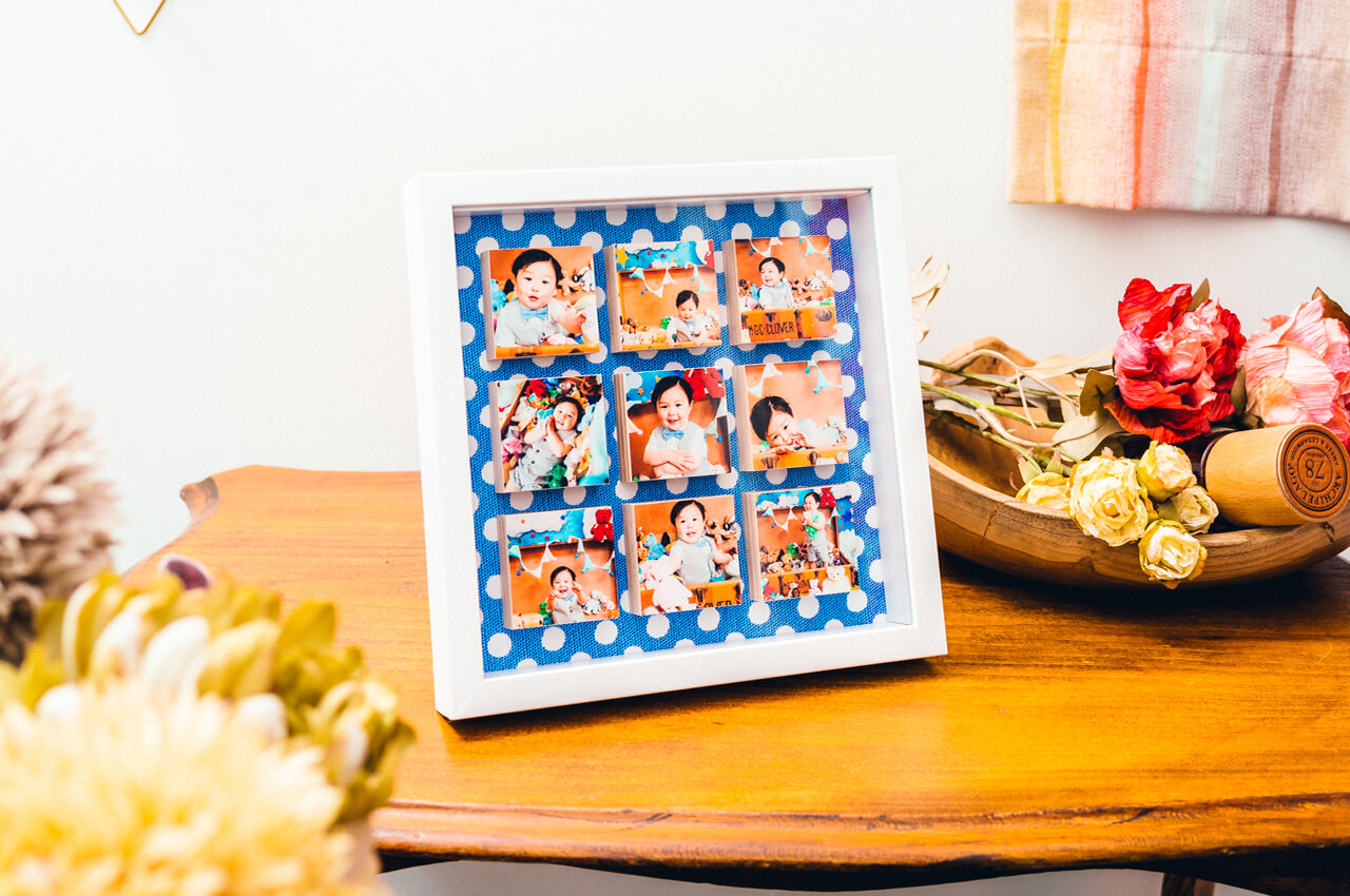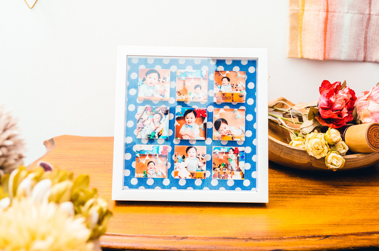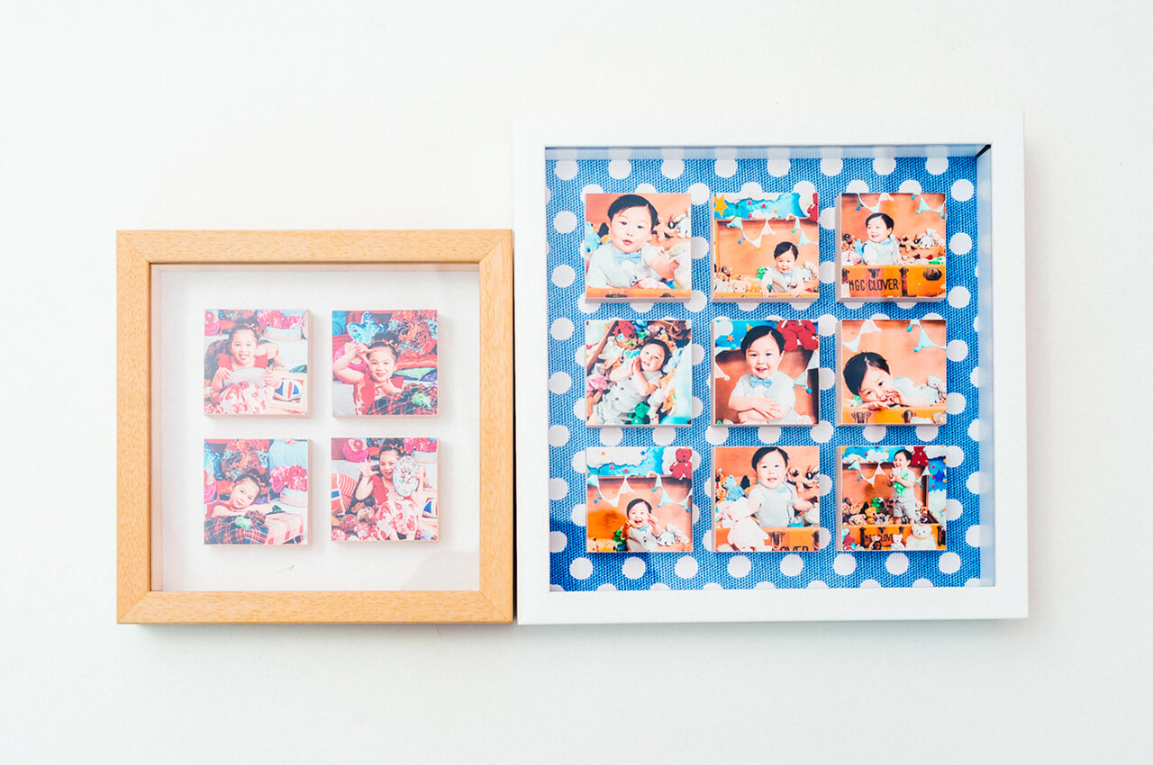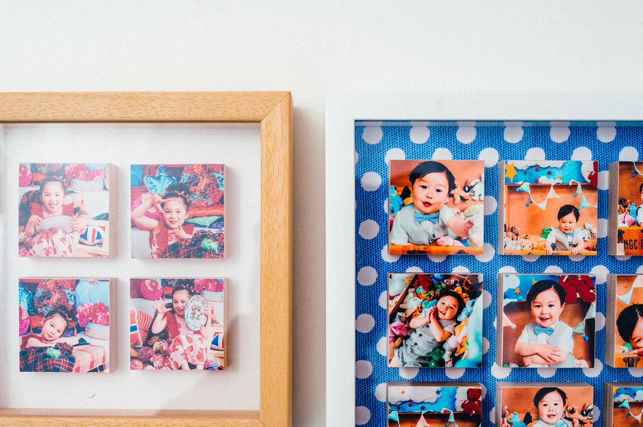 写真が浮かんだように並ぶおしゃれなフレームです。1つ1つが正方形のブロックで構成されており、写真を立体的に見せることができます。縁のカラーは白・木目の2種類から選択可能、背面のデザインは白・水玉(青地×白)の2種類から選択可能です。