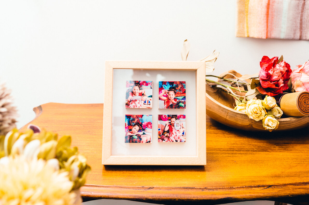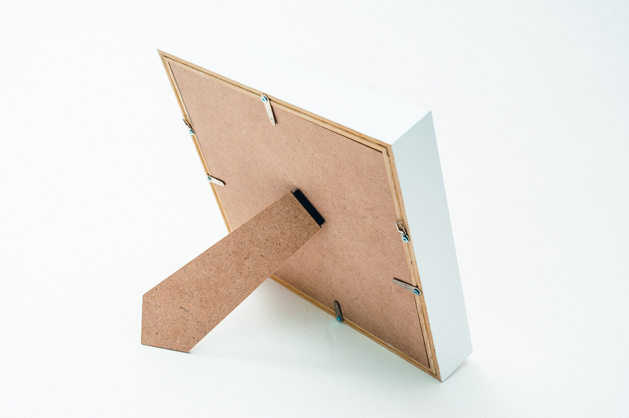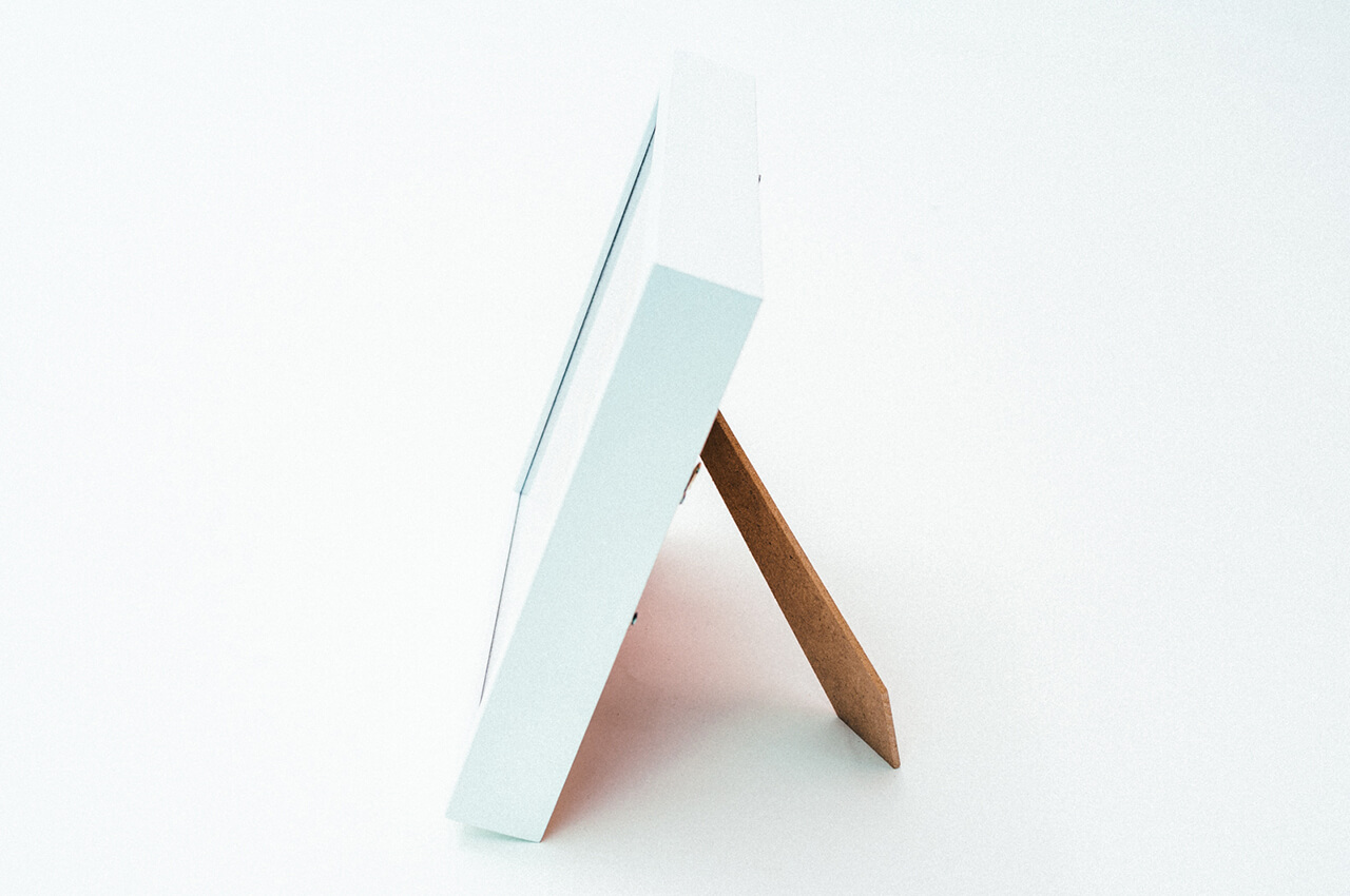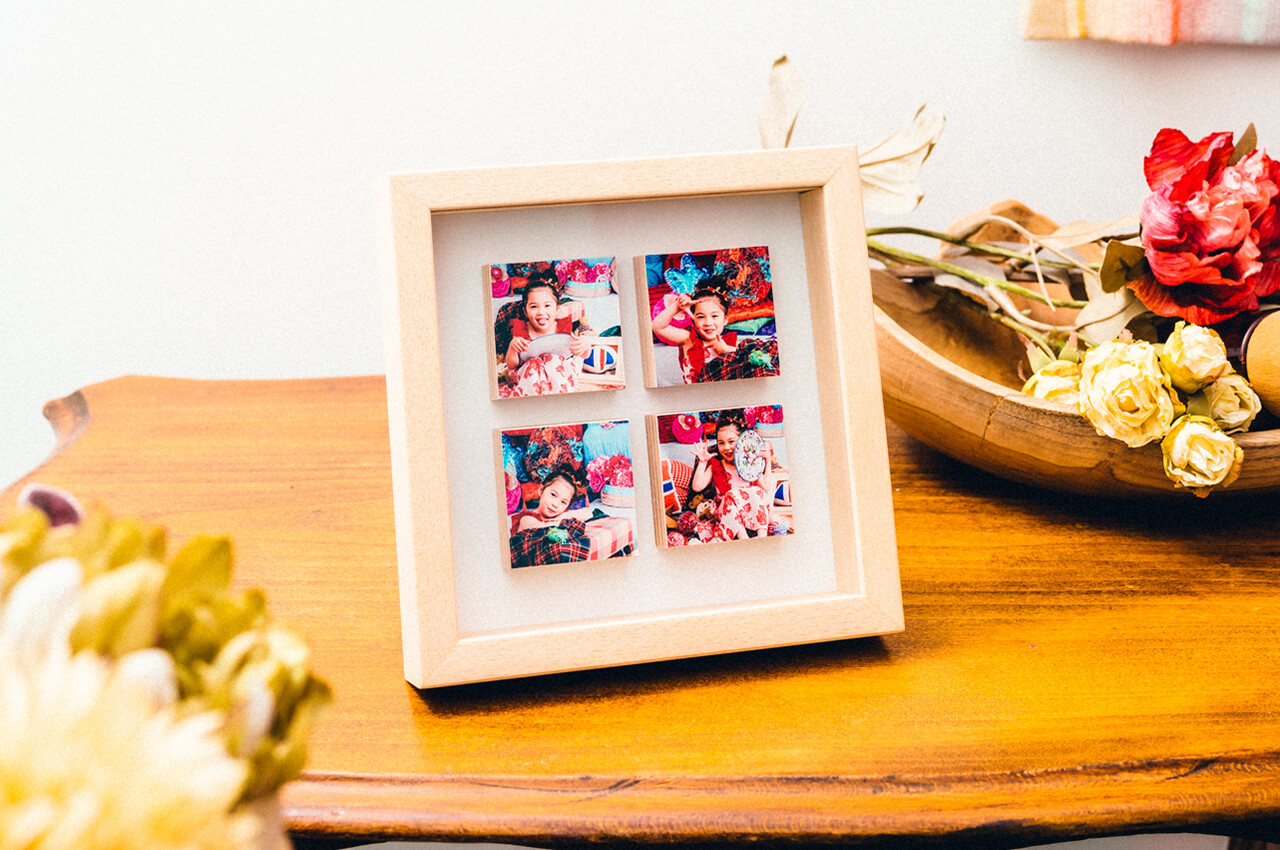 写真が浮かんだように並ぶおしゃれなフレームです。1つ1つが正方形のブロックで構成されており、写真を立体的に見せることができます。縁のカラーは白・木目の2種類から選択可能、背面のデザインは白・水玉(青地×白)の2種類から選択可能です。