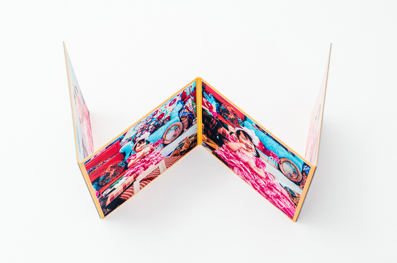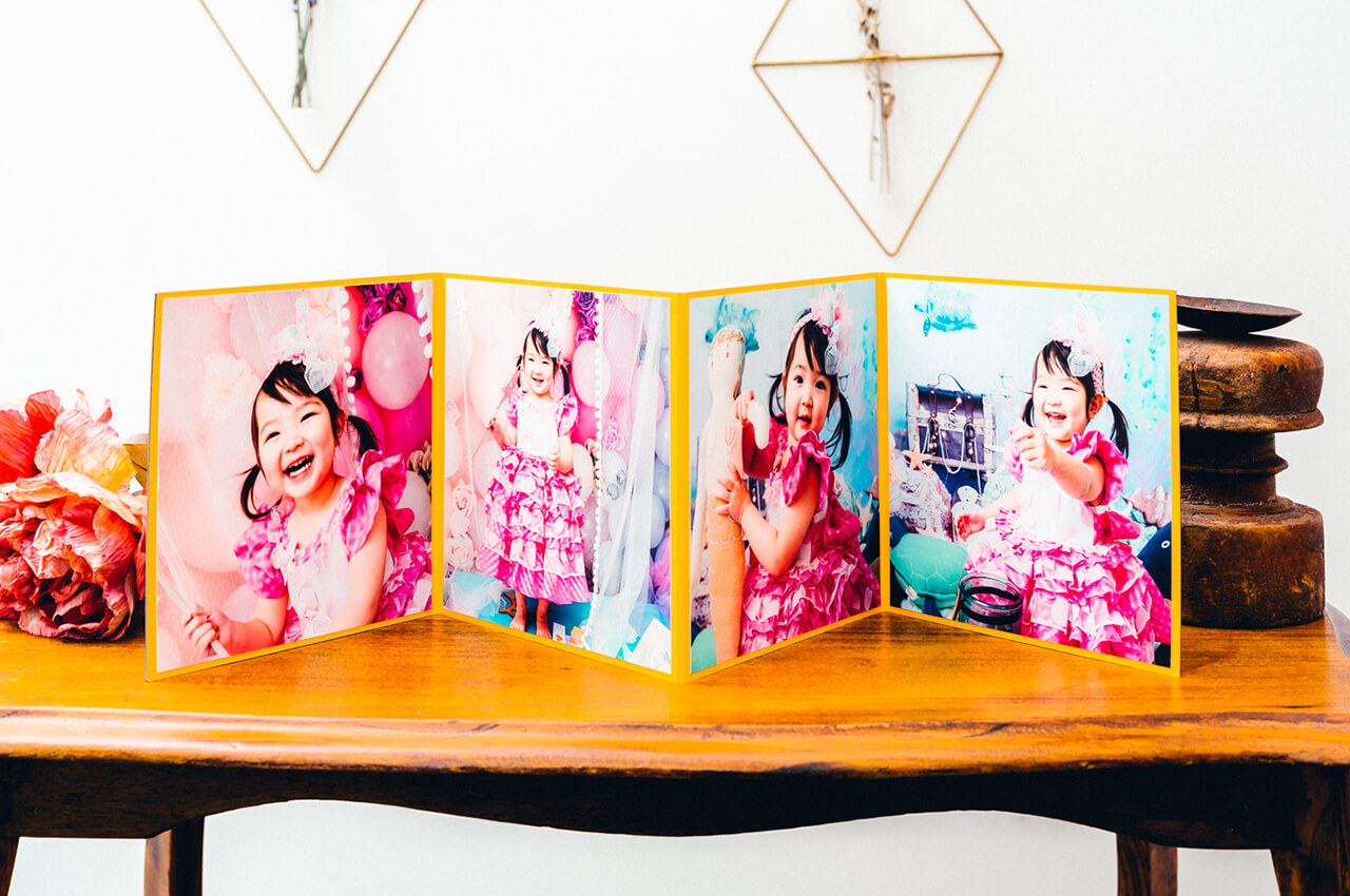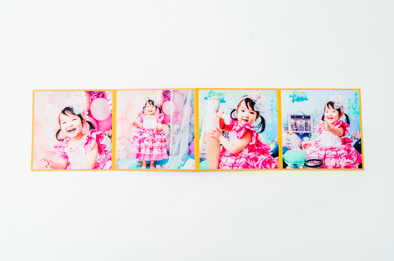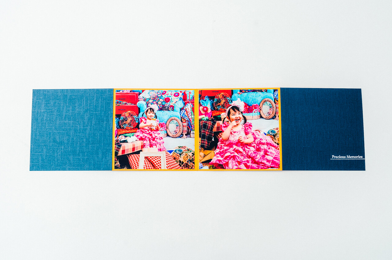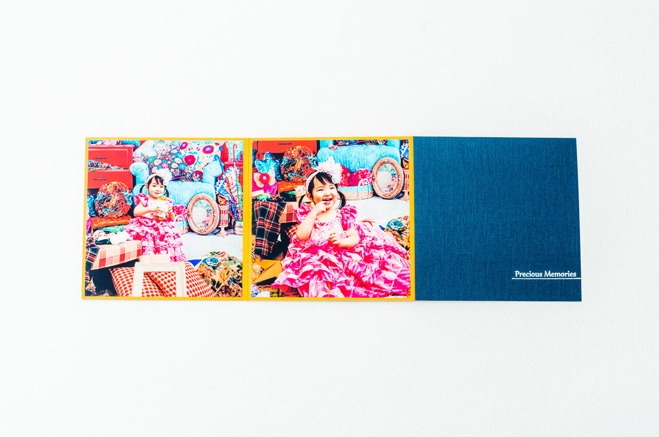 光沢を放つ箔押しの表紙からはじまり、4枚の写真が連なって一つの作品のように展開する4面の台紙には、美しい輝きのクリスタルプリントを採用。ご家族の大切な想い出を鮮やかに引き立てます。