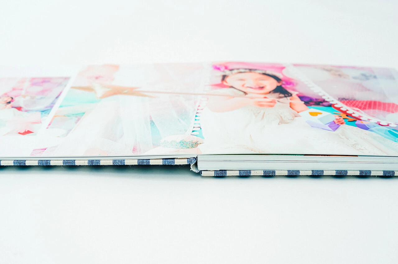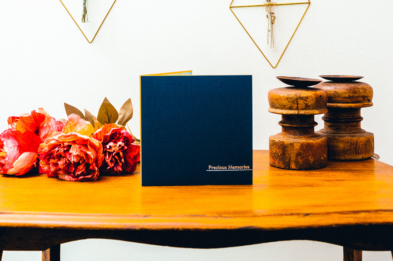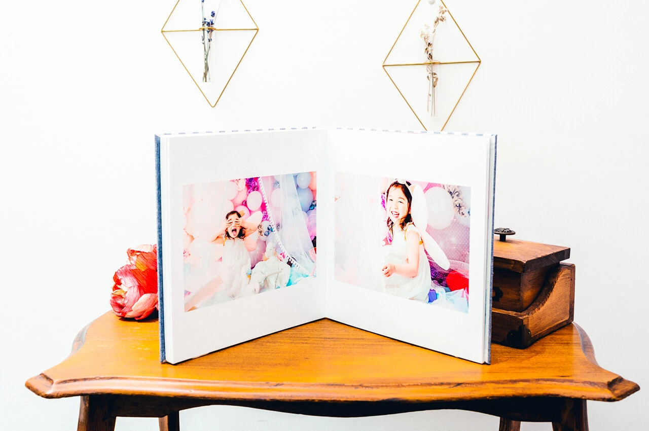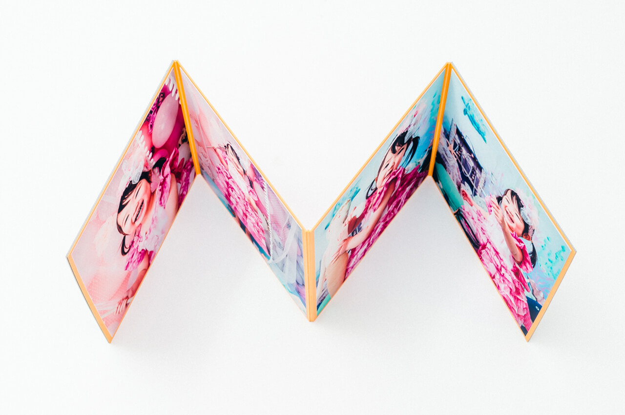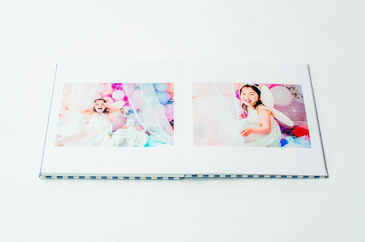 光沢を放つ箔押しの表紙からはじまり、4枚の写真が連なって一つの作品のように展開する4面の台紙には、美しい輝きのクリスタルプリントを採用。ご家族の大切な想い出を鮮やかに引き立てます。