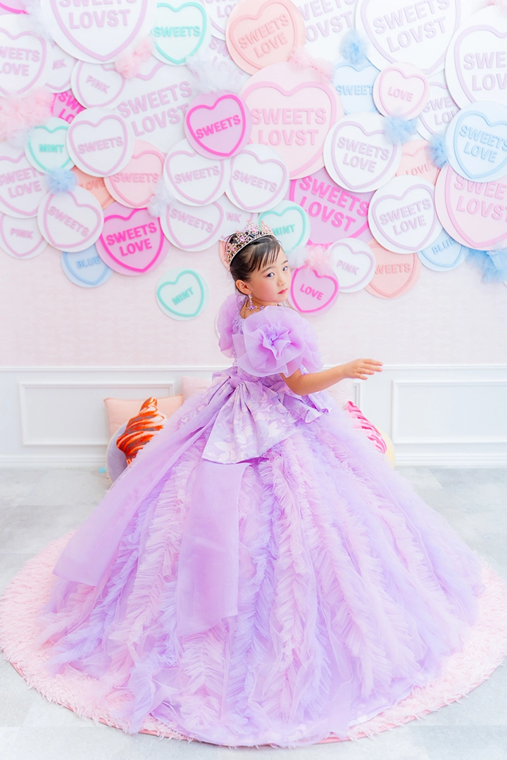 7歳の装いは、パステルカラーの甘さにアート感をプラス。