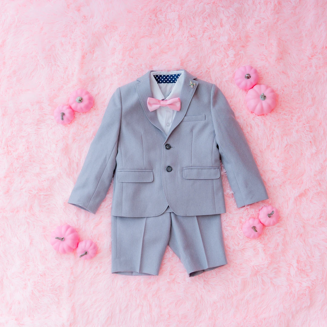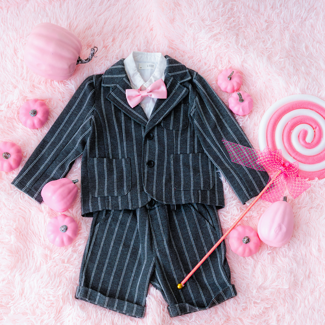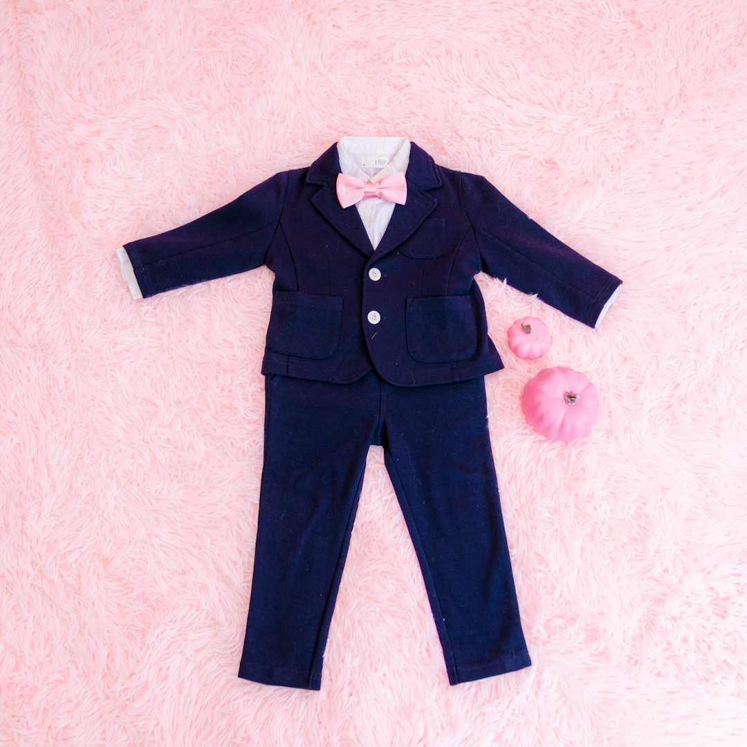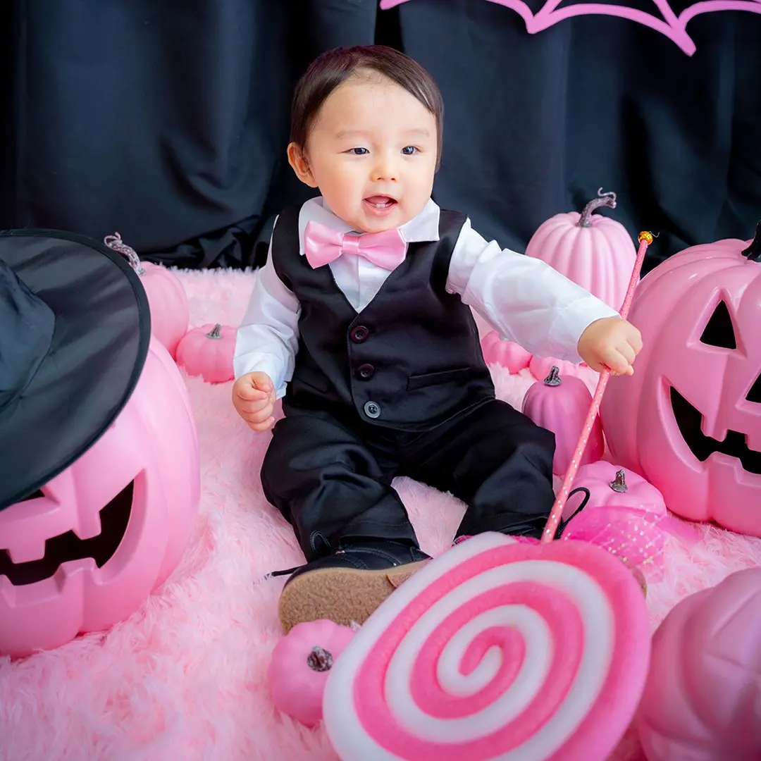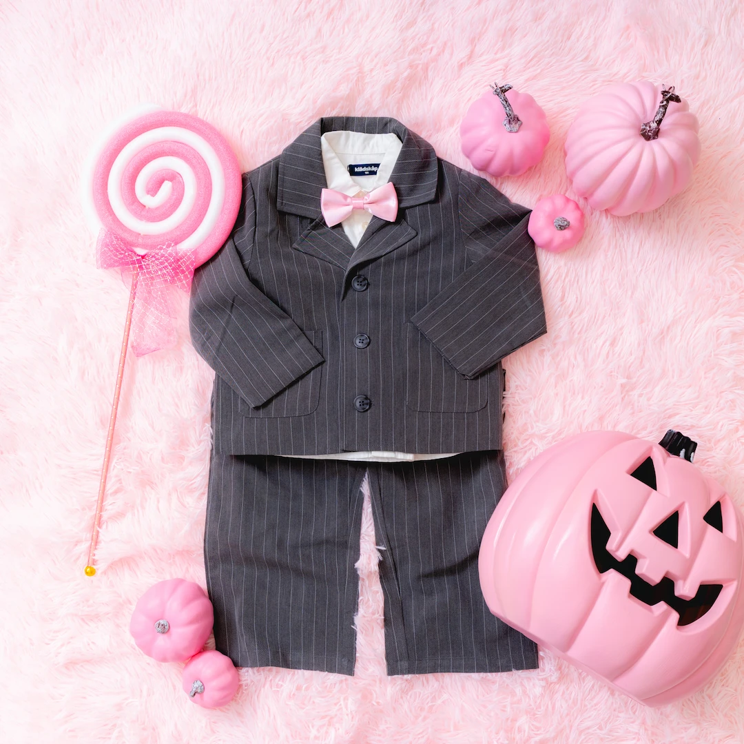 男の子にはピンクの蝶ネクタイが映えるクールなブラックフォーマルをご用意。