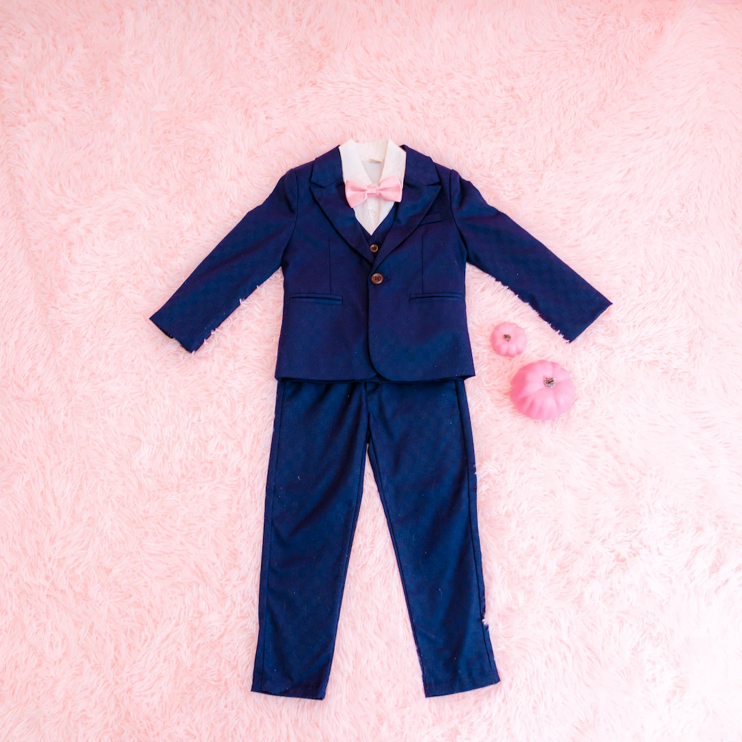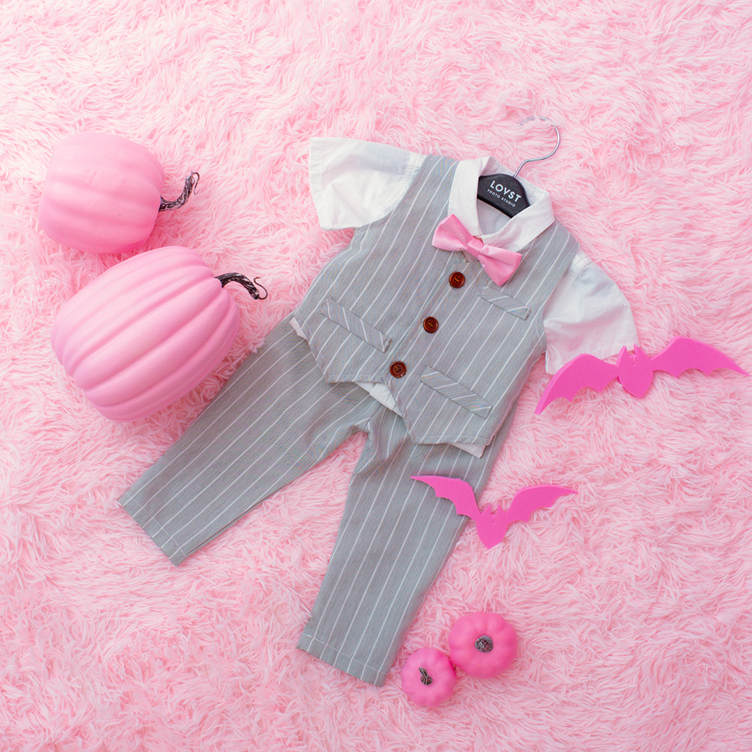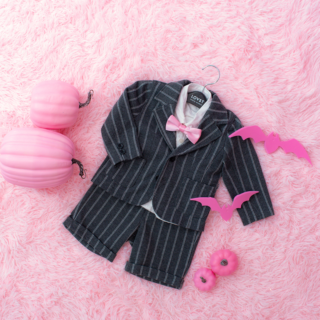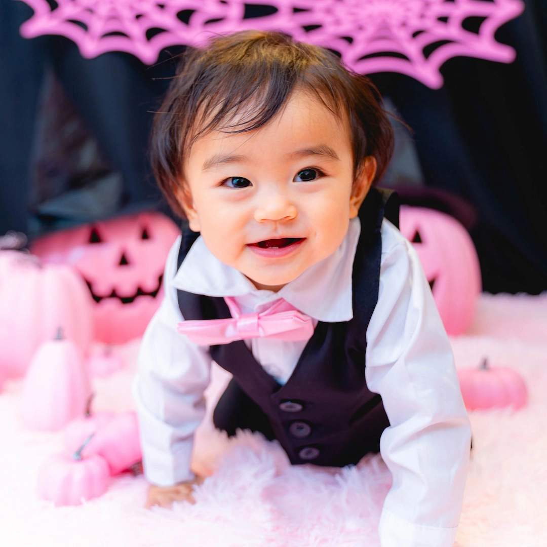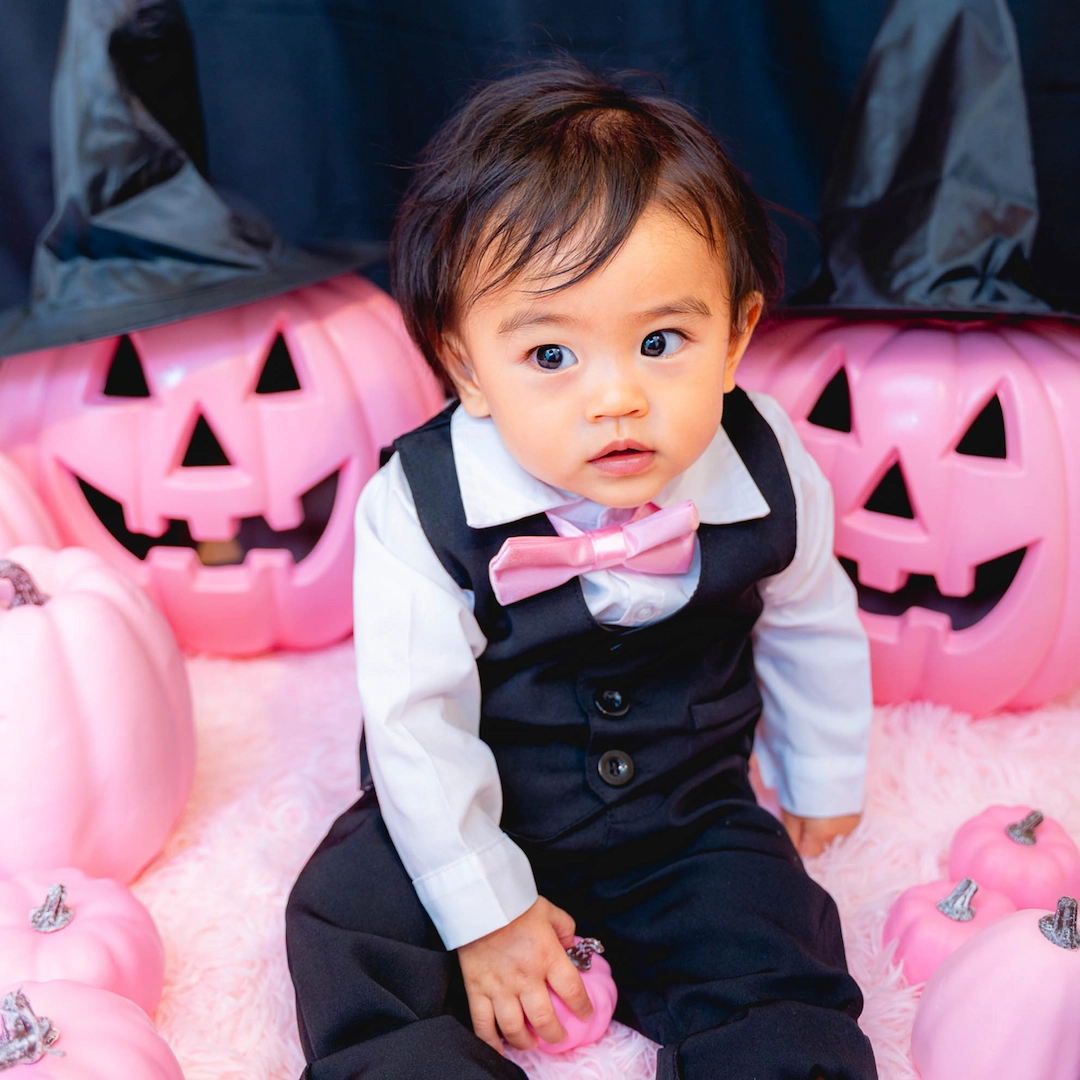 男の子にはピンクの蝶ネクタイが映えるクールなブラックフォーマルをご用意。