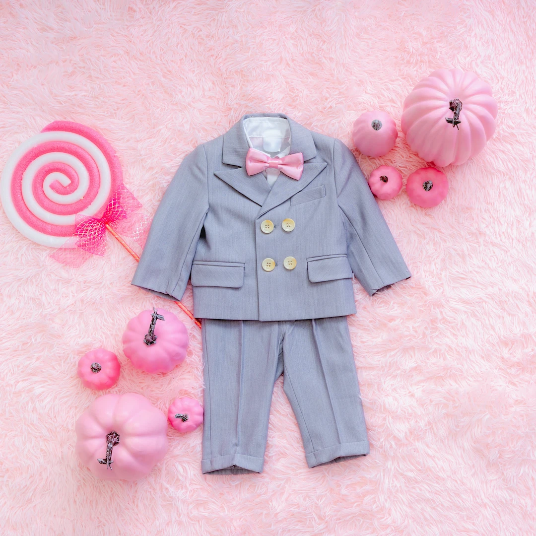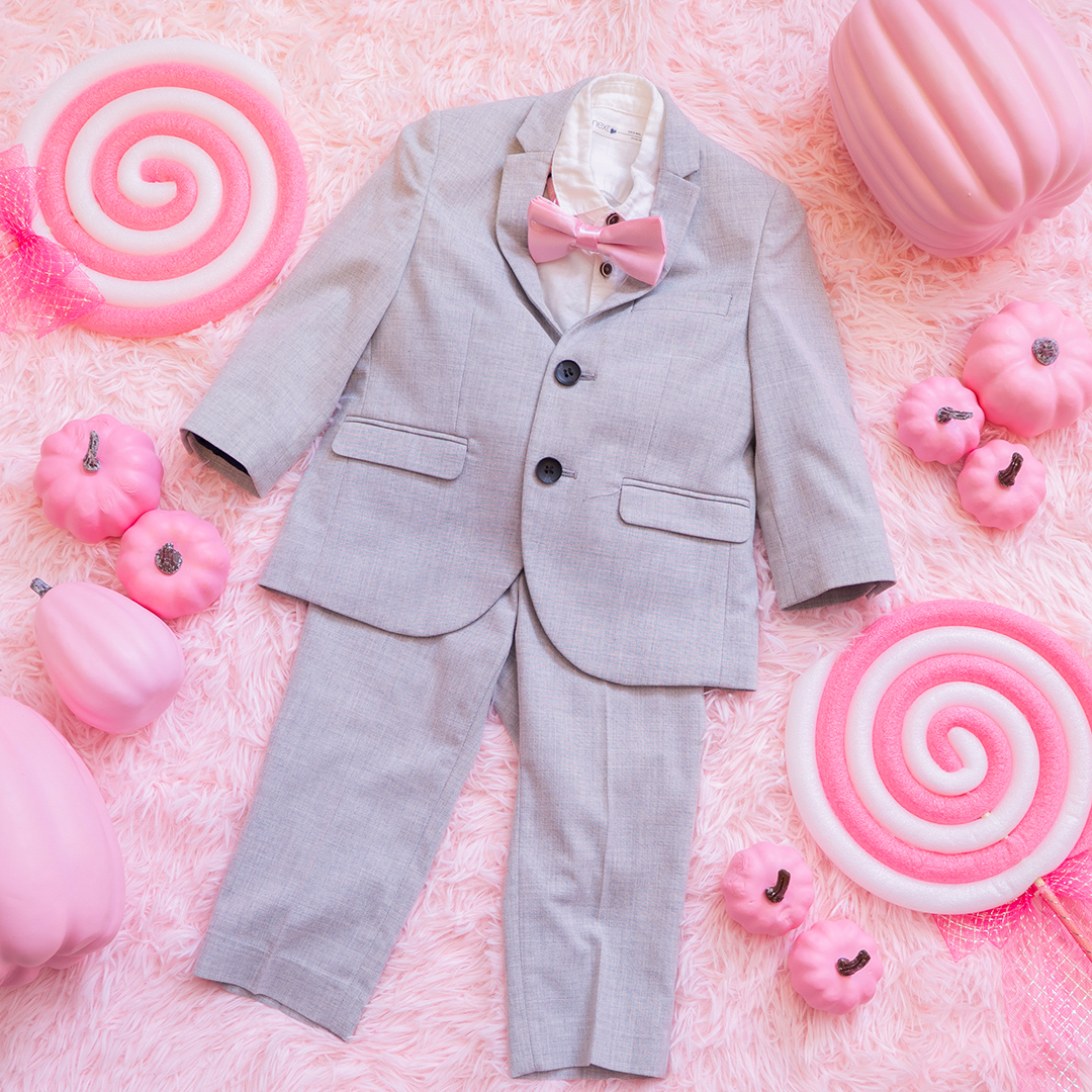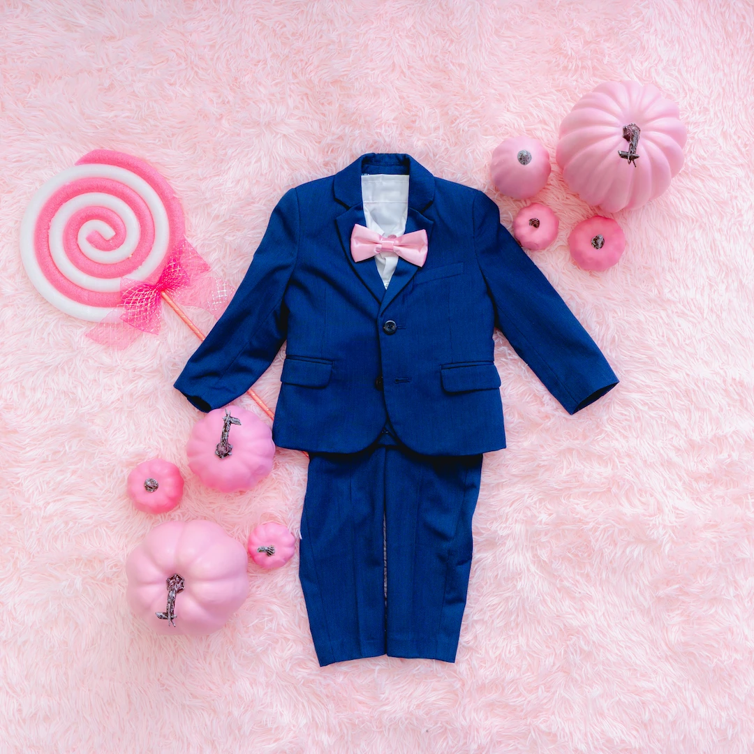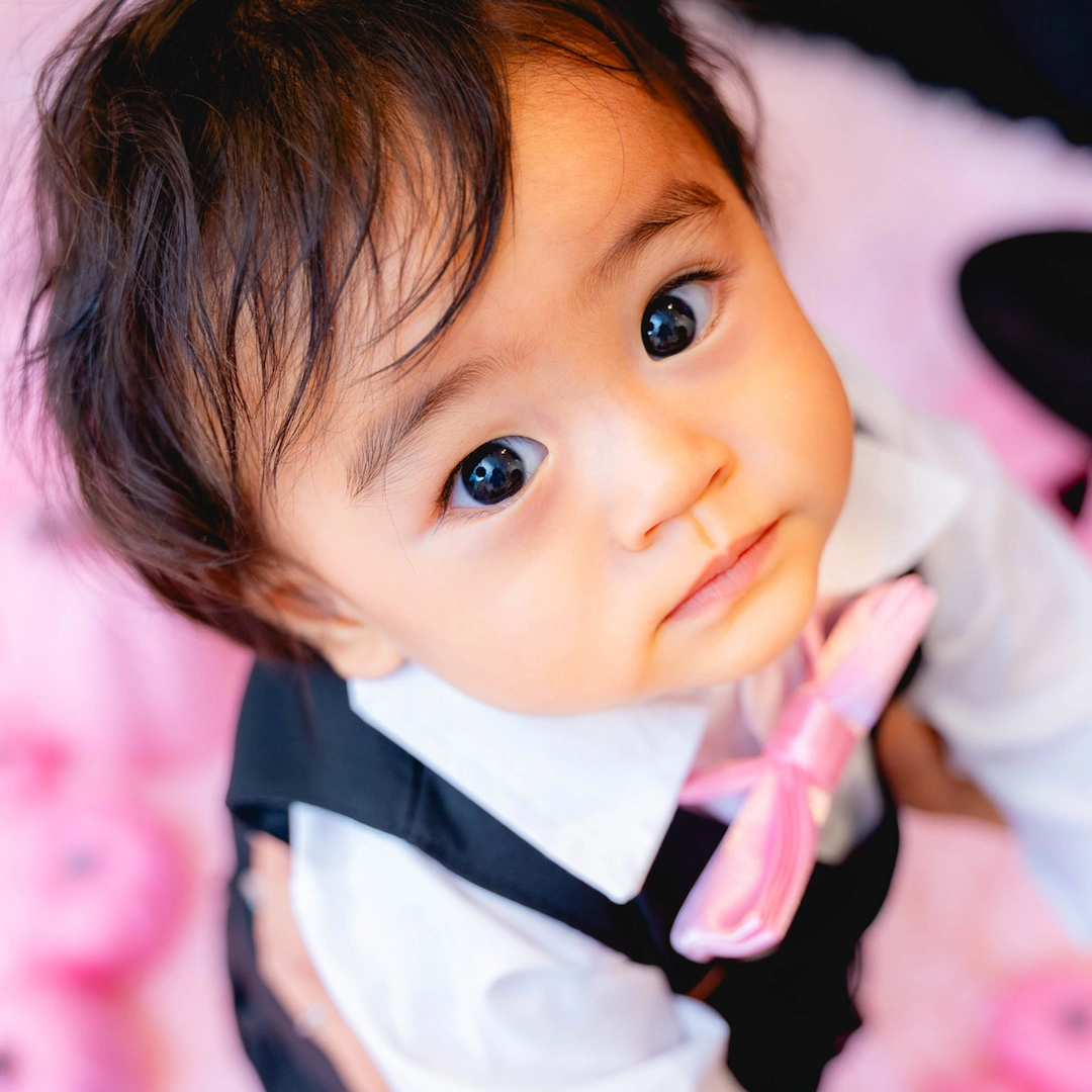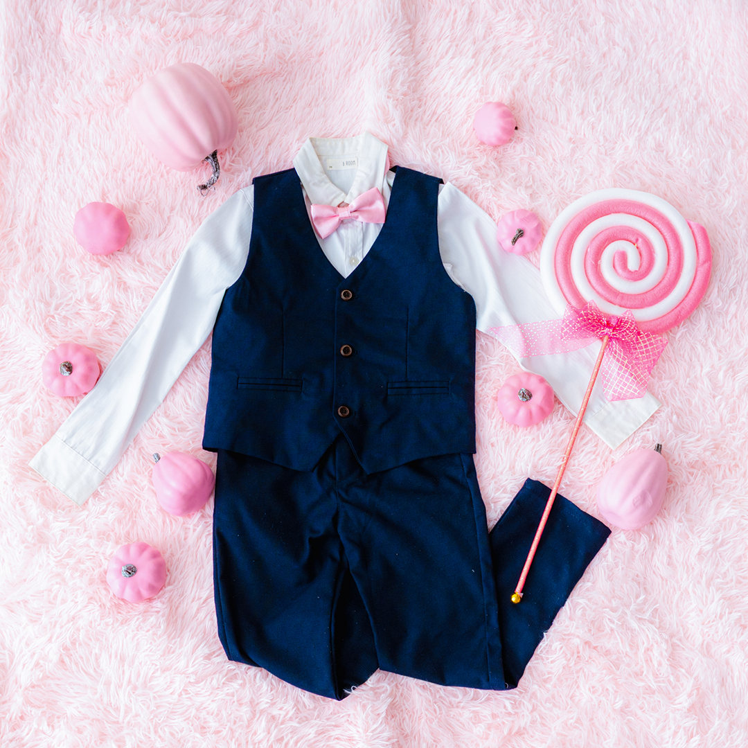 男の子にはピンクの蝶ネクタイが映えるクールなブラックフォーマルをご用意。