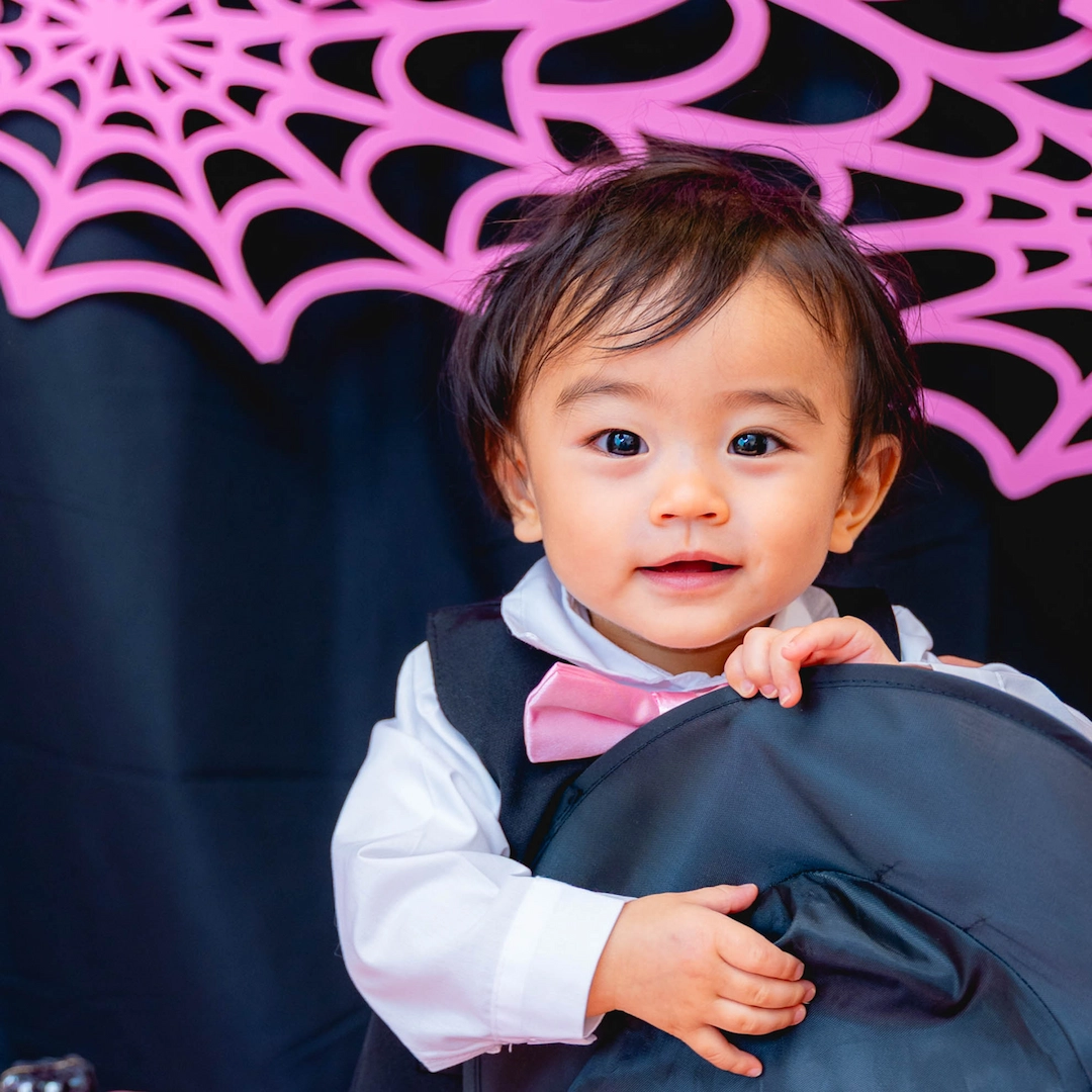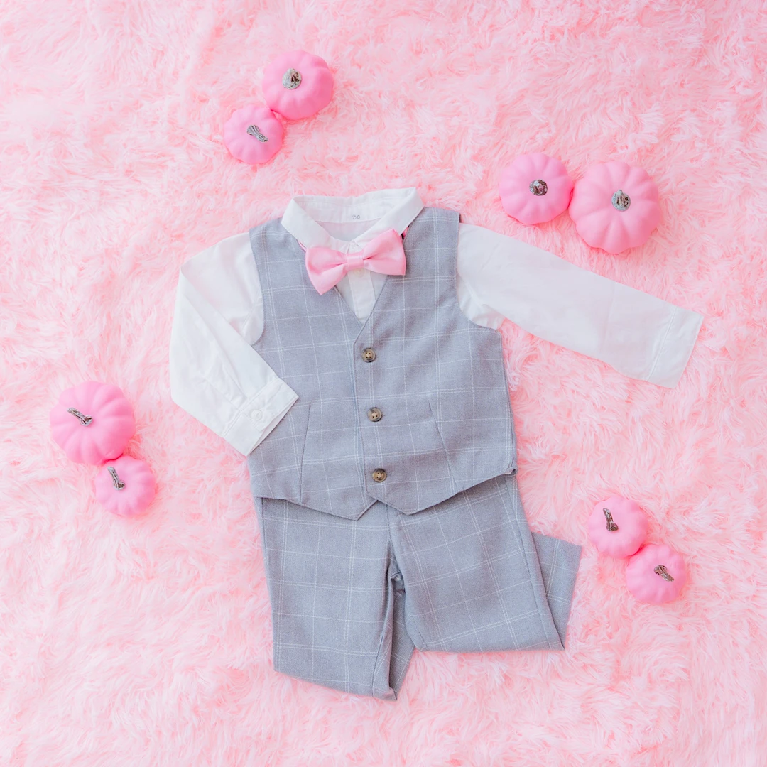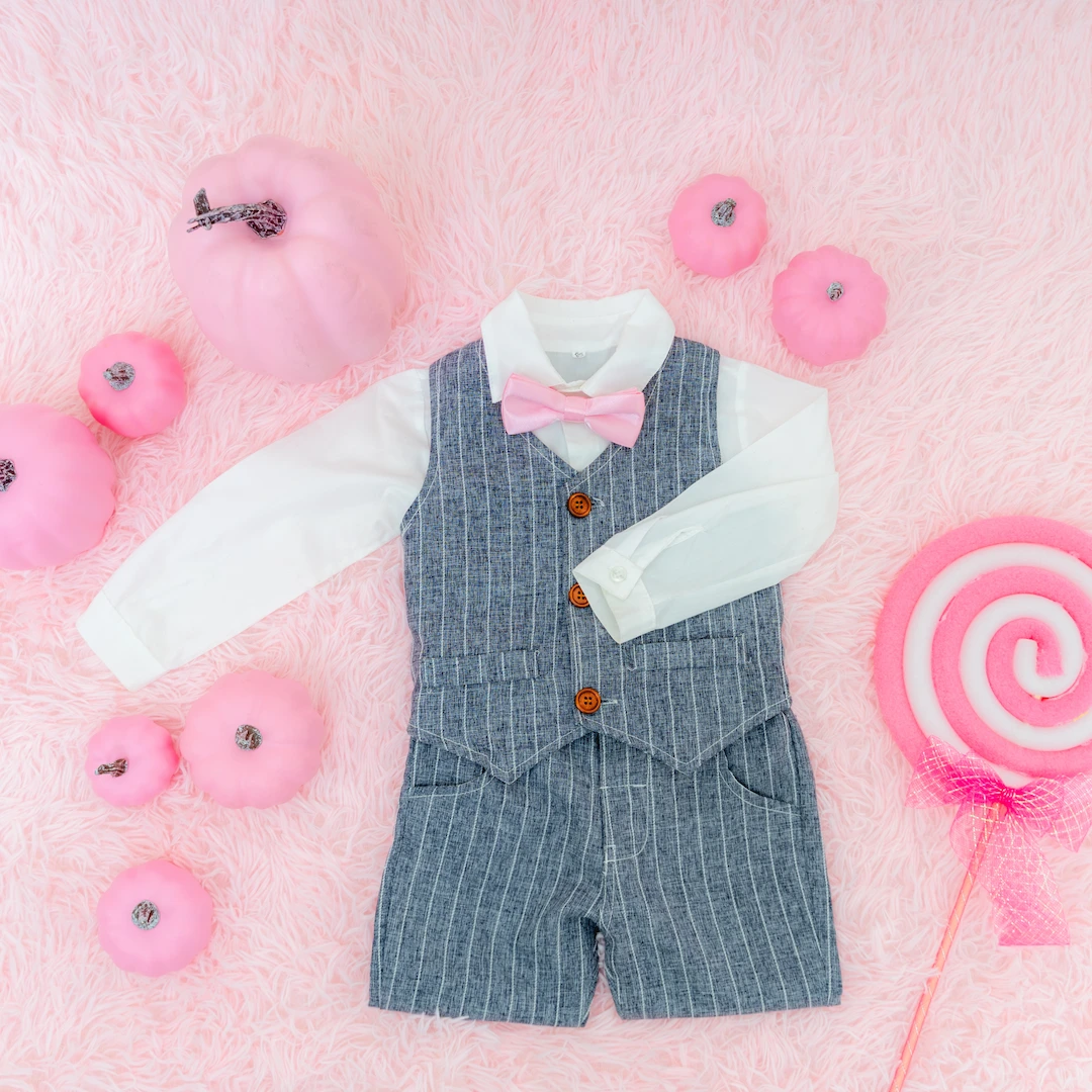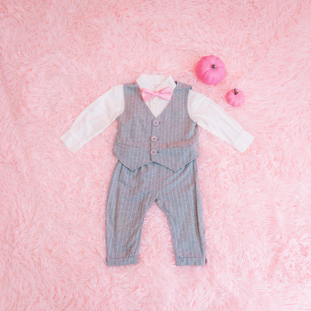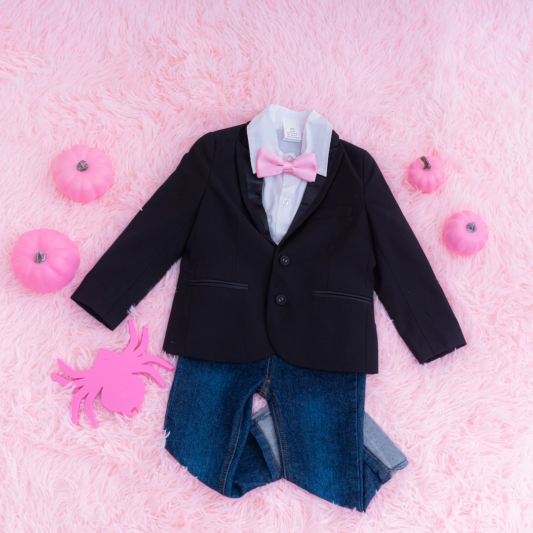 男の子にはピンクの蝶ネクタイが映えるクールなブラックフォーマルをご用意。