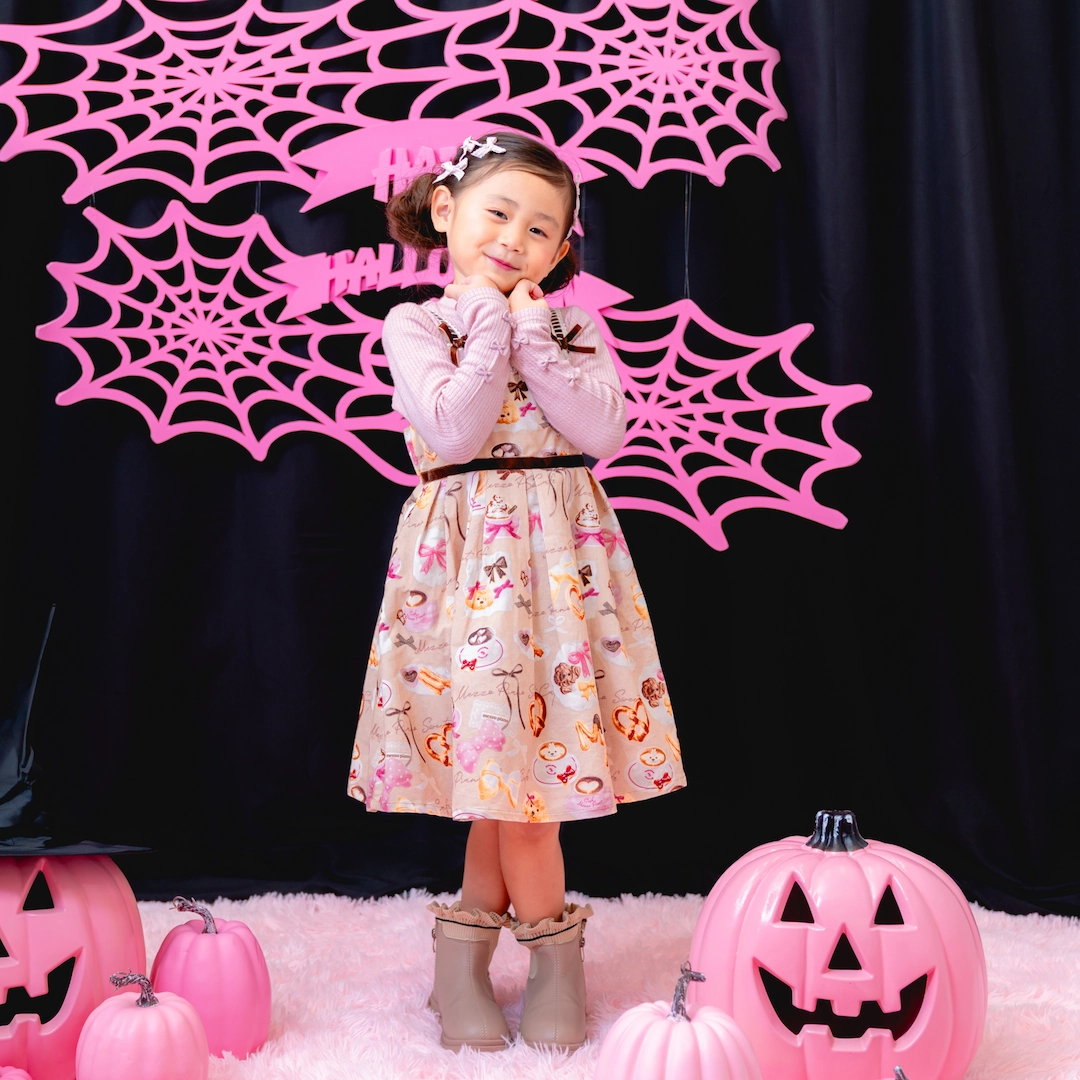女の子にはmezzo pianoの新作『cafe mezzo piano』の総柄ワンピースを、