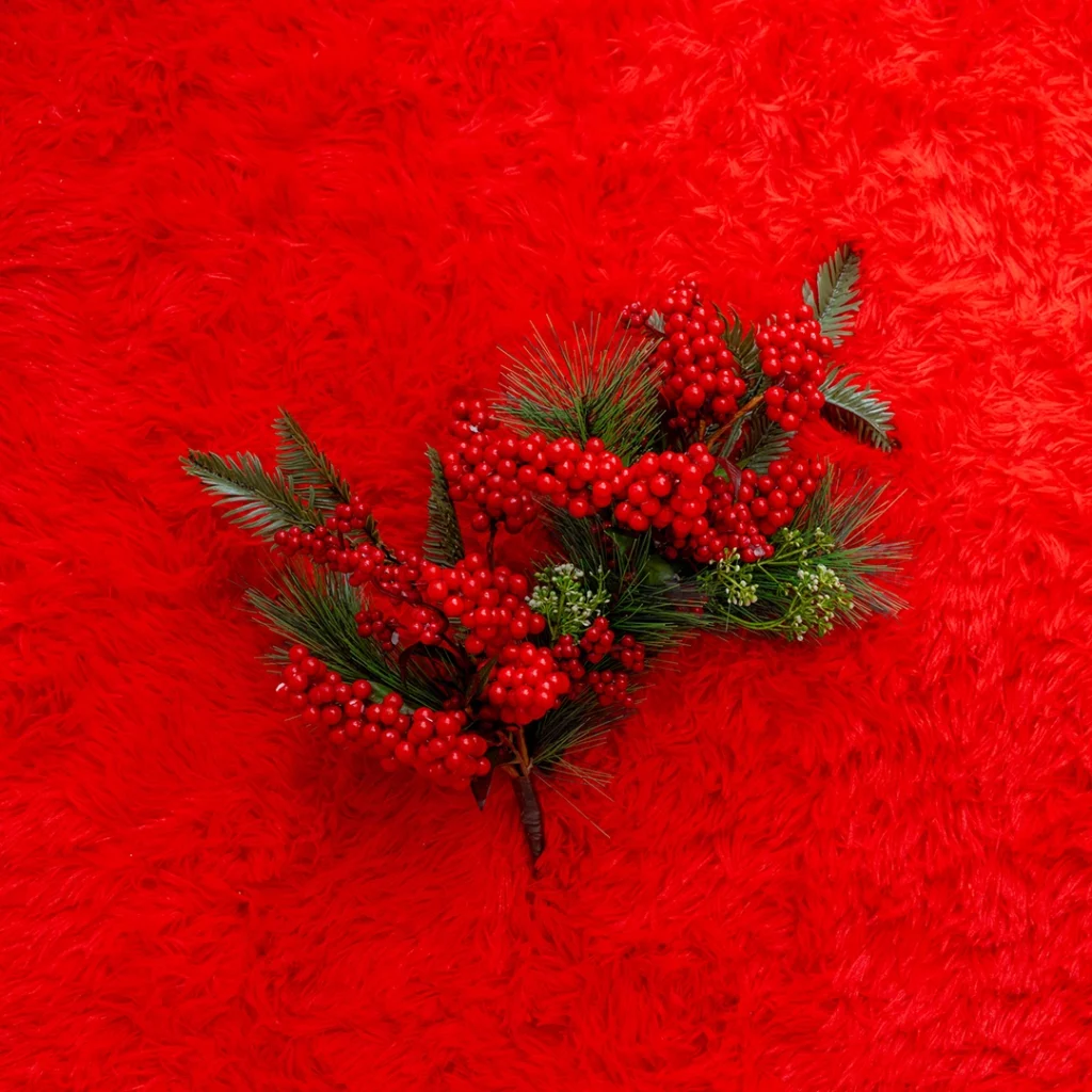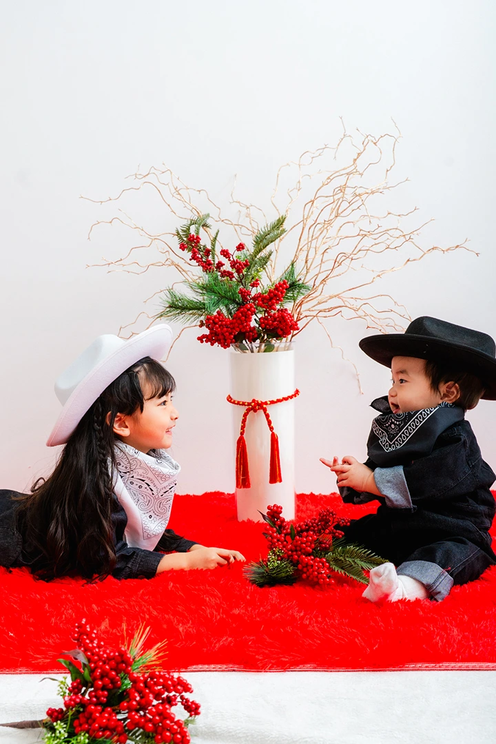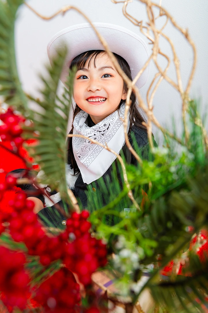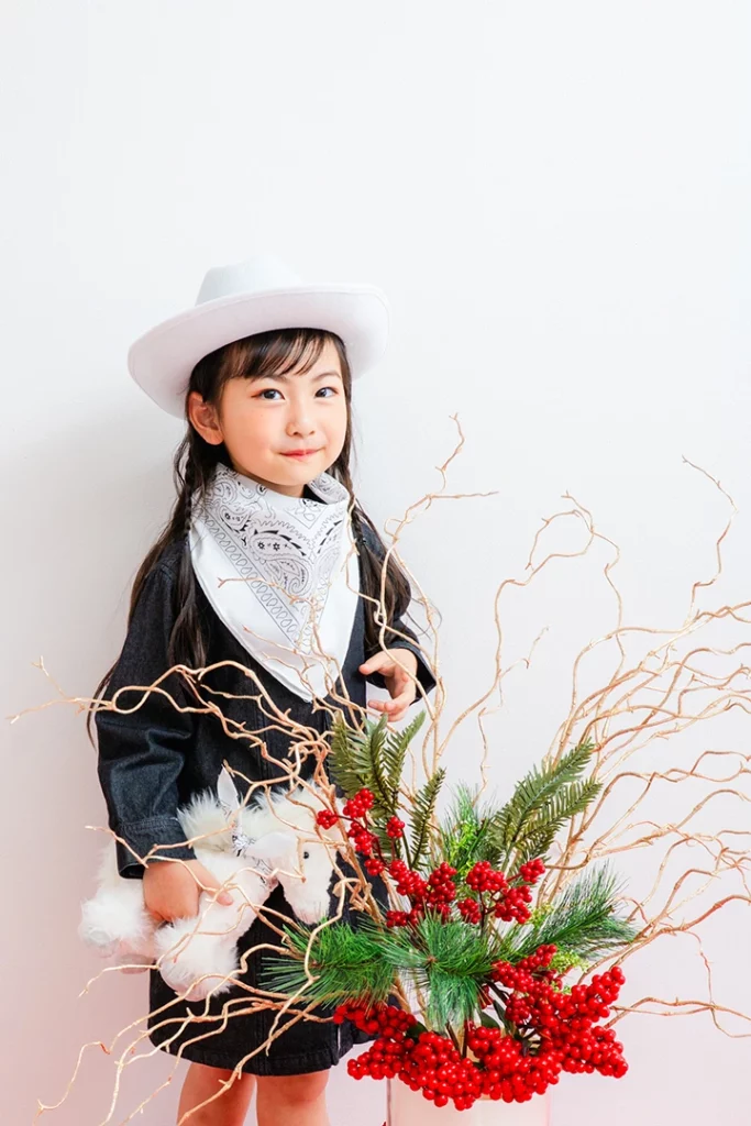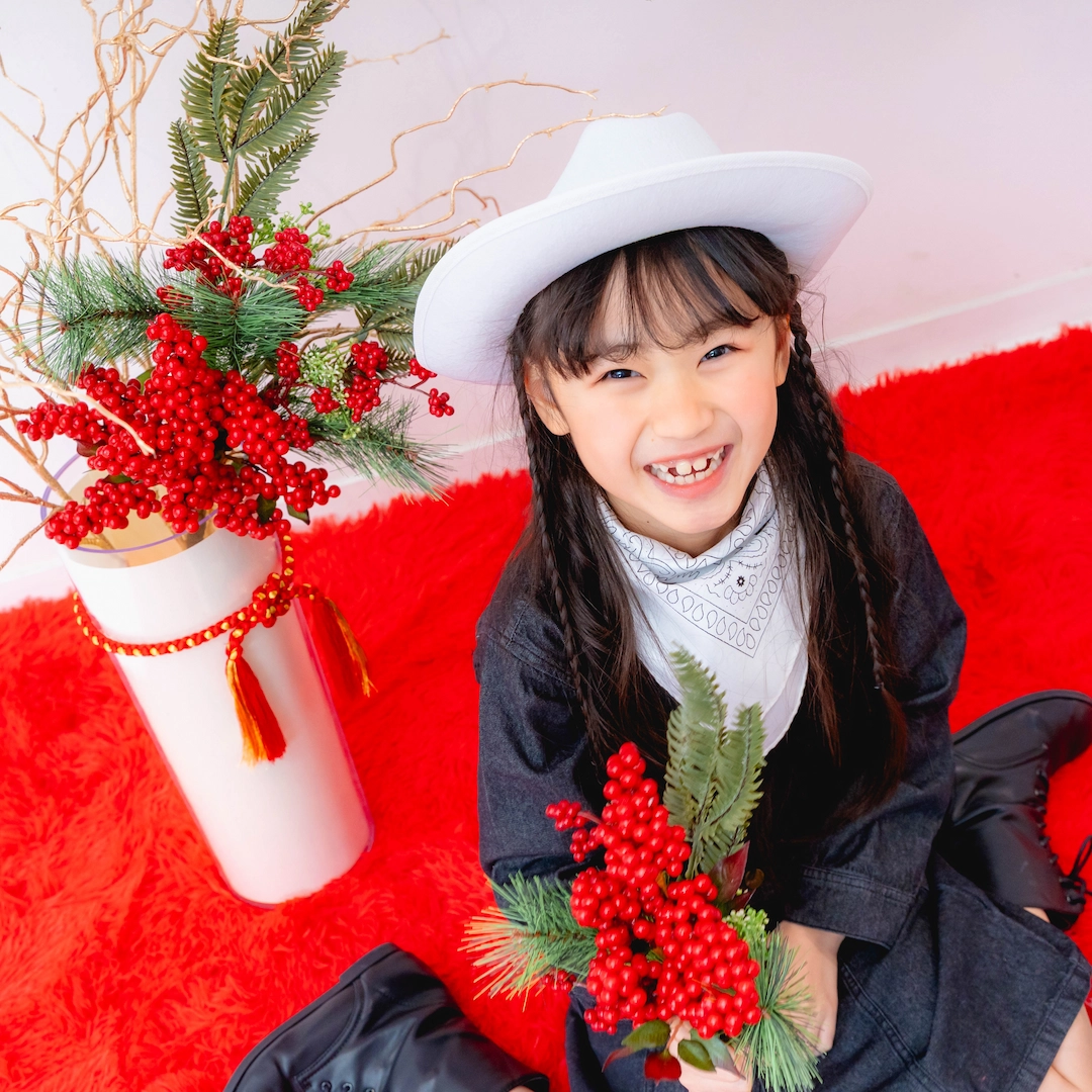撮影シーンは、南天・金の枝・紅白を基調にした華やかな背景。