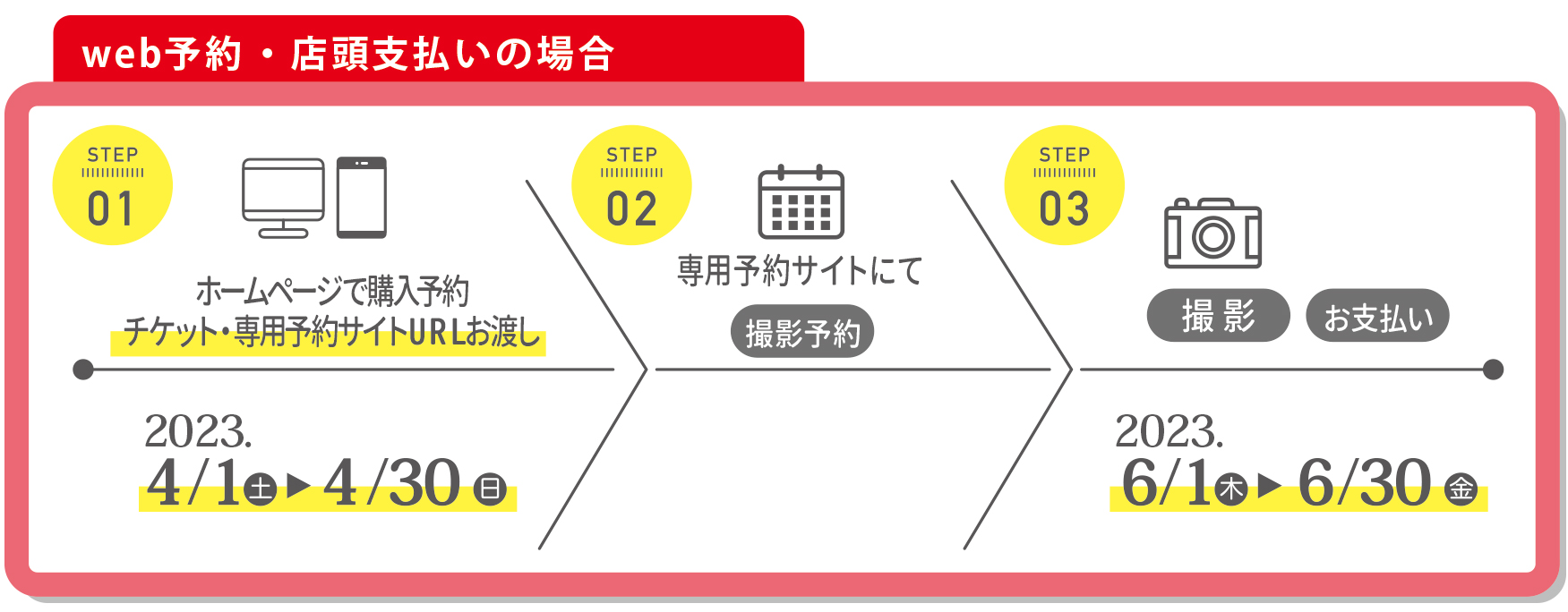 撮影予約方法につきましては、撮影チケットをご確認ください。