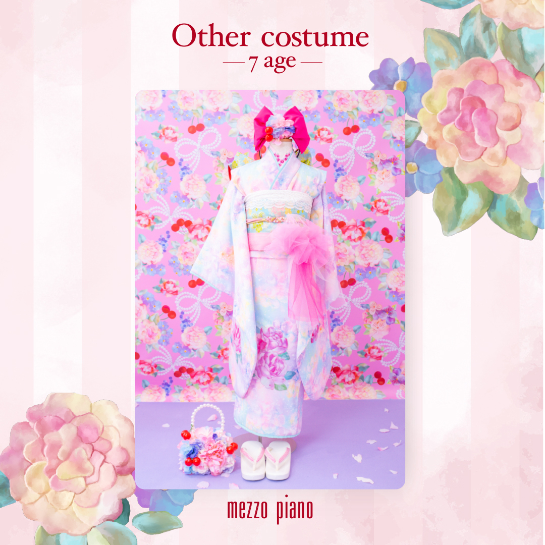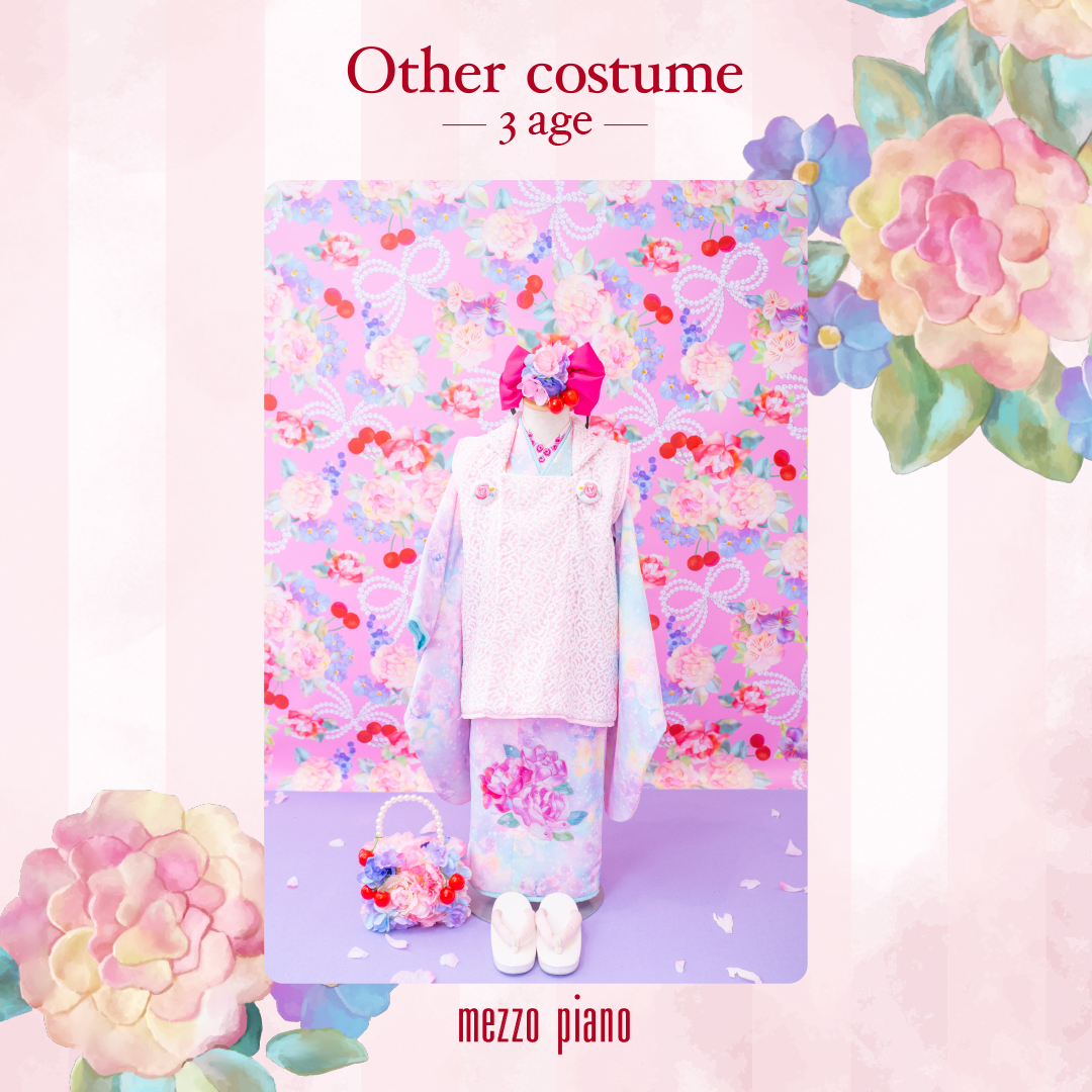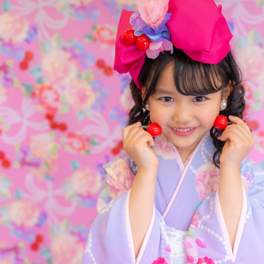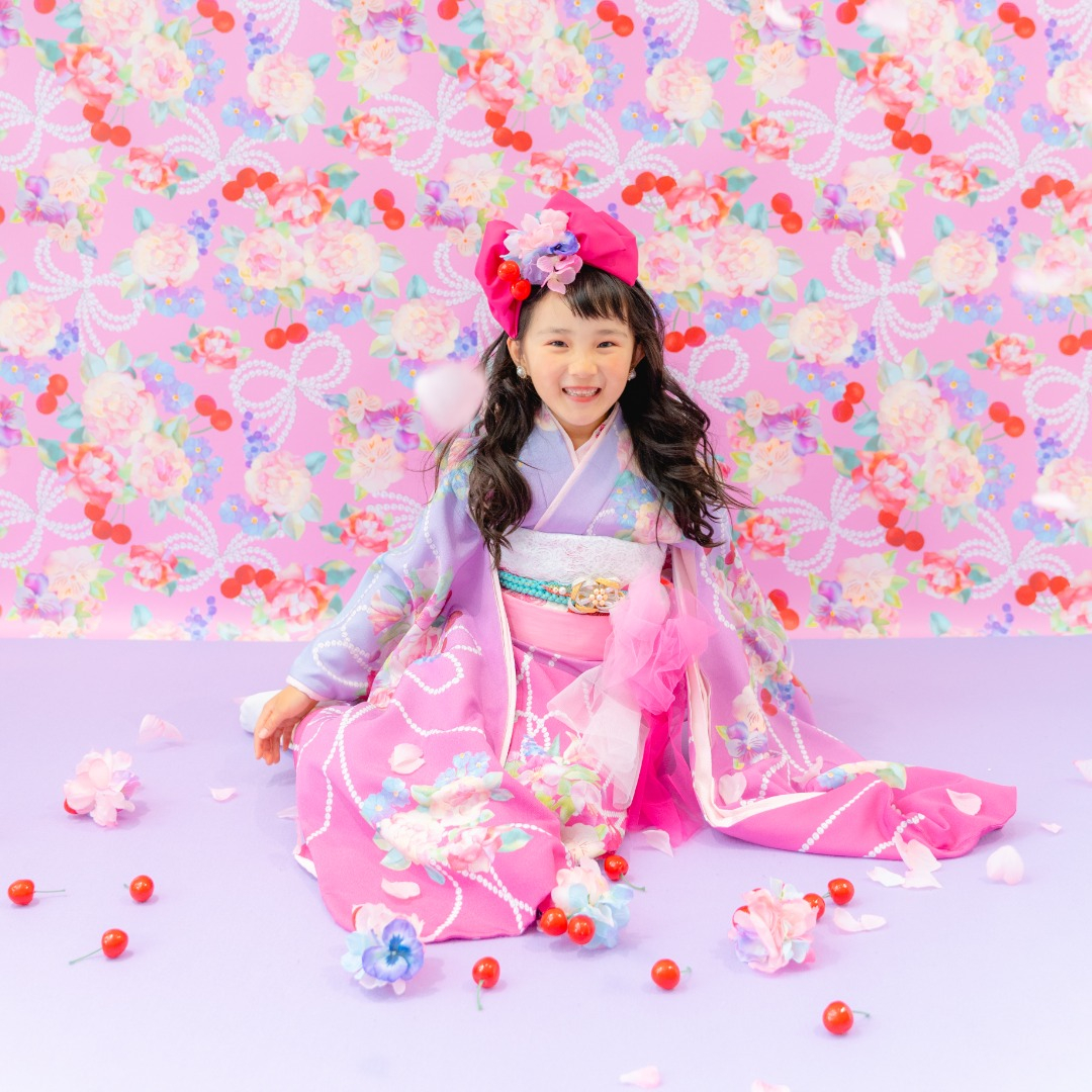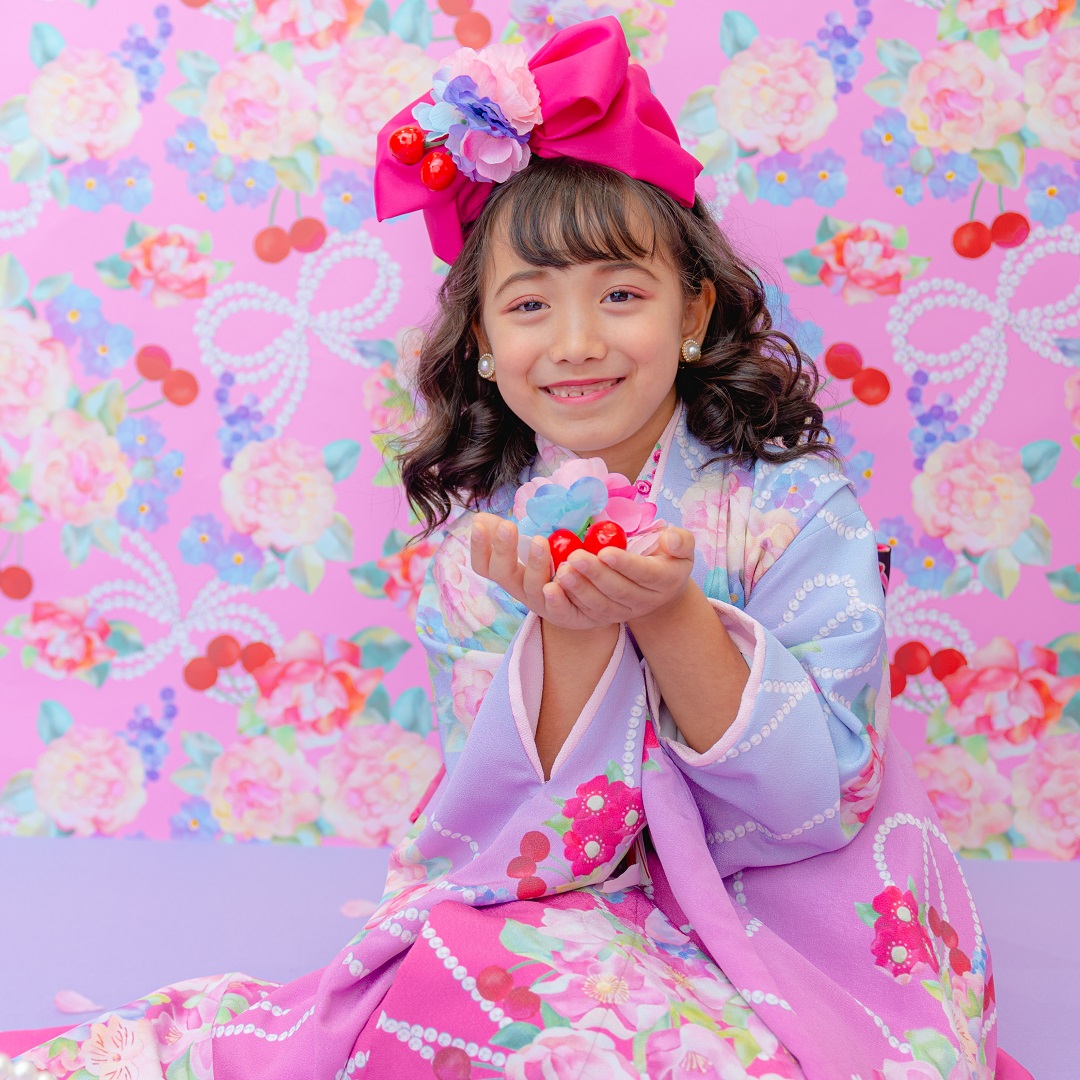 3歳モデルが着用しているメゾ ピアノ着物 チェリーローズ(衣装番号63001)および7歳モデルが着用しているメゾ ピアノ着物 レトロパールロゼ(衣装番号63003)は、開催中の全店舗で着用可能です。