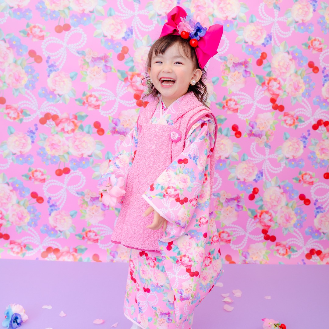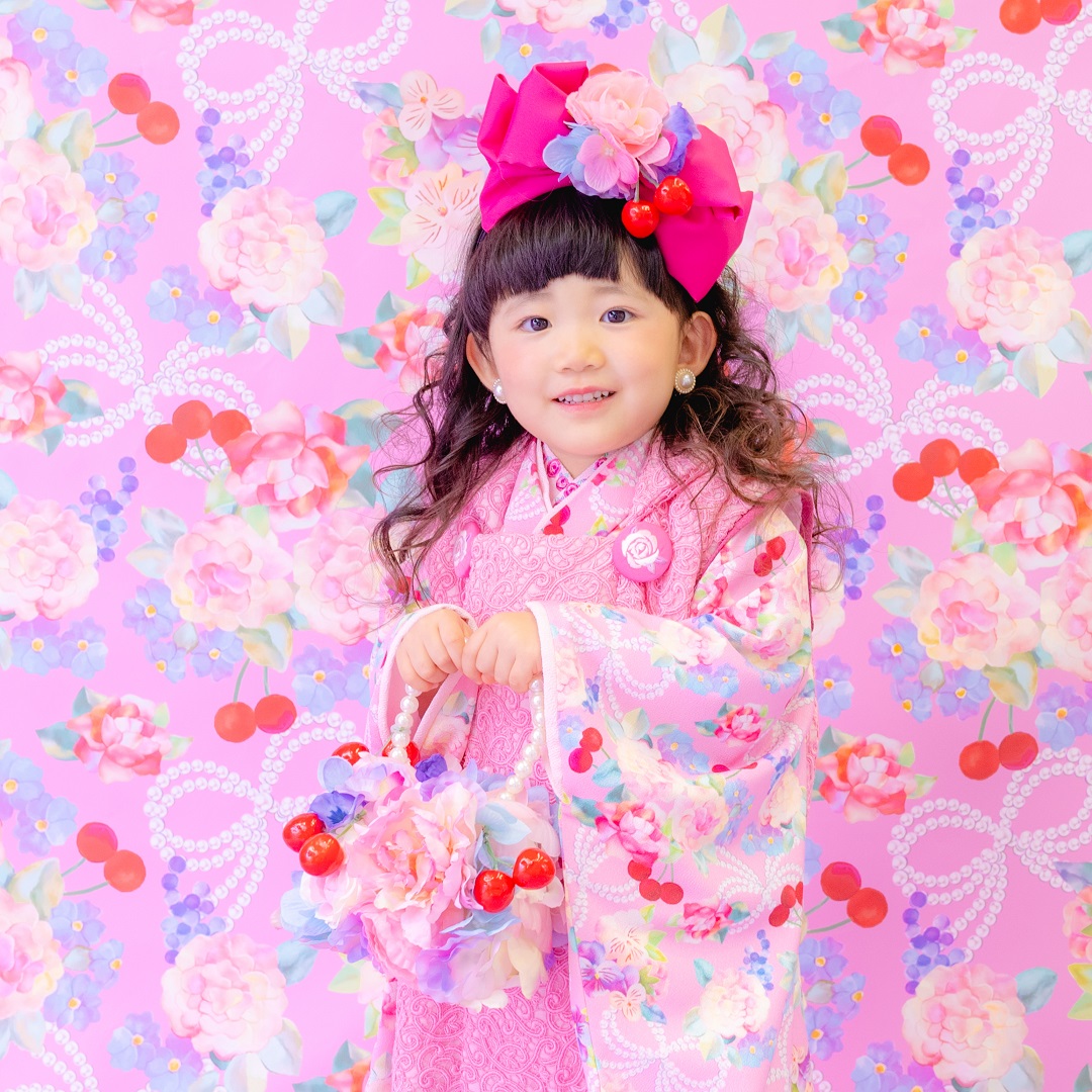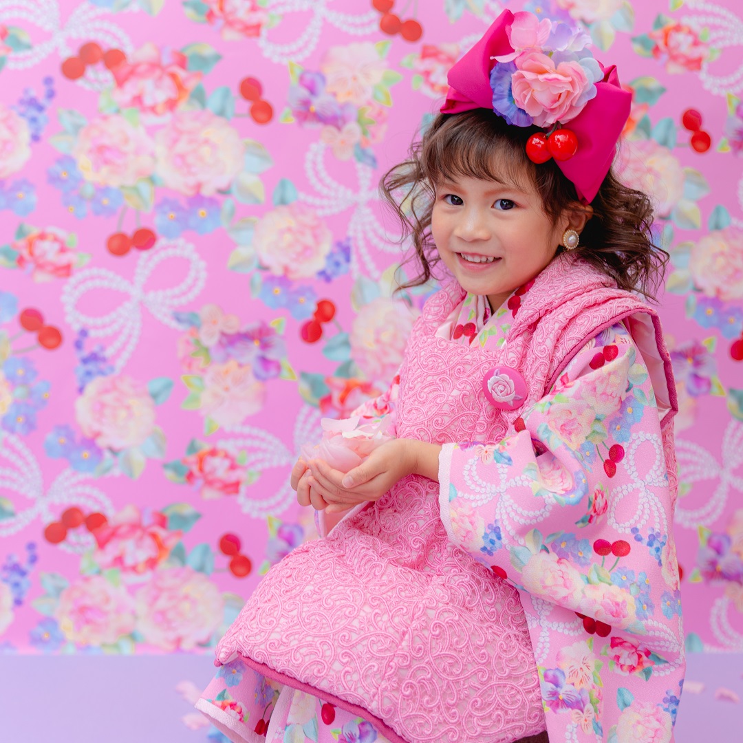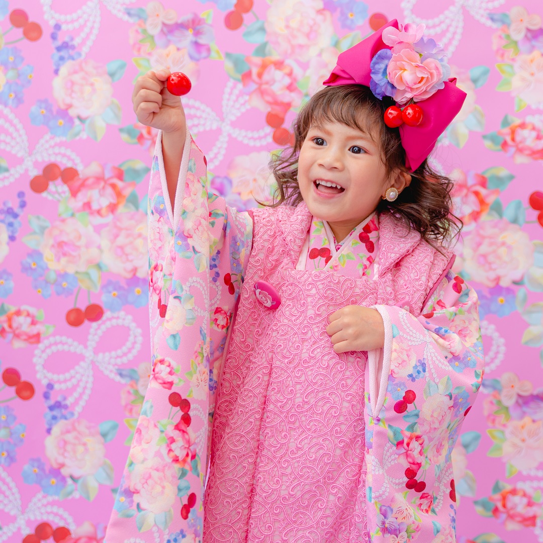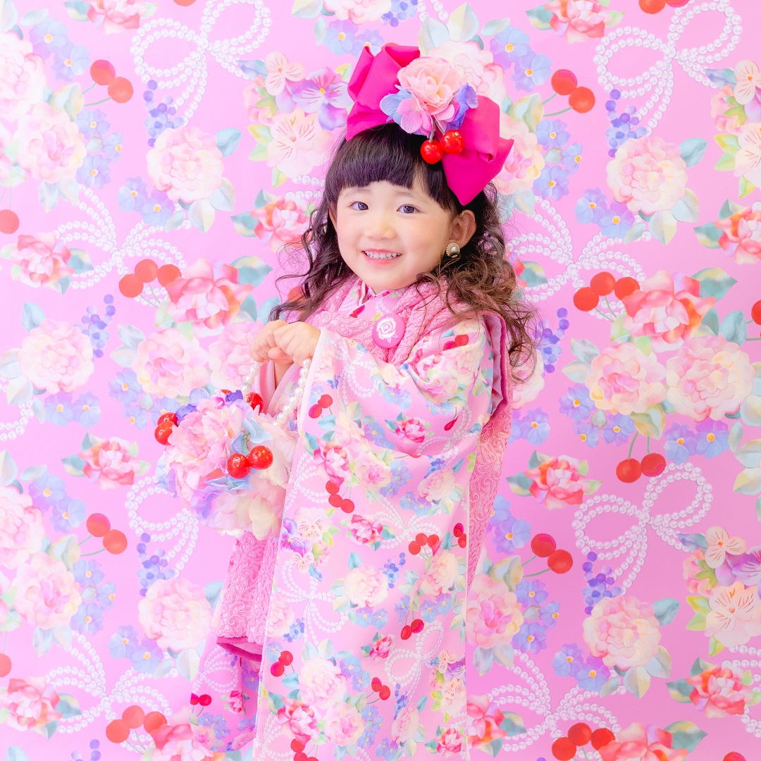 3歳の着物は、チェリー・ローズ・パールリボンが