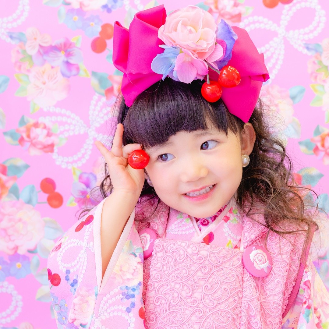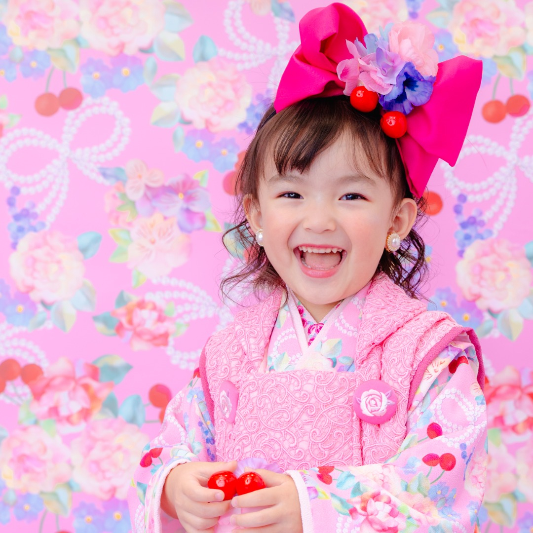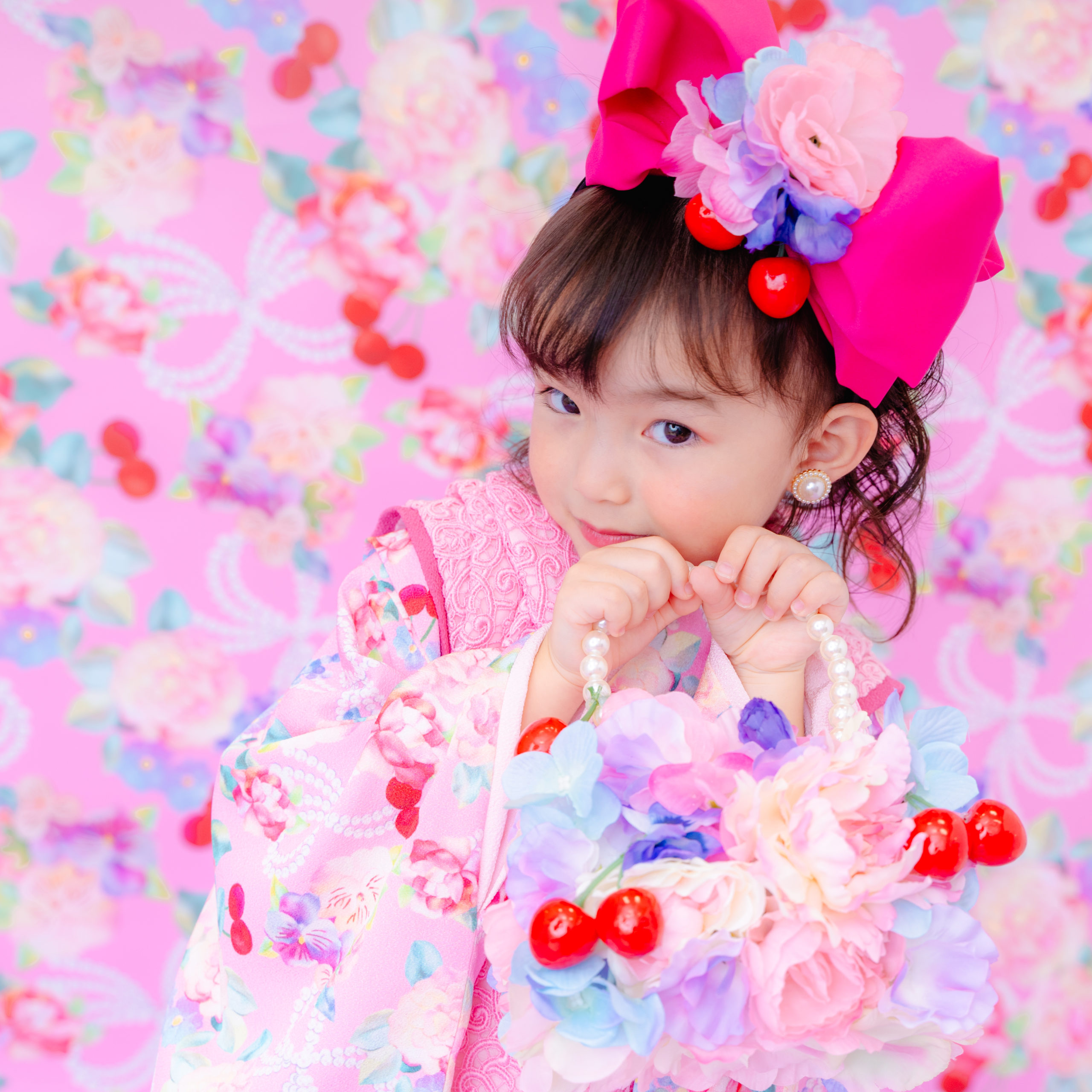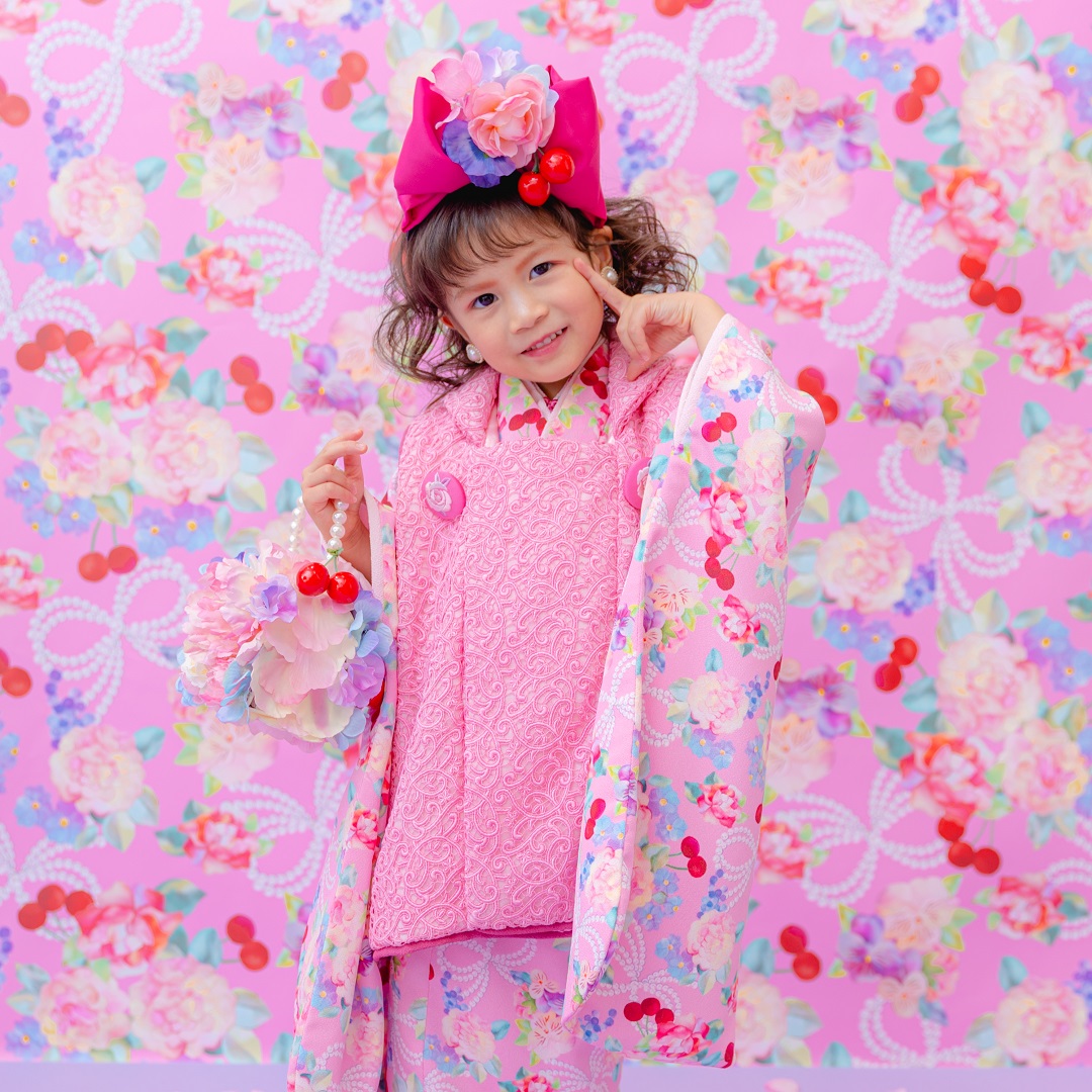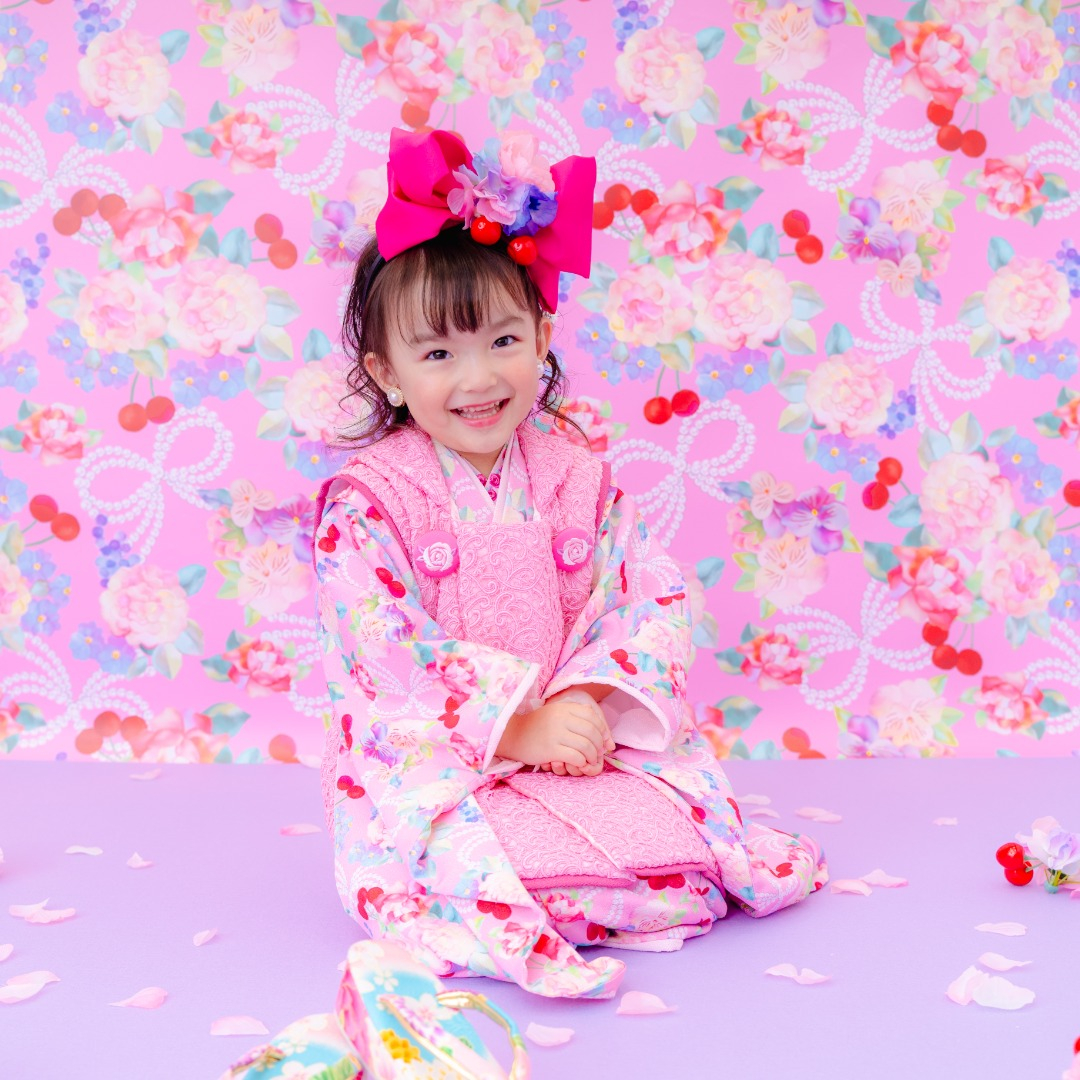 3歳の着物は、チェリー・ローズ・パールリボンが