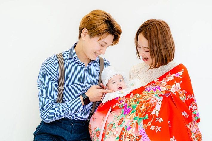 かけ着や、ベビー用和風ロンパース、ベビー被布や袴なども、スタジオ撮影用衣装として、無料でレンタルできます。