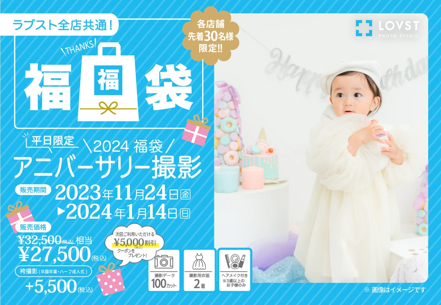 見学会特典 割引き、アクリルフォトSサイズのサービスは2024福袋 アニバーサリー撮影をご利用の場合は受けることができません。