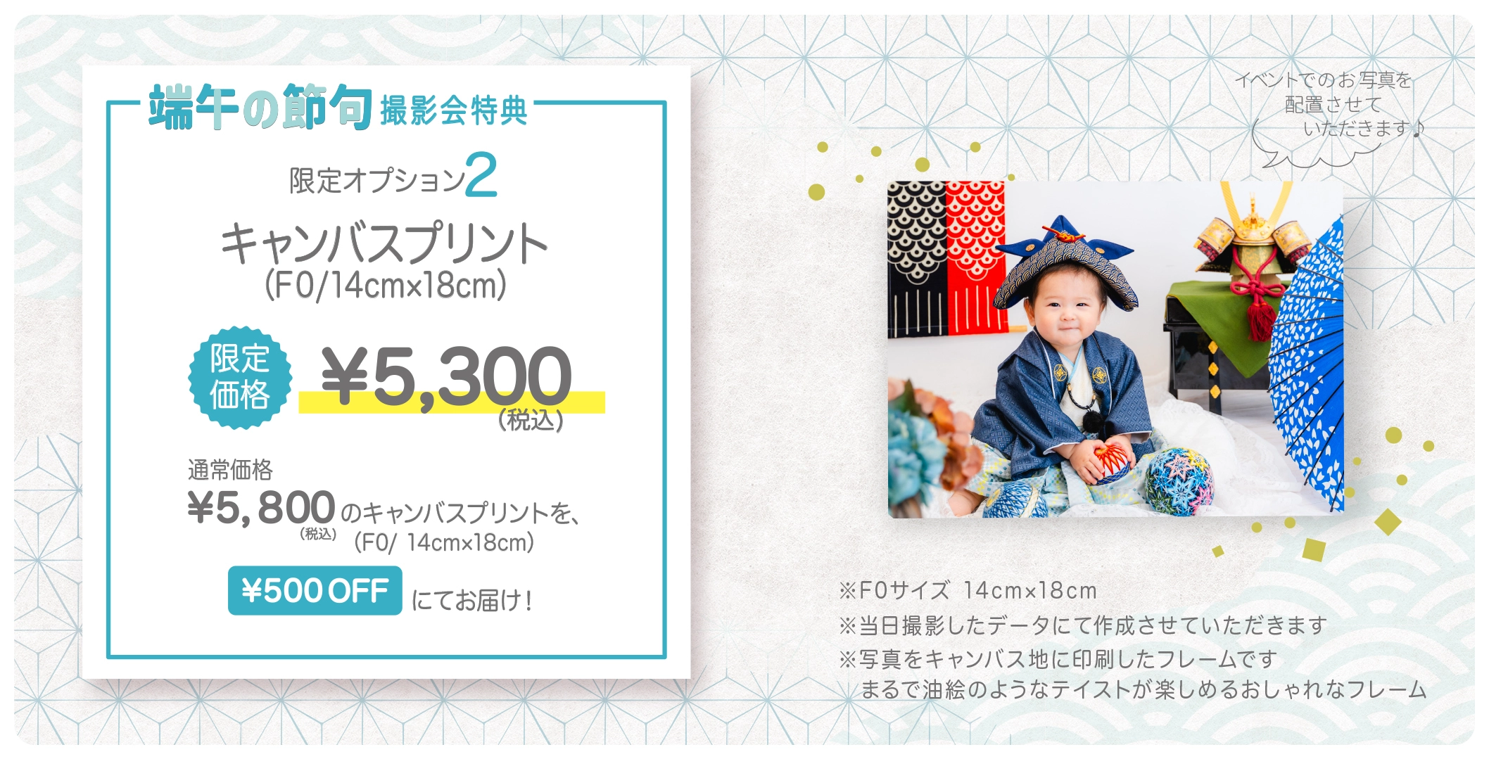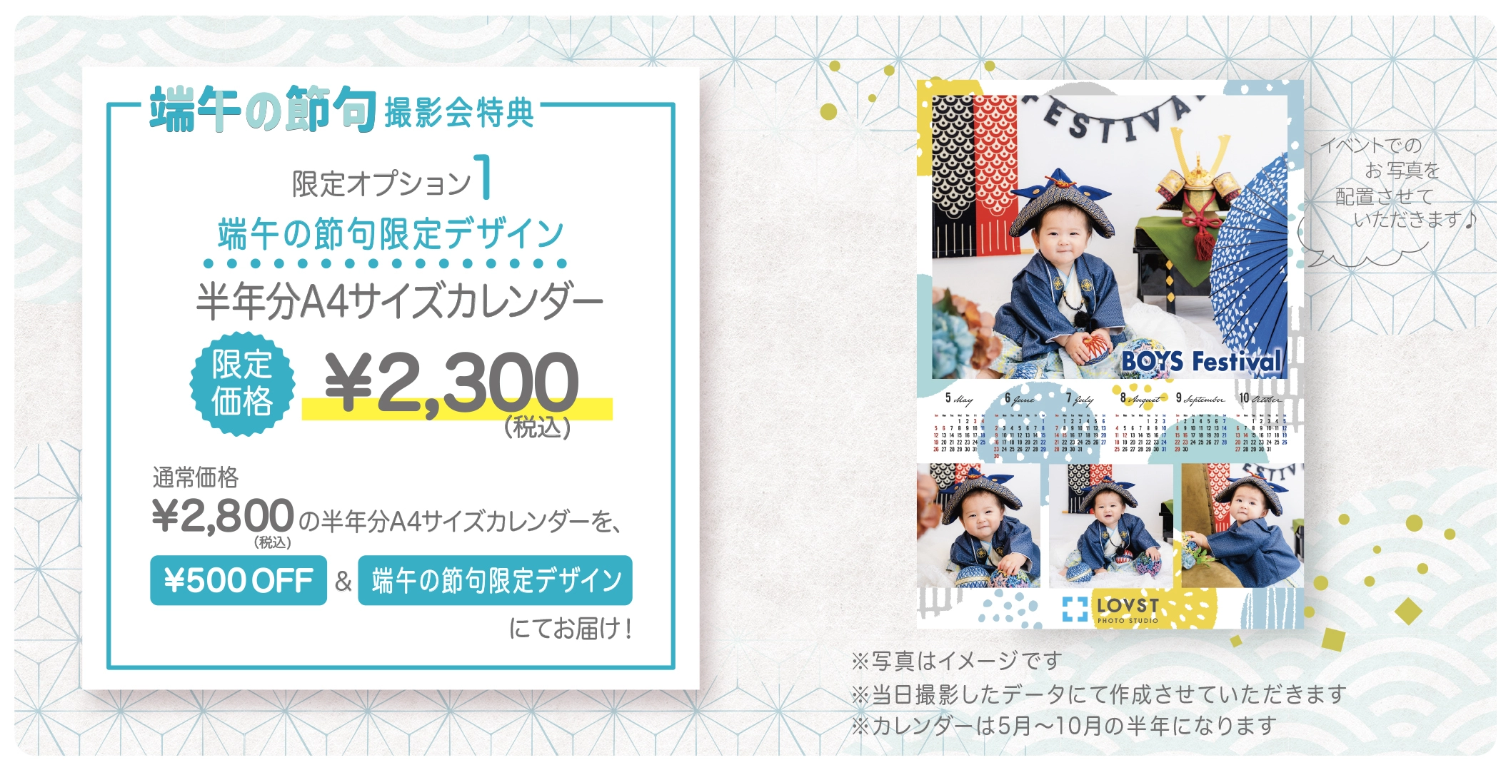 ※通常¥2,800(税込)の半年分A4サイズカレンダーを、¥500 OFF&端午の節句撮影会オリジナルデザインにてお届け!