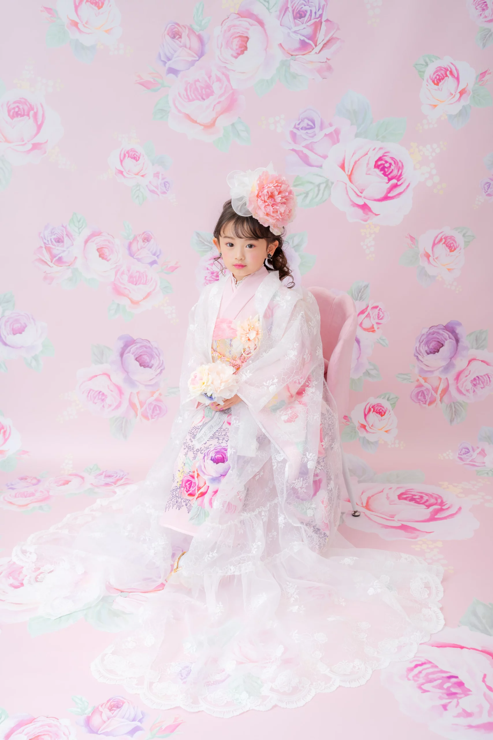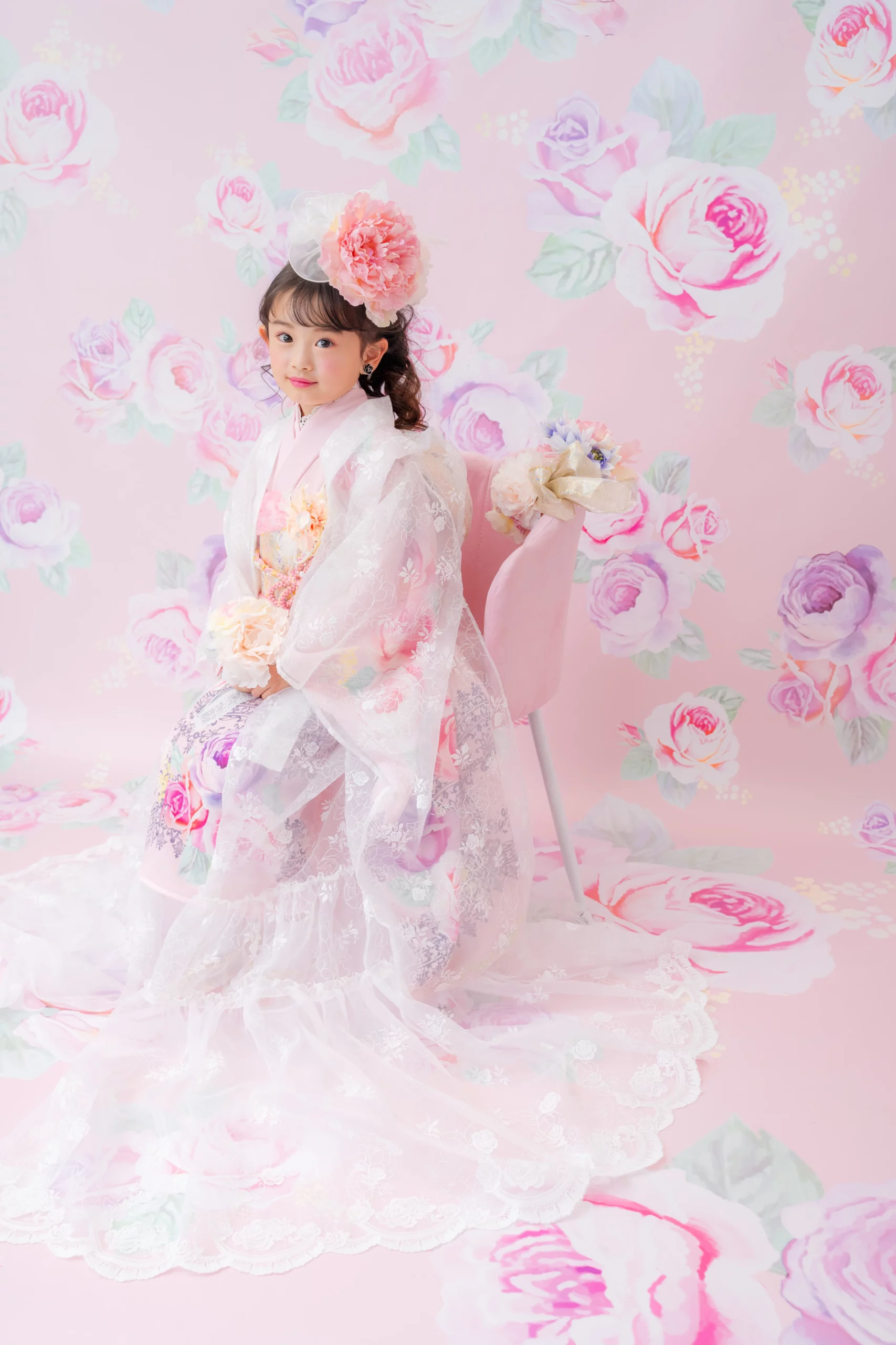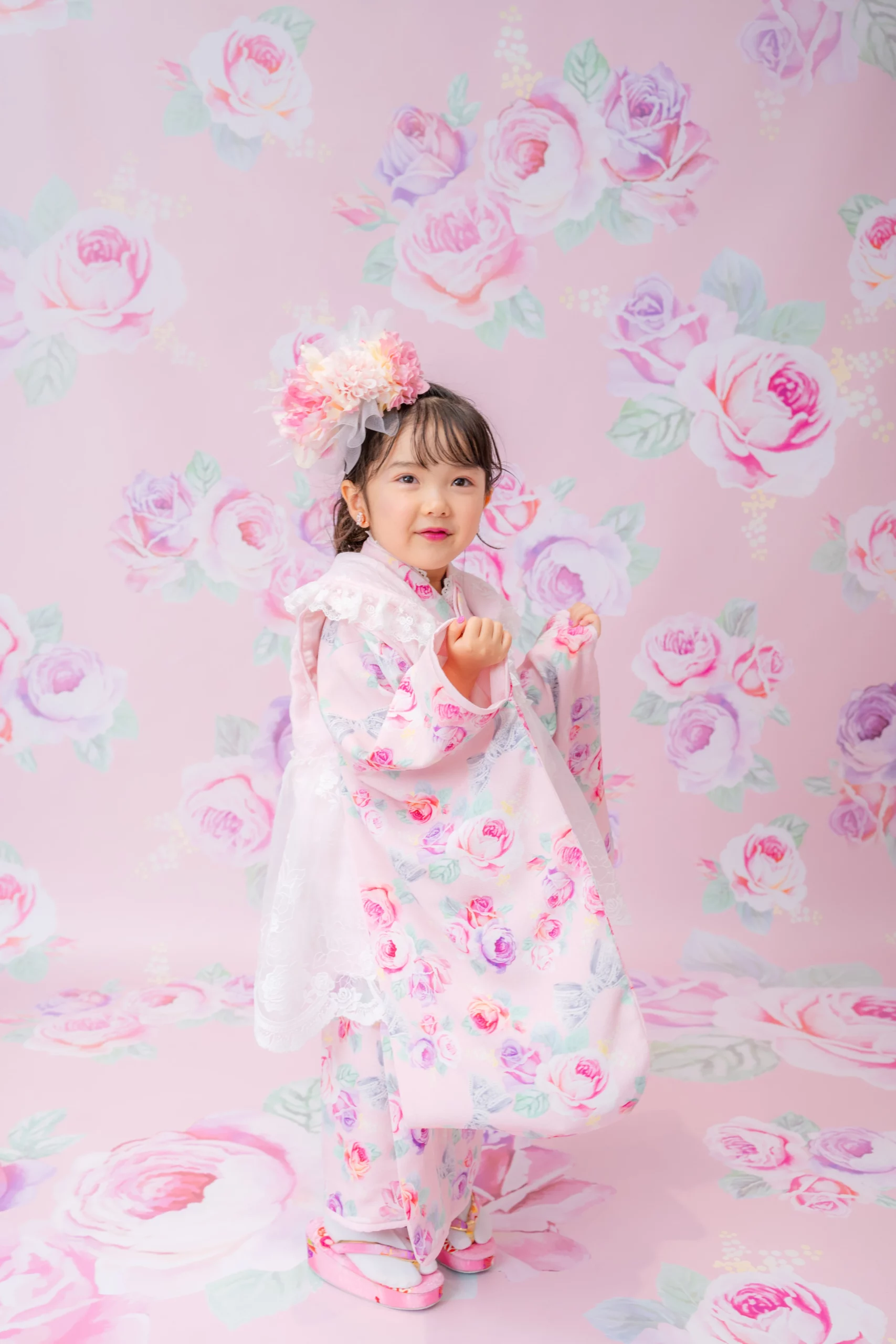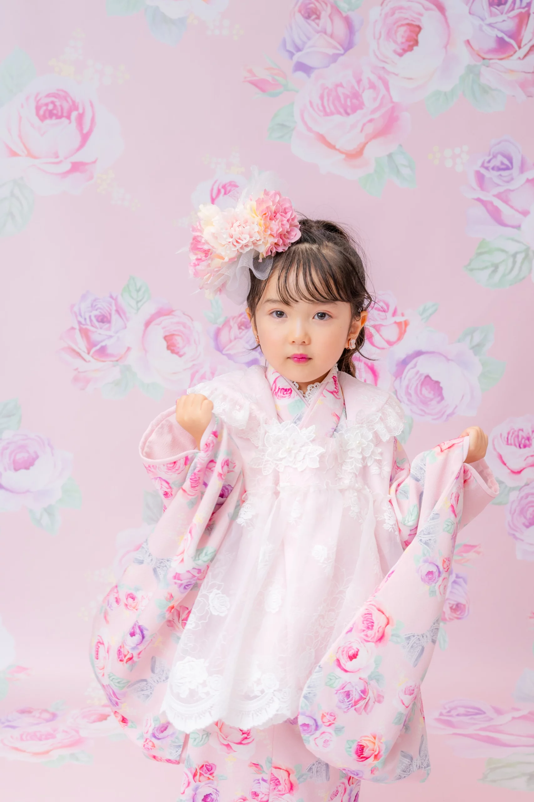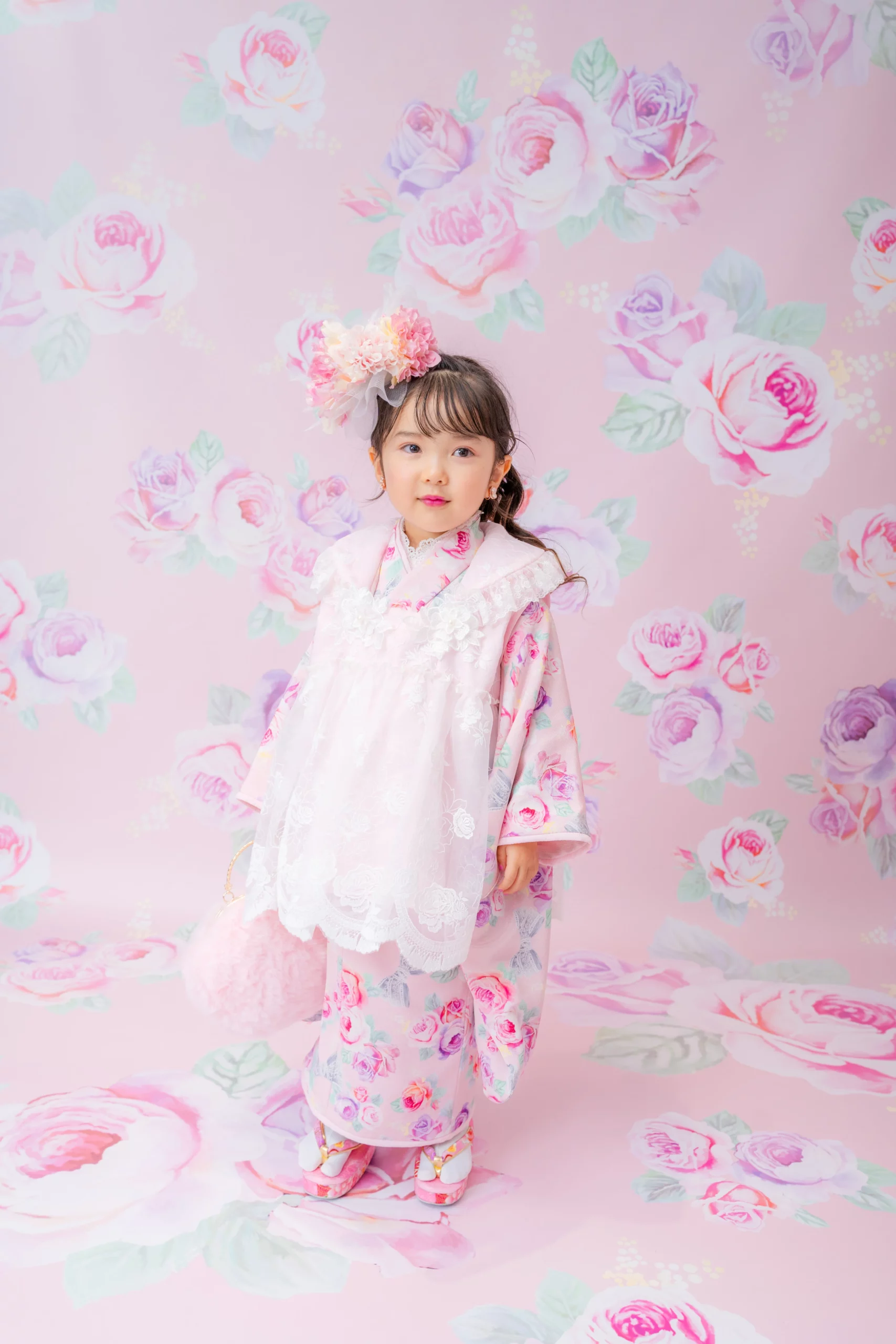 7歳の装いは、メゾ ピアノを象徴する花「薔薇」を