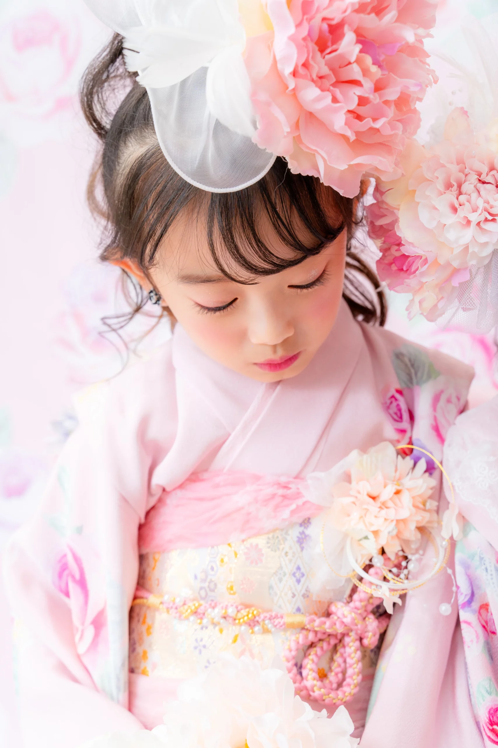 3歳の装いは、優しいペールピンク地に