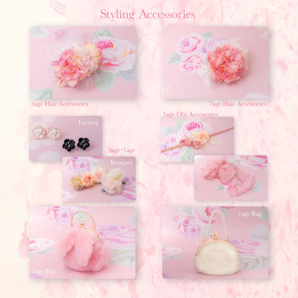 申し訳ございません。季節の七五三「mezzo piano “Lacey perfume”」スタイリング専用小物・アクセサリー以外の小物やアクセサリーの着用はできません。