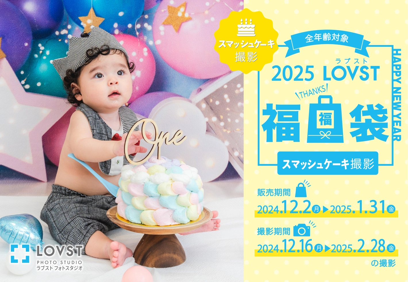 本キャンペーンのご利用撮影期間【2024年12月2日(月)~2025年2月28日(金)】(※スマッシュケーキ撮影は2024年12月16日(月)~2025年2月28日(金))の間で日程変更可能です。日程変更前のご予約に関する、ご予約者様のお名前・撮影日時・撮影店舗をLOVSTカスタマーサポートにご連絡ください。但し、スマッシュケーキ撮影については、ケーキのキャンセル料金(税込7,700円)が発生する場合がございますので、日程変更後のご予約予定日を合わせてご連絡ください。